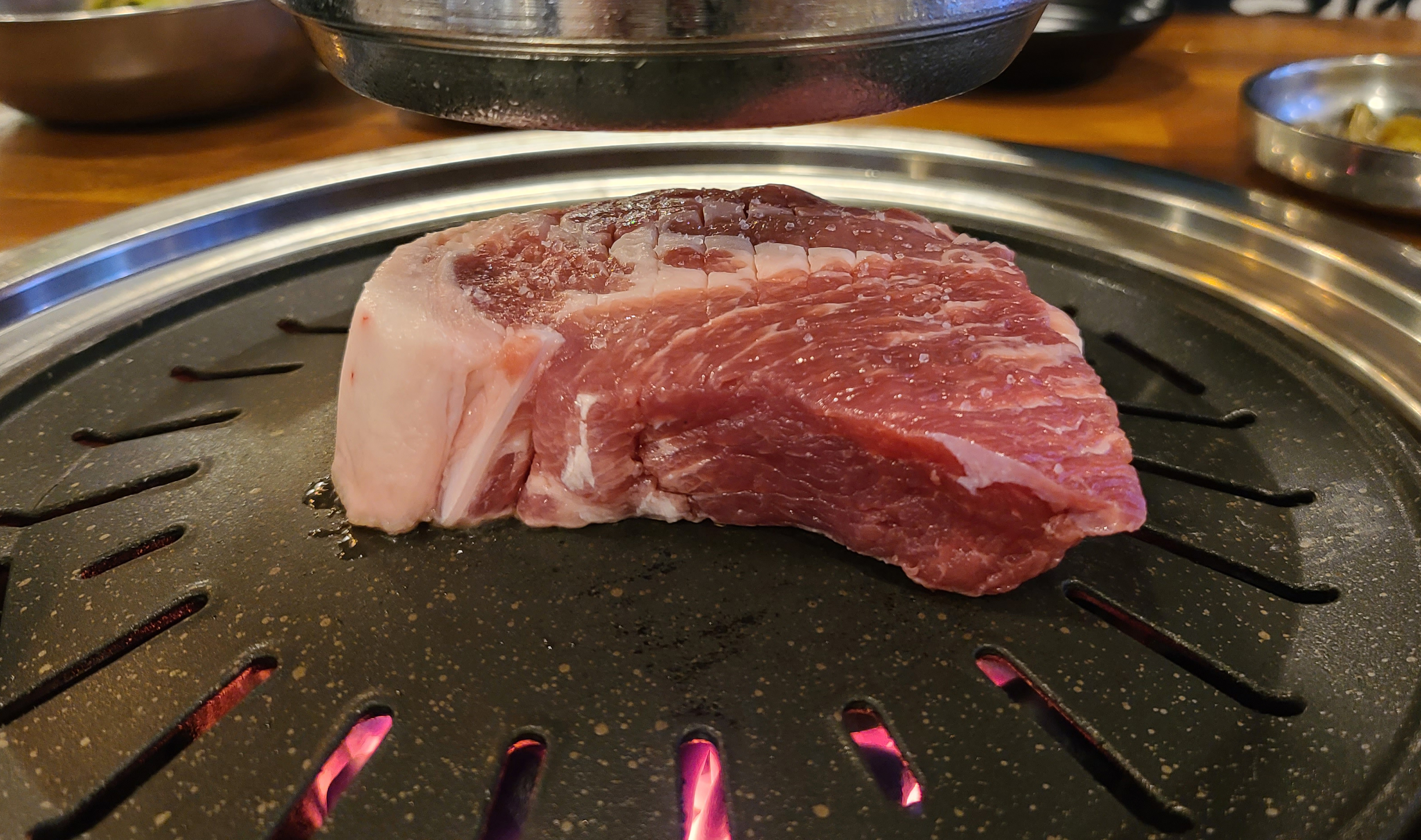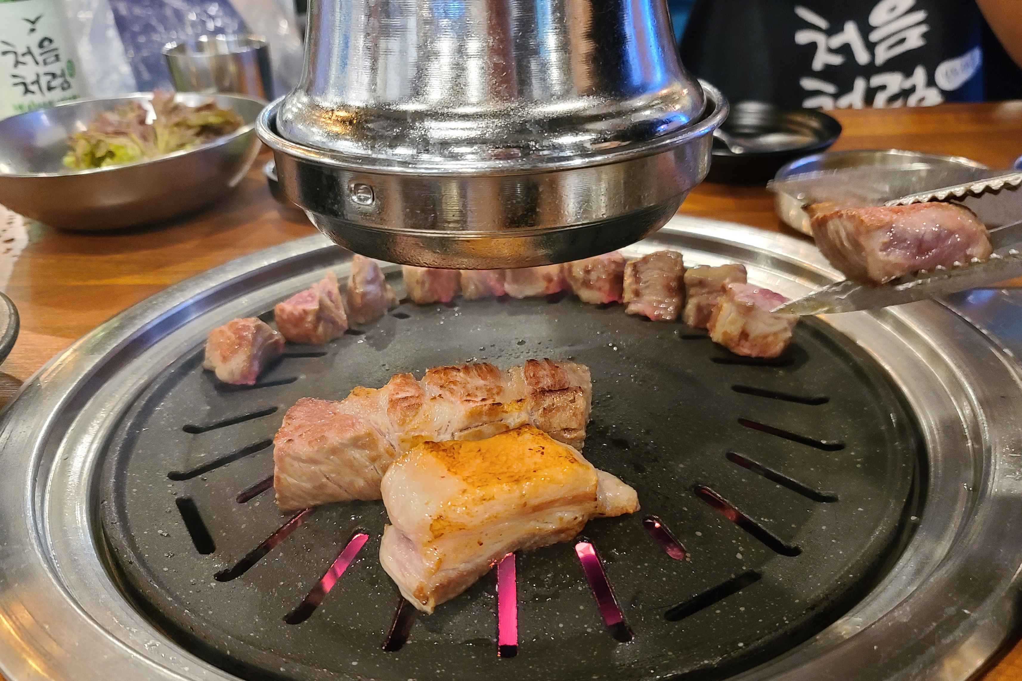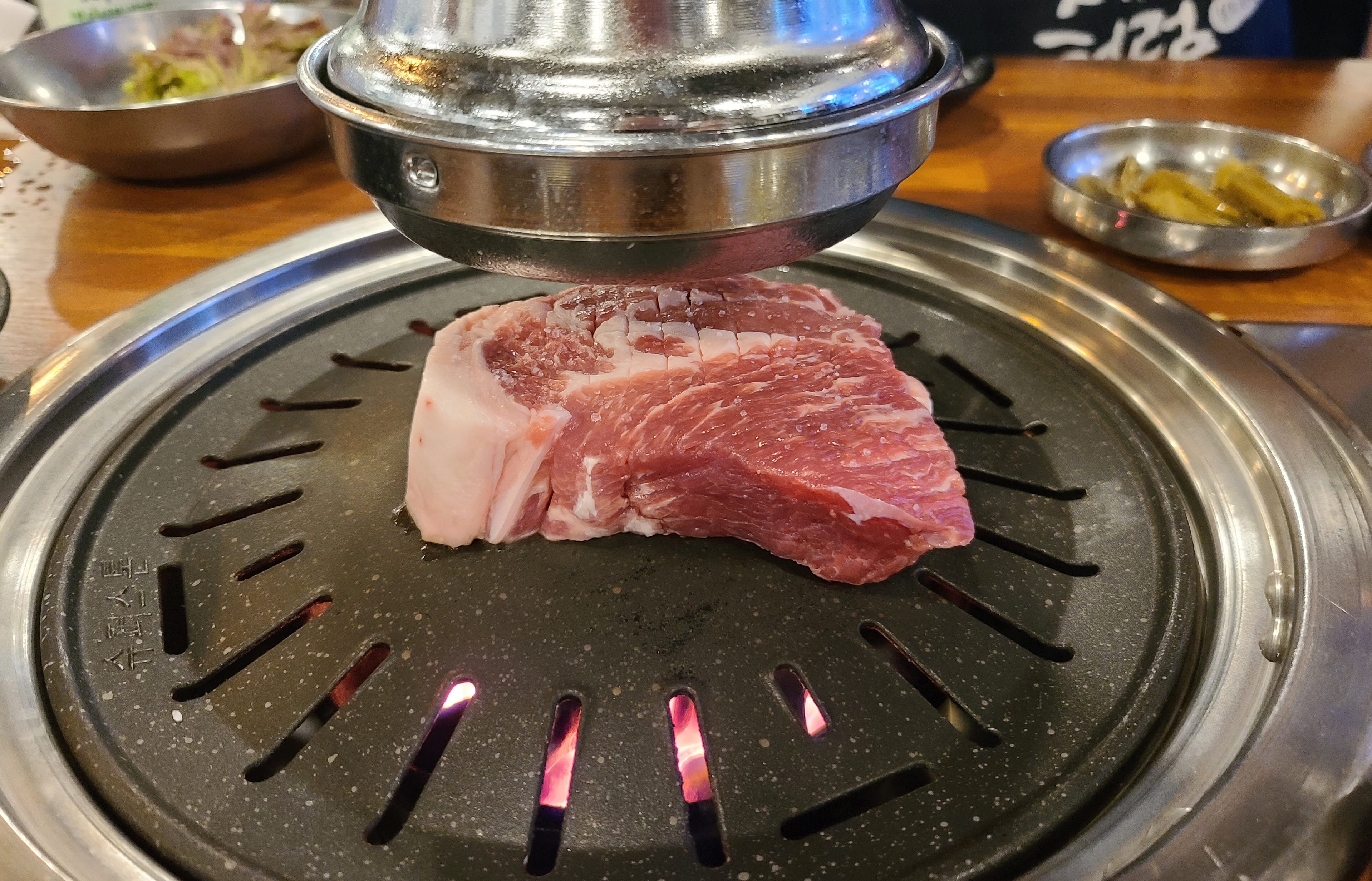 평소 같으면 고기를 제가 직접 구웠을 텐데, 화포식당은 가게 직원이 직접 불판의 온도를 체크한 뒤, 직접 고기를 구워주기 시작했습니다. 통목살이라 그런지 고기가 꽤 두툼하게 썰어져 나온 게 많이 먹음직스러워 보였습니다.