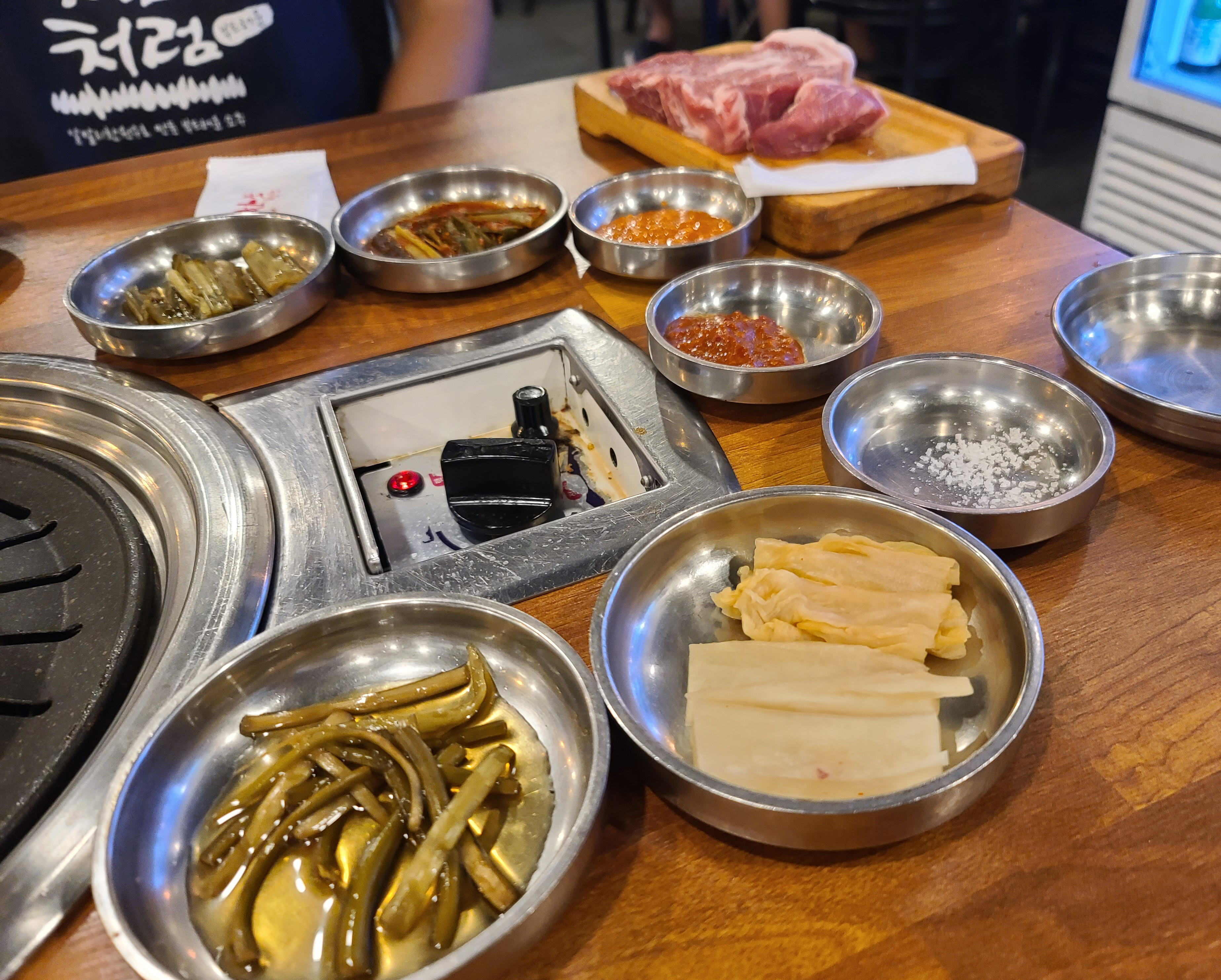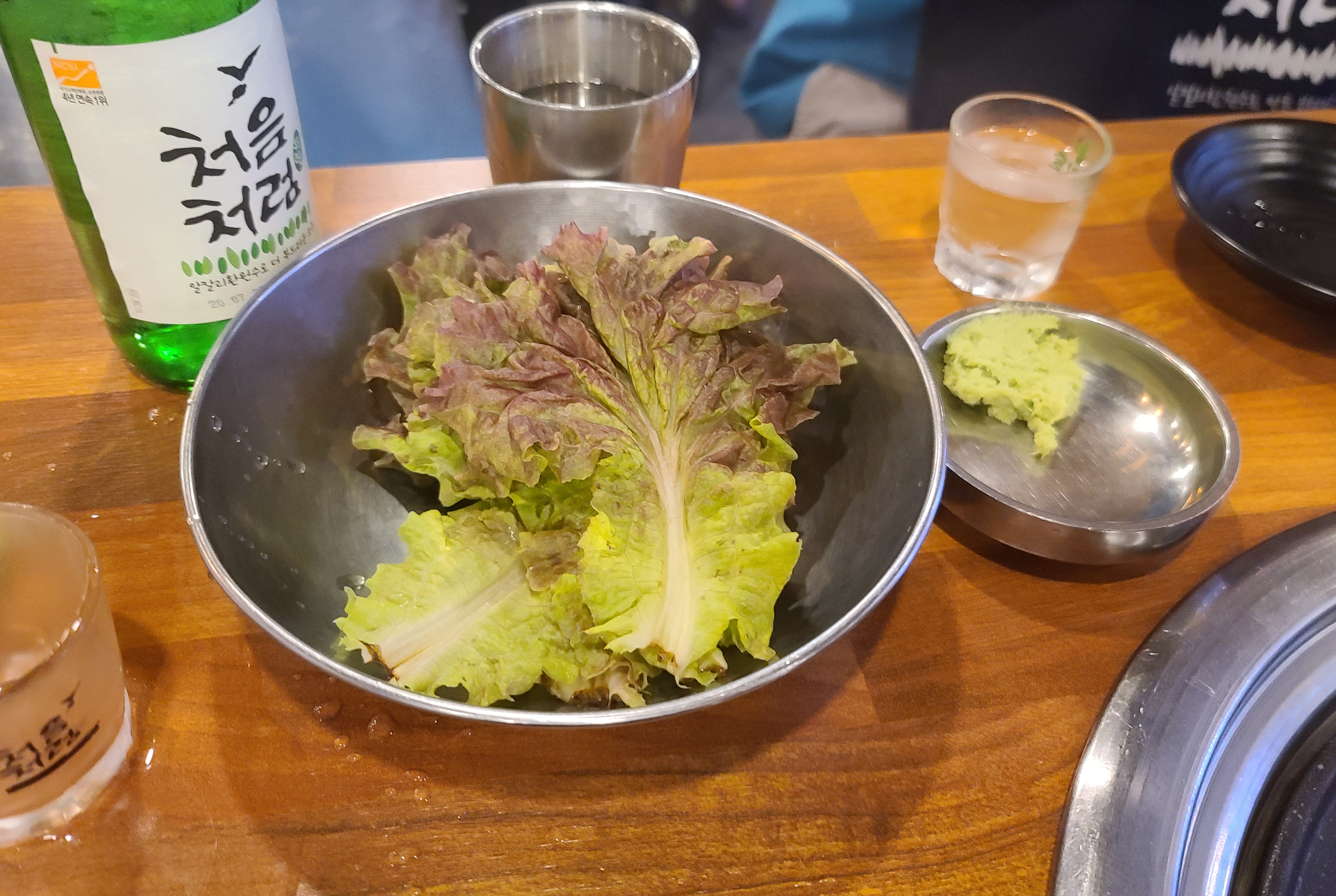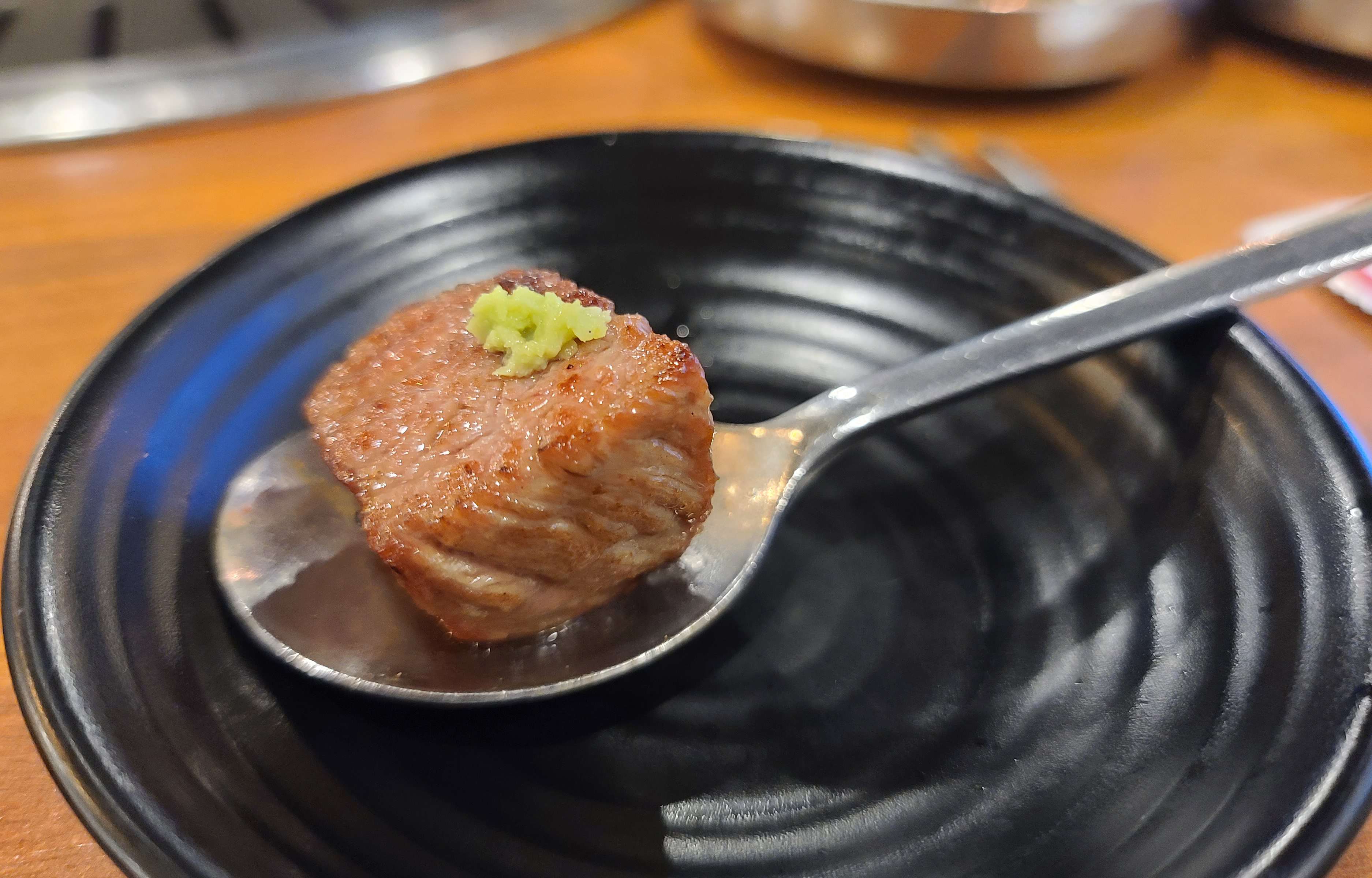 직원분은 고기가 어느 정도 익었을 때, 고기 한 점씩 맛보라고 접시에 덜어주시더라고요. 먼저 소금에 찍어먹어 보라며 권하셨고 그밖에 고기들은 접시에 덜어내어 불판 가장자리로 옮겨주었습니다. 나머지 고기들은 개인의 취향에 따라 고추냉이를 곁들이기도 하고, 쌈장이나, 젓갈, 명이나물 등과 곁들여 먹었습니다.