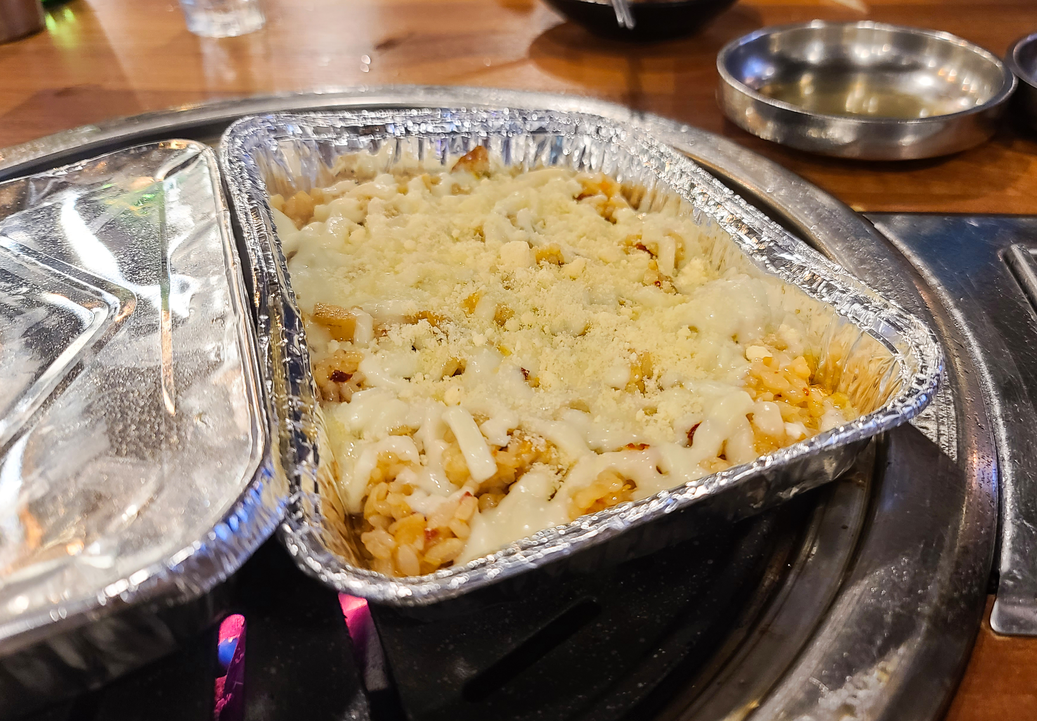 끝으로 화포식당의 사각 치즈 볶음밥을 주문하여 먹었습니다. 베이스는 김치볶음밥 형태였고, 위에 피자치즈와 파마산 치즈가 토핑이 된 형태였습니다. 후식으로 먹기에 맛이 괜찮았고요, 고소하면서도 살짝 매콤한 게 입맛에 잘 맞았습니다.