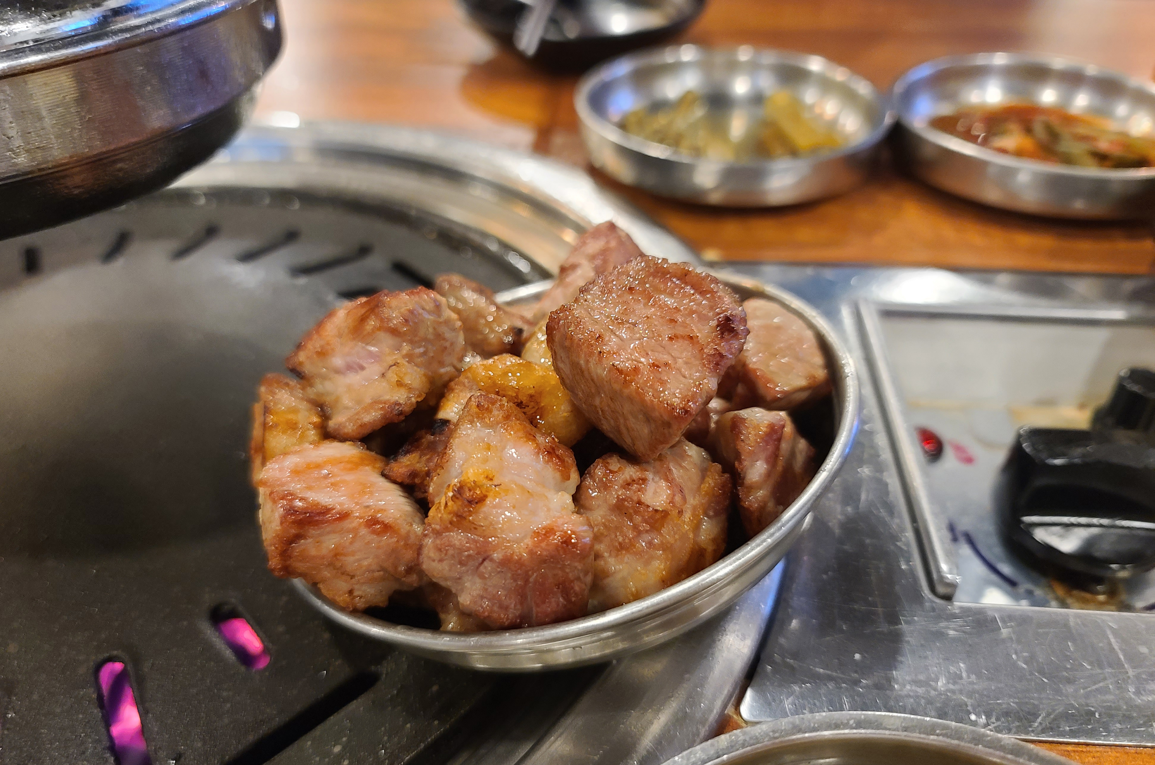 고기 두께가 꽤 있는데도, 화력이 좋아서 그런지 고기가 지글지글 잘 익더라고요. 고기 구워주는 직원은 한 입 크기로 먹기 좋게 목살을 잘라주었고, 고기가 노릇노릇하게 잘 구워졌습니다.