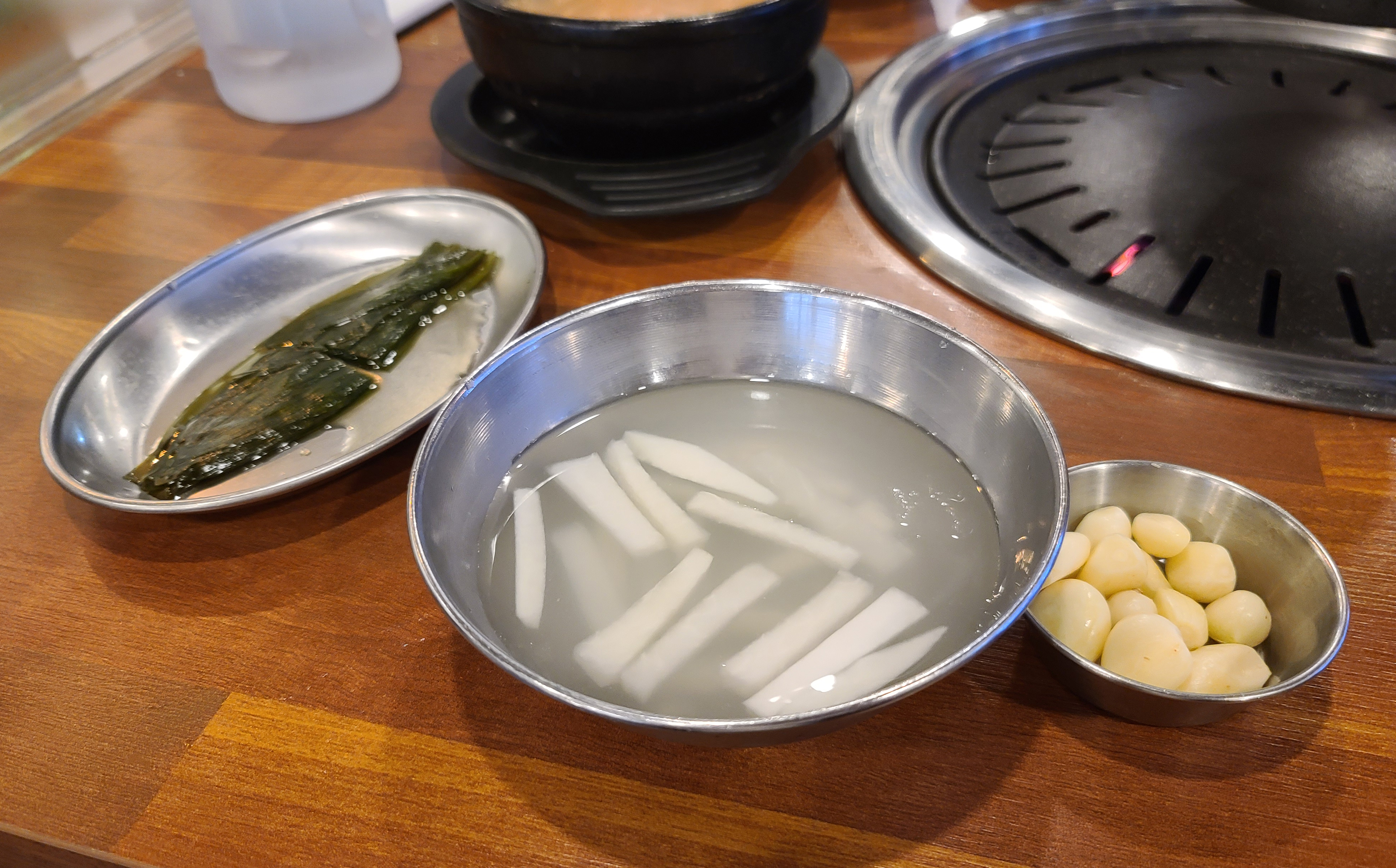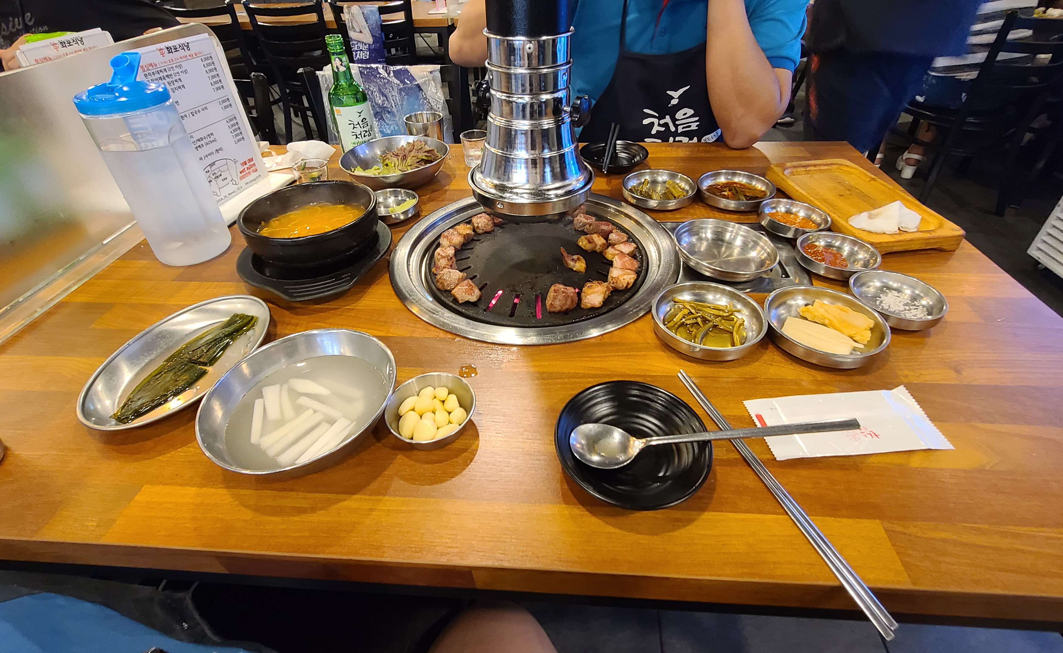 화포식당에 기본적으로 나오는 반찬은 각종 나물류와 백김치, 파김치, 마늘, 동치미, 쌈채소, 소금, 양념 그리고 김치 콩나물국이 함께 나왔습니다. 워낙 시장한 상태에서 방문하여 그런지 반찬이 나오기 무섭게 (고기가 올라가지도 않았는데..) 반찬부터 먹기 시작했습니다.