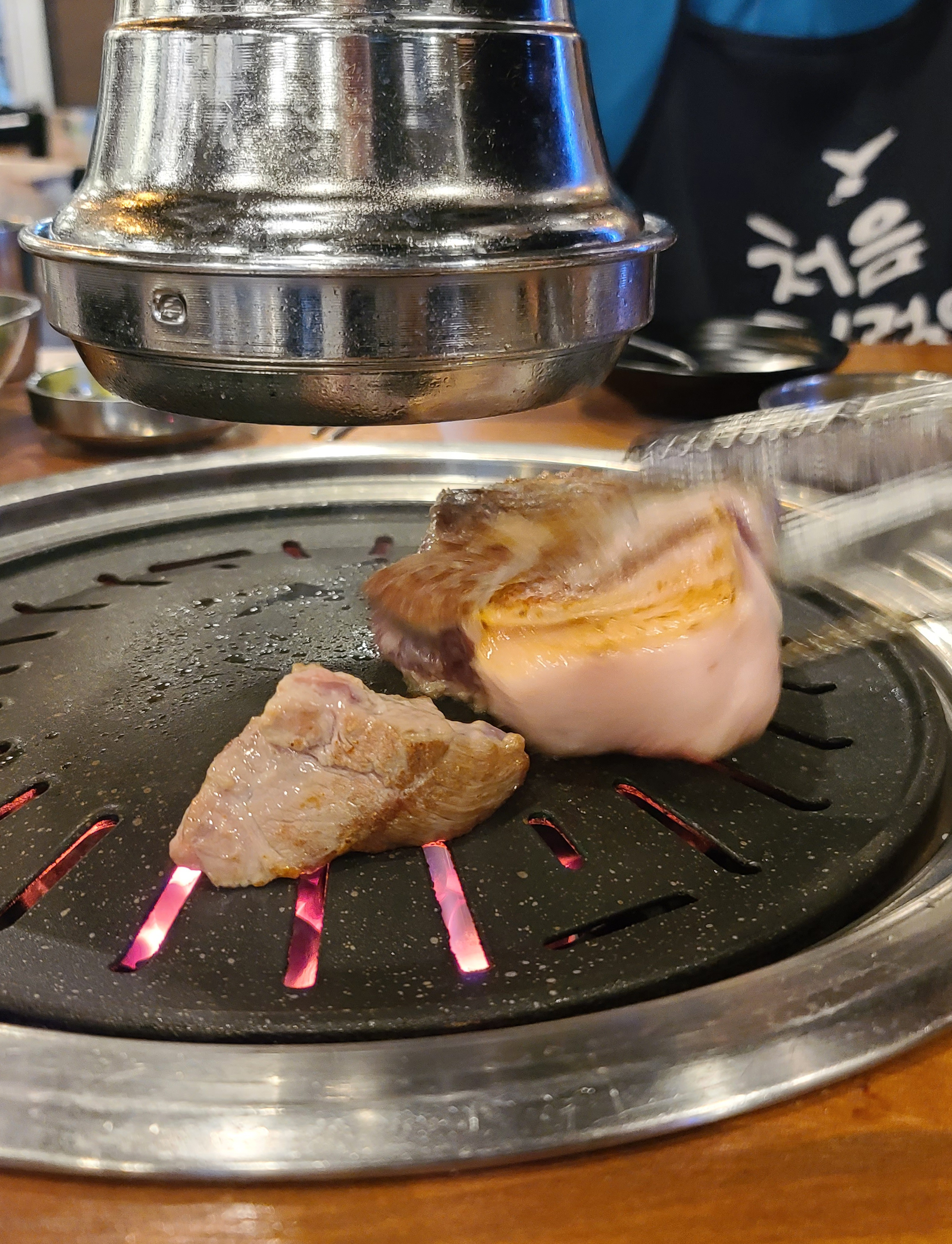 평소 같으면 고기를 제가 직접 구웠을 텐데, 화포식당은 가게 직원이 직접 불판의 온도를 체크한 뒤, 직접 고기를 구워주기 시작했습니다. 통목살이라 그런지 고기가 꽤 두툼하게 썰어져 나온 게 많이 먹음직스러워 보였습니다.