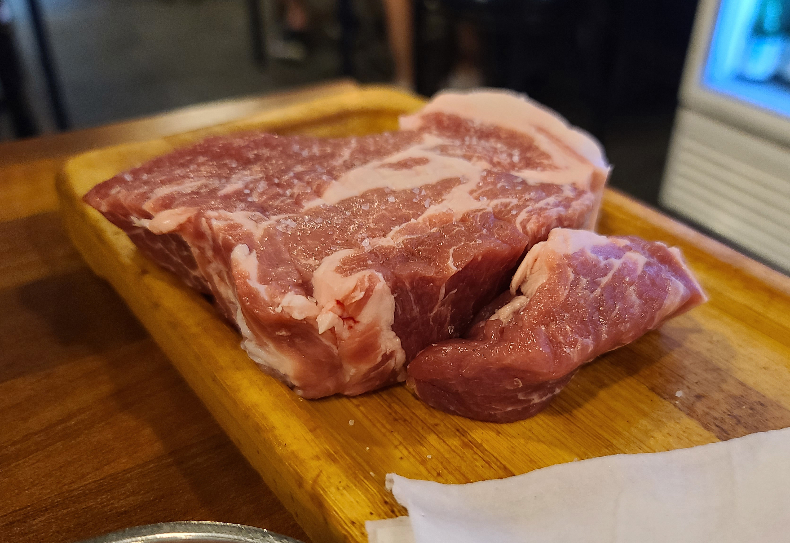 통목살만 먹기엔 조금 아쉬움이 있어서, 통삼겹살도 주문했습니다. 통삼겹살을 구울 때는 마늘을 같이 구웠습니다. 이번에도 역시 직원이 직접 구워주었고, 덕분에 두 손이 자유로워진 저는 열심히 포스팅을 할 사진을 찍었죠. 삼겹살도 겉바속촉 맛있었지만, 아무래도 이런 가게에서는 목살을 먹는 게 더 맛있는 것 같습니다.