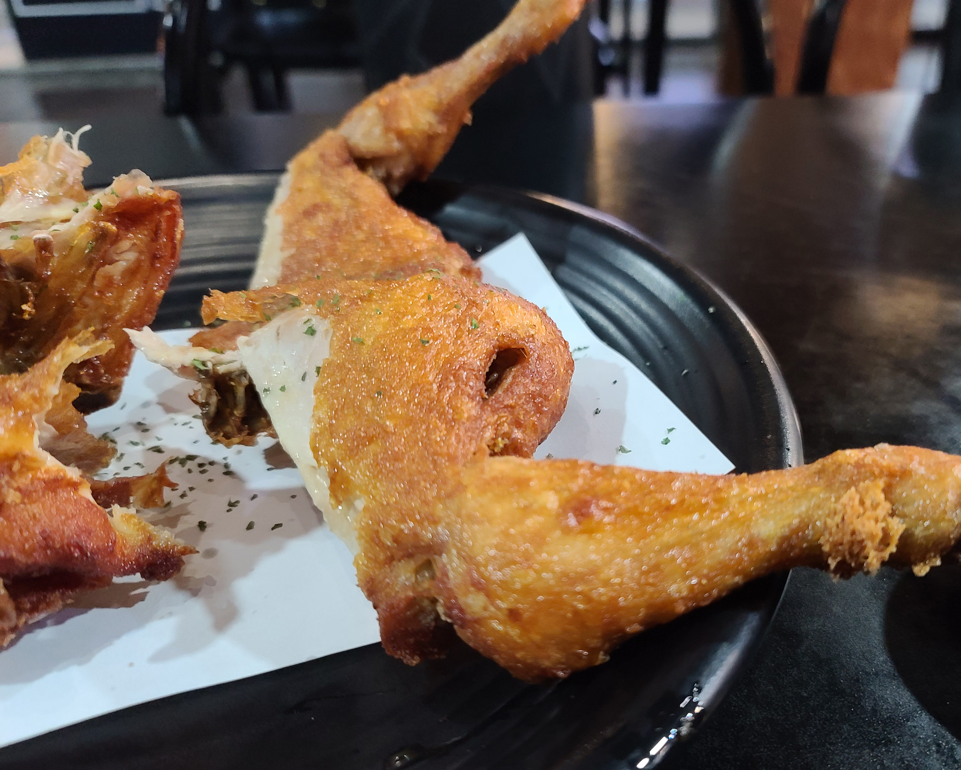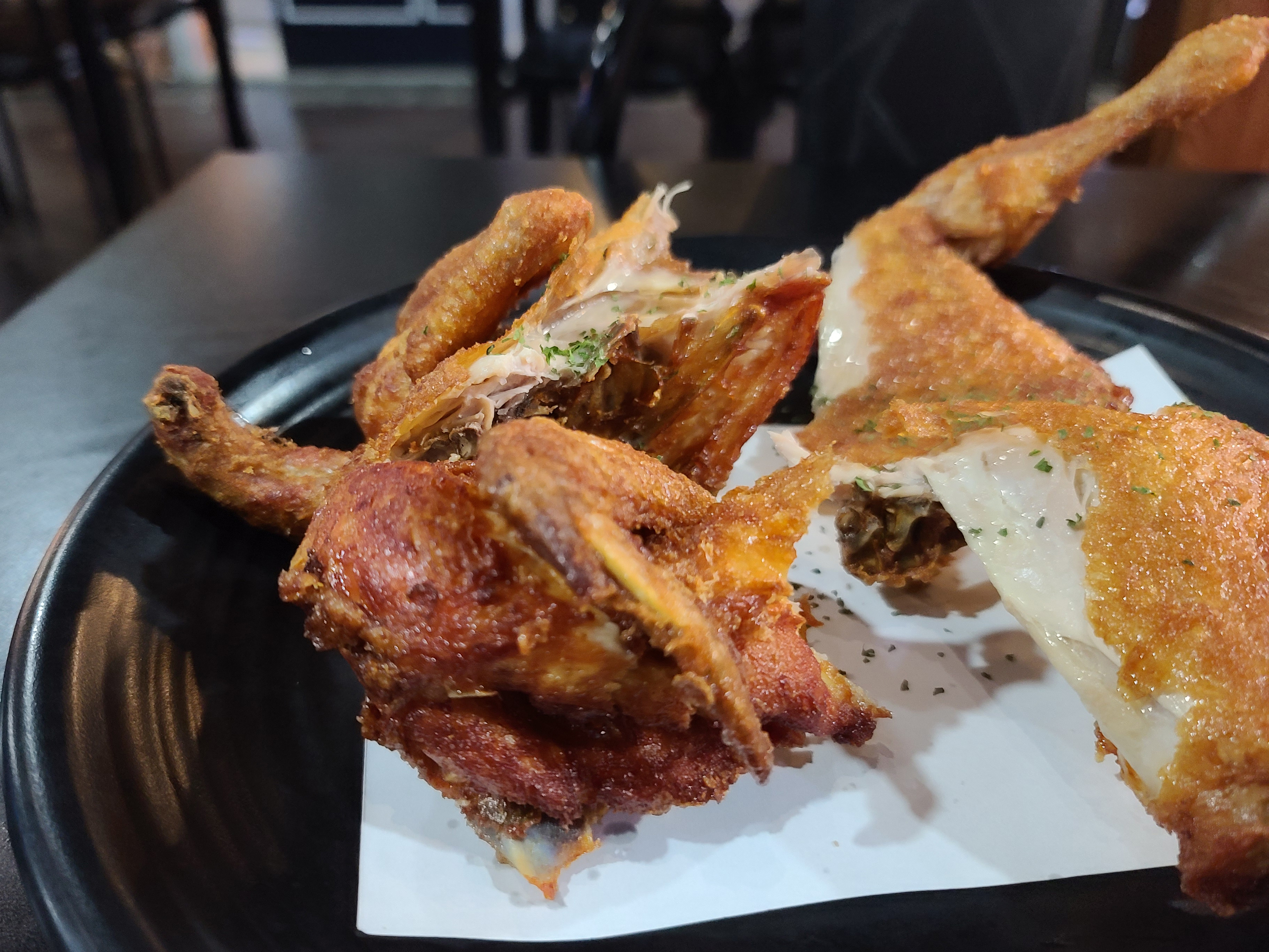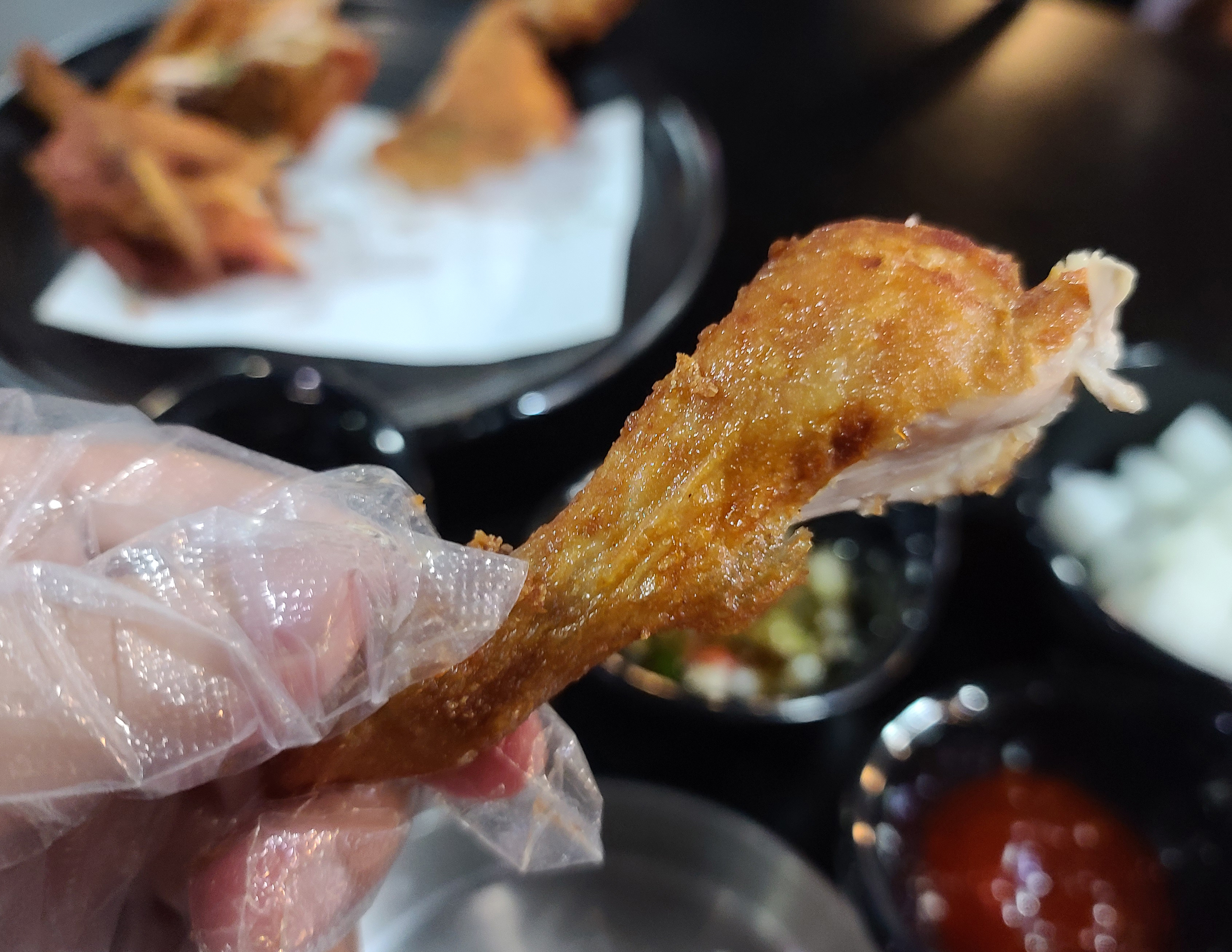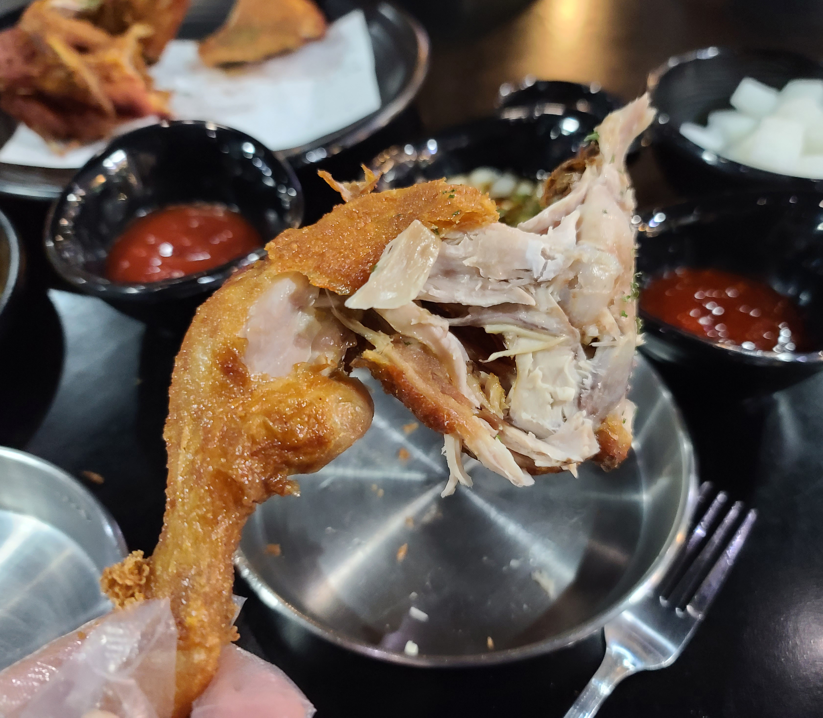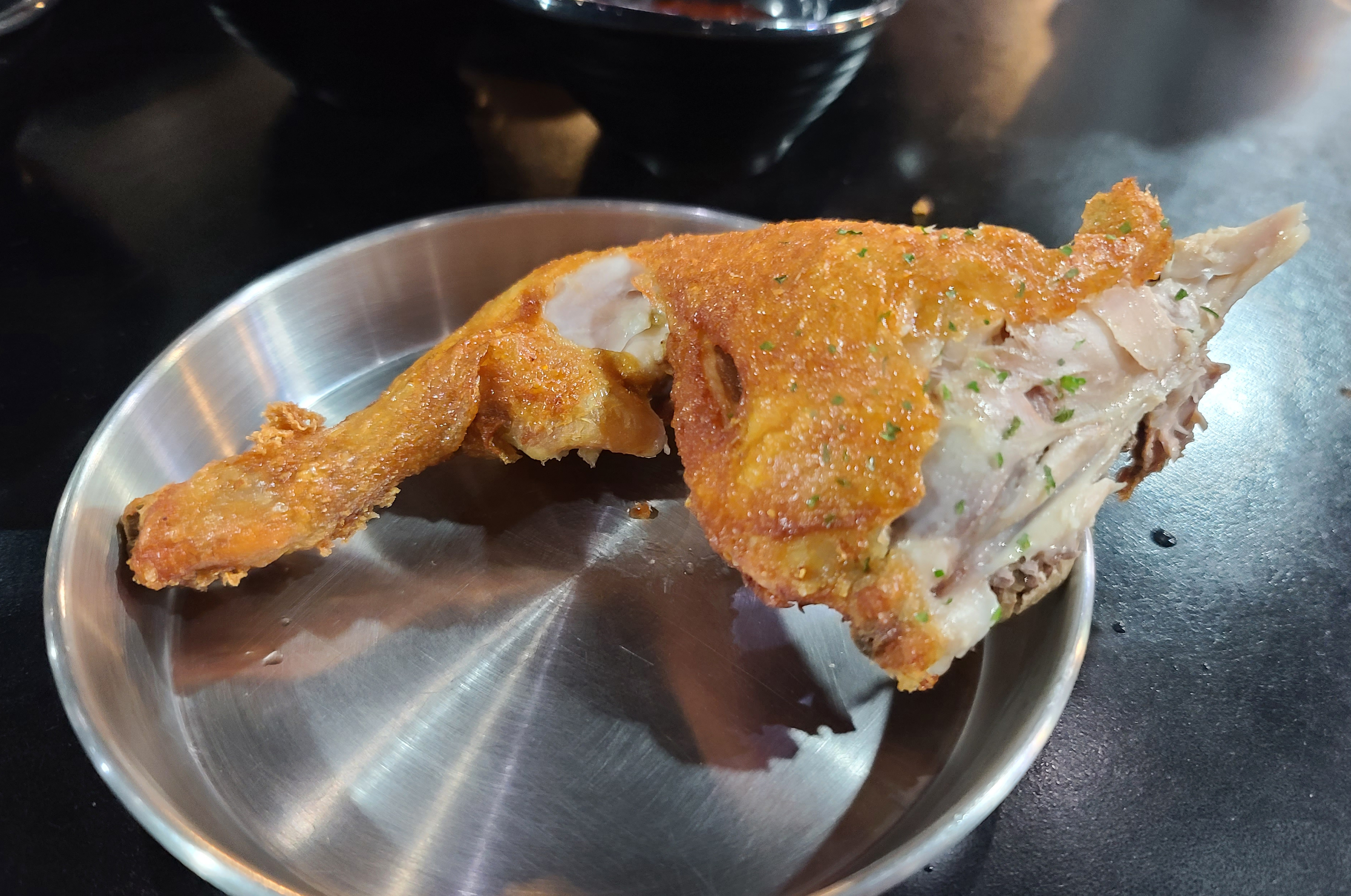 통닭 크기는 1명이서 먹기에 적당했고, 먹기 좋게 4등분으로 나뉘어 나왔습니다. 약간 바삭하게 튀겨낸 옛날통닭인데 확실히 이런 치킨은 기름에서 갓 튀겼을 때 바로 먹어야 맛있는 것 같습니다. 조금 오래 놔두면 금세 딱딱해지거든요.