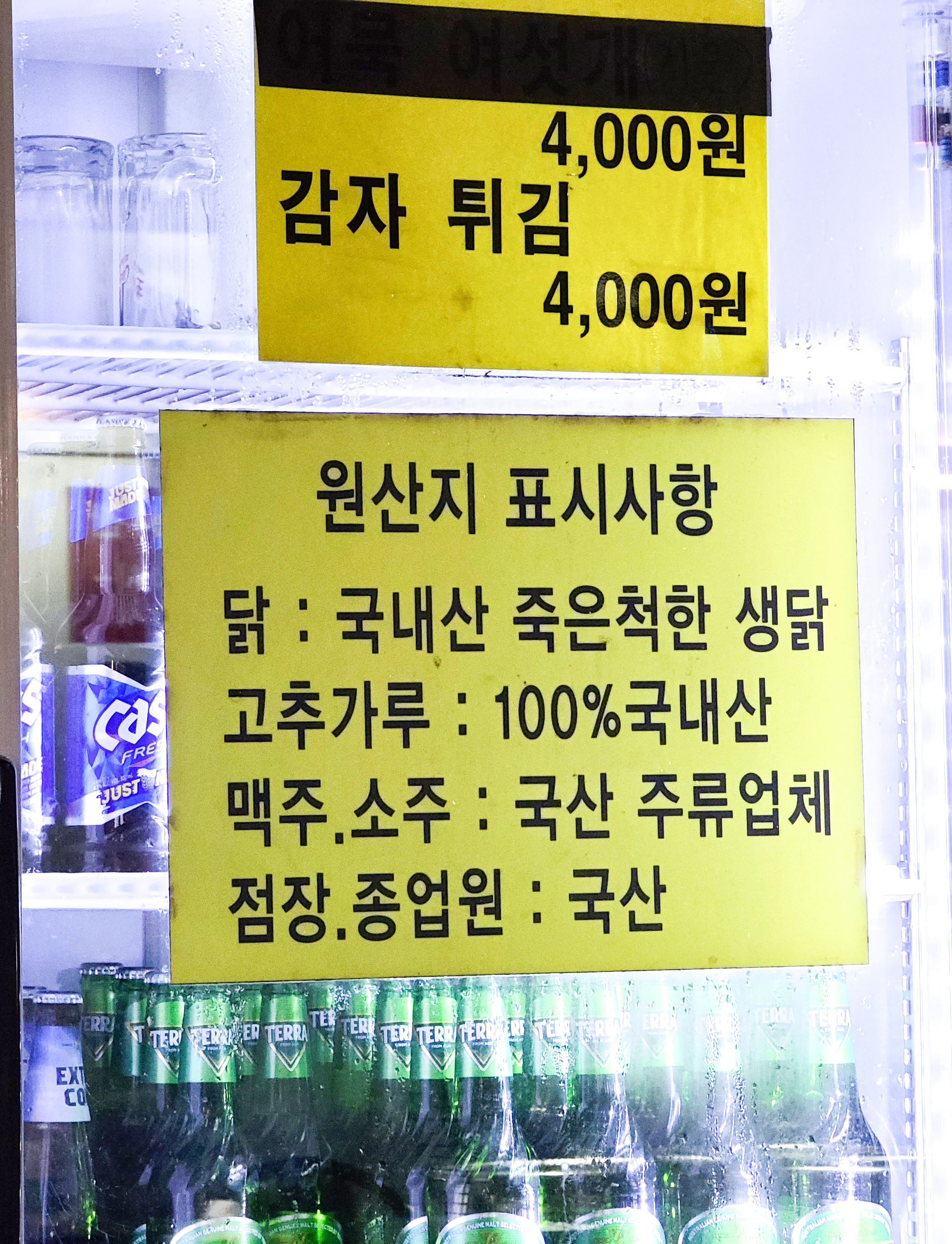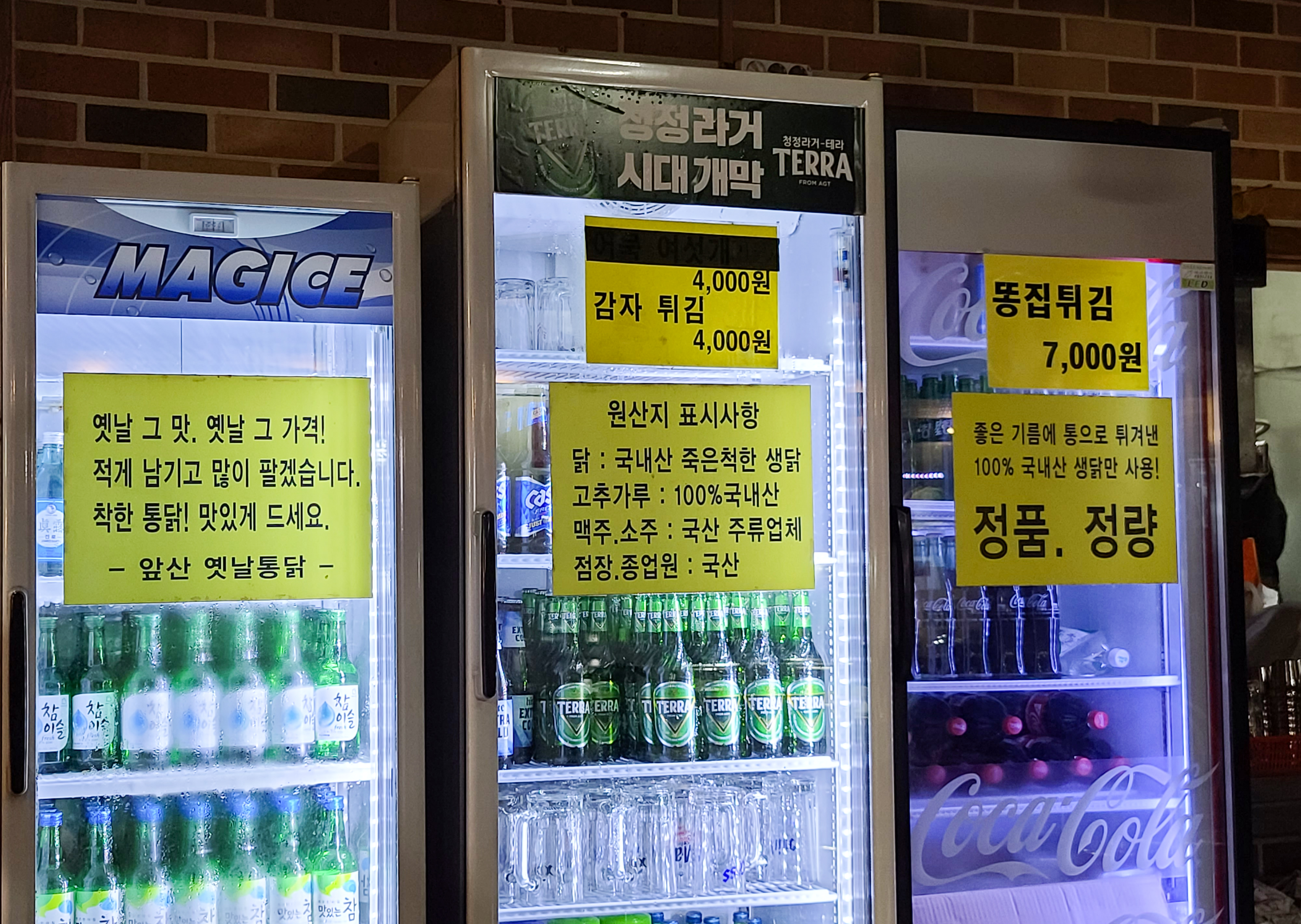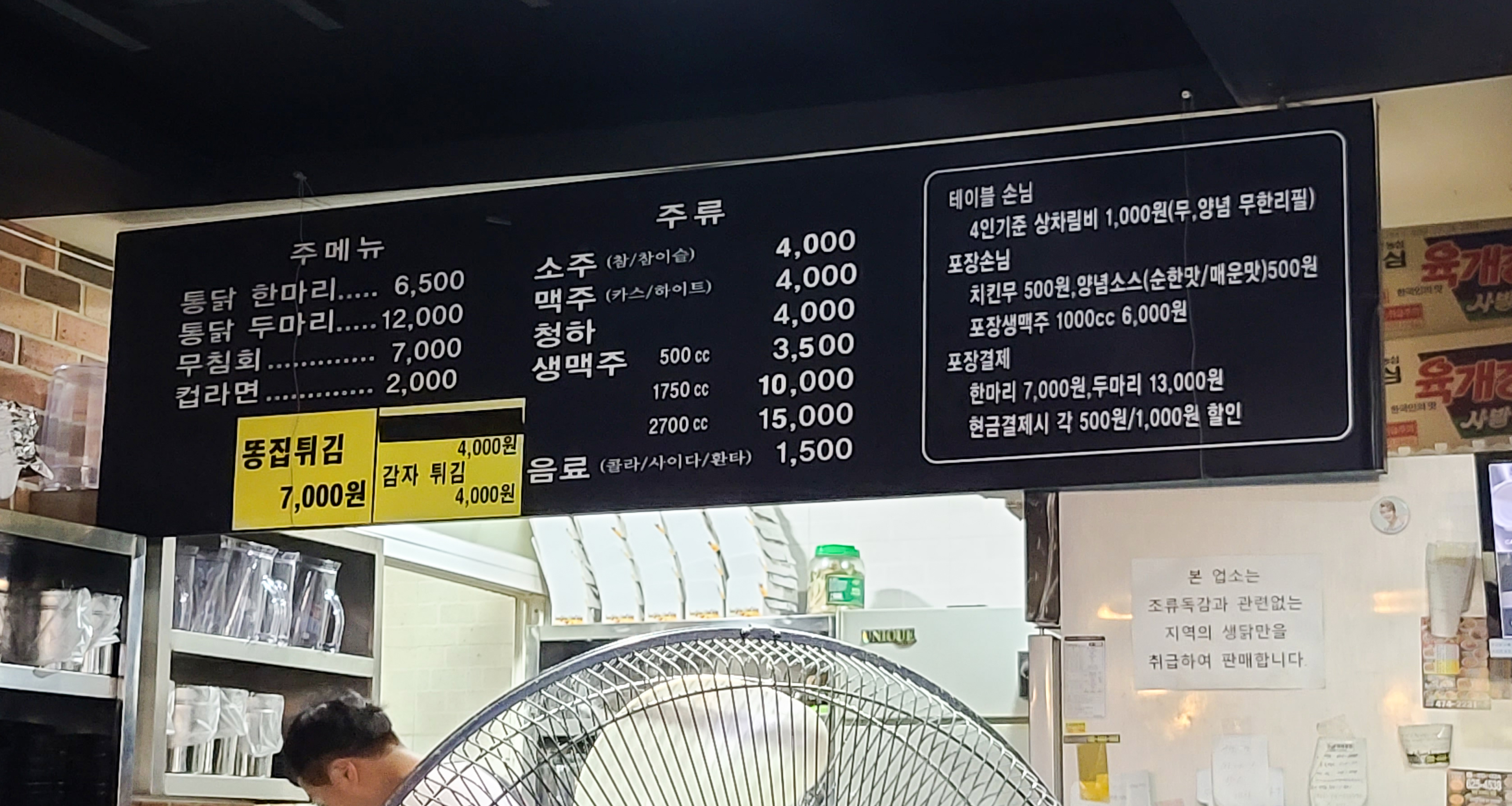 앞산 옛날통닭 가게의 메뉴를 살펴보면 통닭 한 마리 6,500원, 통닭 두 마리 12,000원, 무침회 7,000원, 컵라면 2,000원, 똥집튀김 7,000원, 감자튀김 4,000원에 판매 중이었습니다. 이 날 저 혼자 방문했는데, 가격이 워낙 저렴하고 치킨 한 마리만 시켜서 먹기엔 조금 아쉬워서 앞산옛날통닭의 통닭 1마리와 감자튀김을 같이 주문했습니다. (죽은척한 생닭은 뭐죠??ㅋㅋ)
