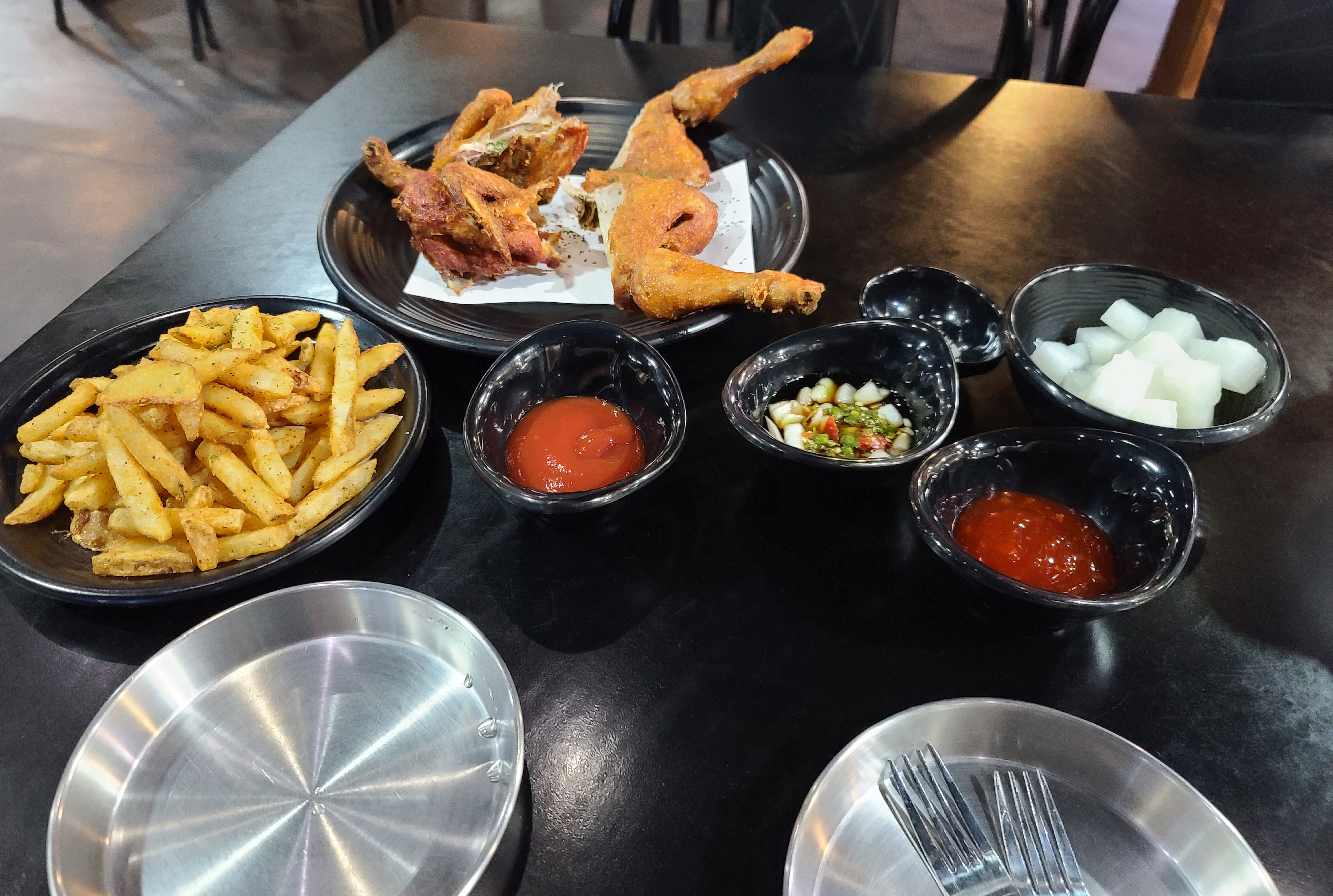 조금 기다리니 주문한 통닭 한 마리와 감자튀김이 나왔습니다. 메뉴와 같이 곁들일 소금, 케첩, 치킨 양념, 간장소스, 치킨무도 함께 나왔습니다.