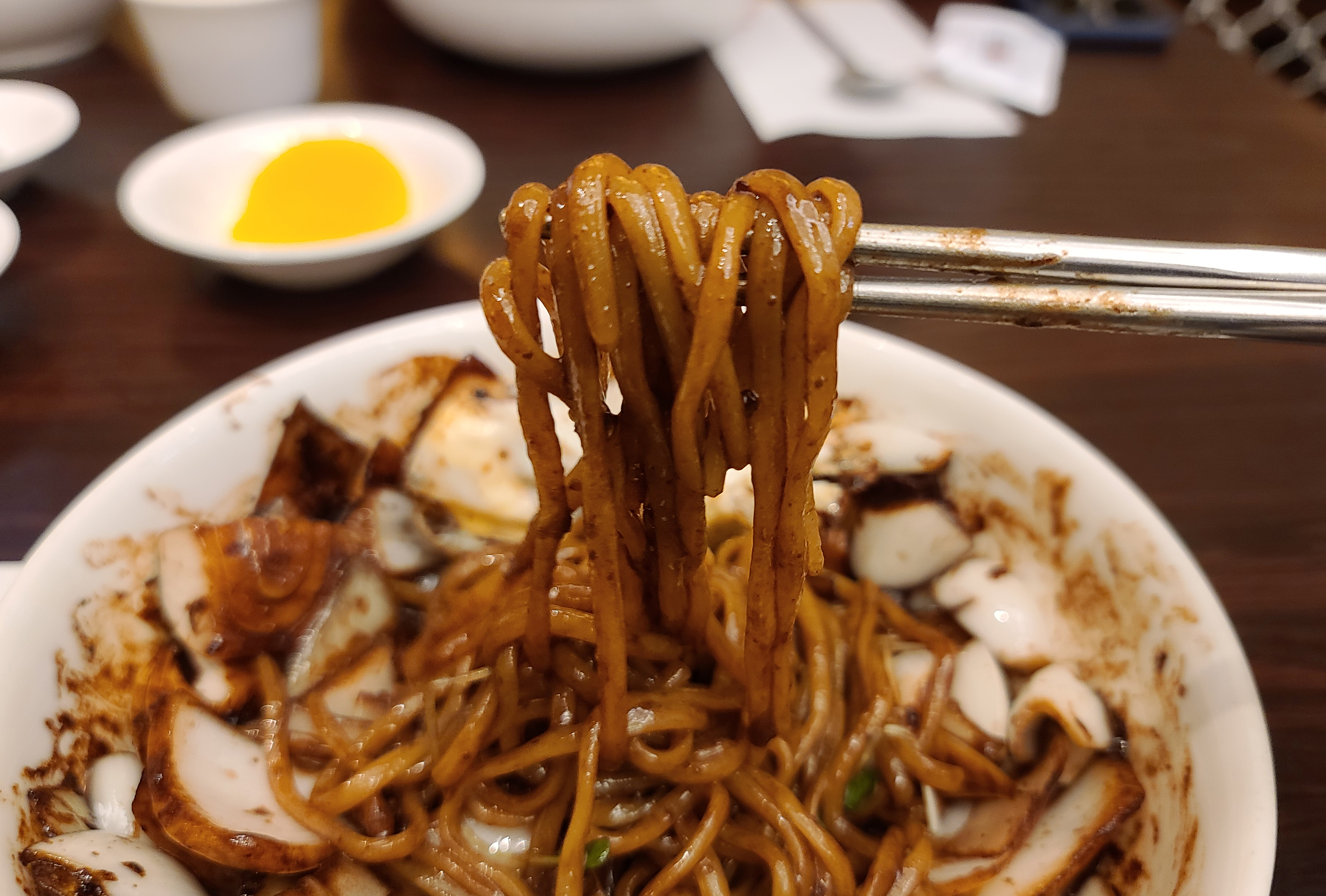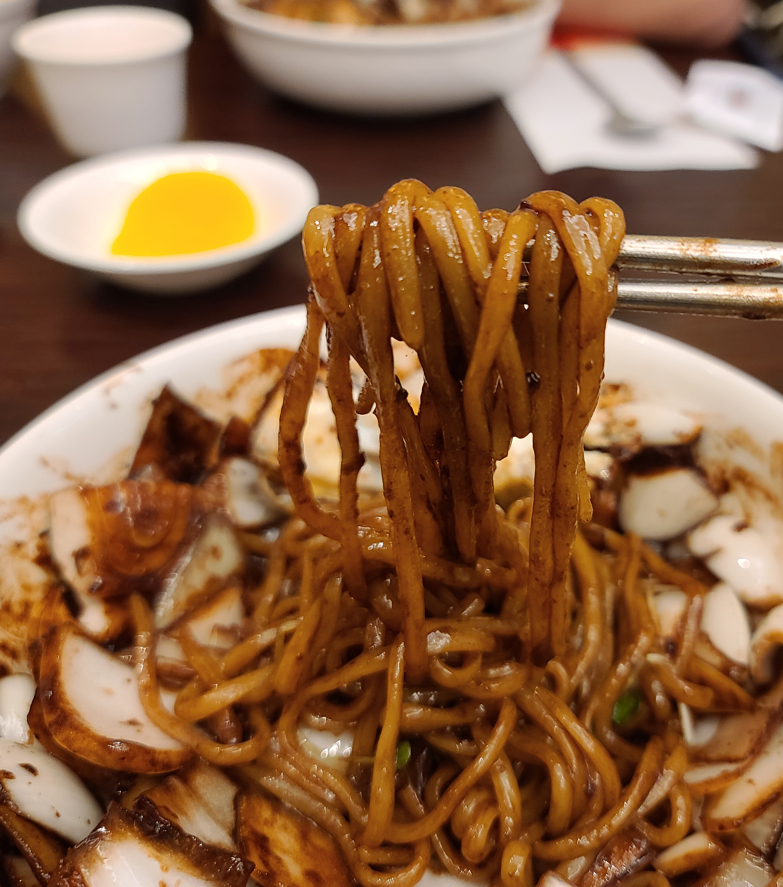 소스를 면 위에 부어서 젓가락으로 슥슥 비벼주었습니다. 홍명의 간짜장은 양파가 거의 날것으로 들어가는데요, 이게 은근 매력이 있더라고요. 아삭아삭 단 맛이 나는 양파는 느끼할 수 있는 짜장면과 잘 어울렸고, 짜장의 양념이 진하게 볶여 나와서 그런지 더욱 감칠맛이 돌았습니다.