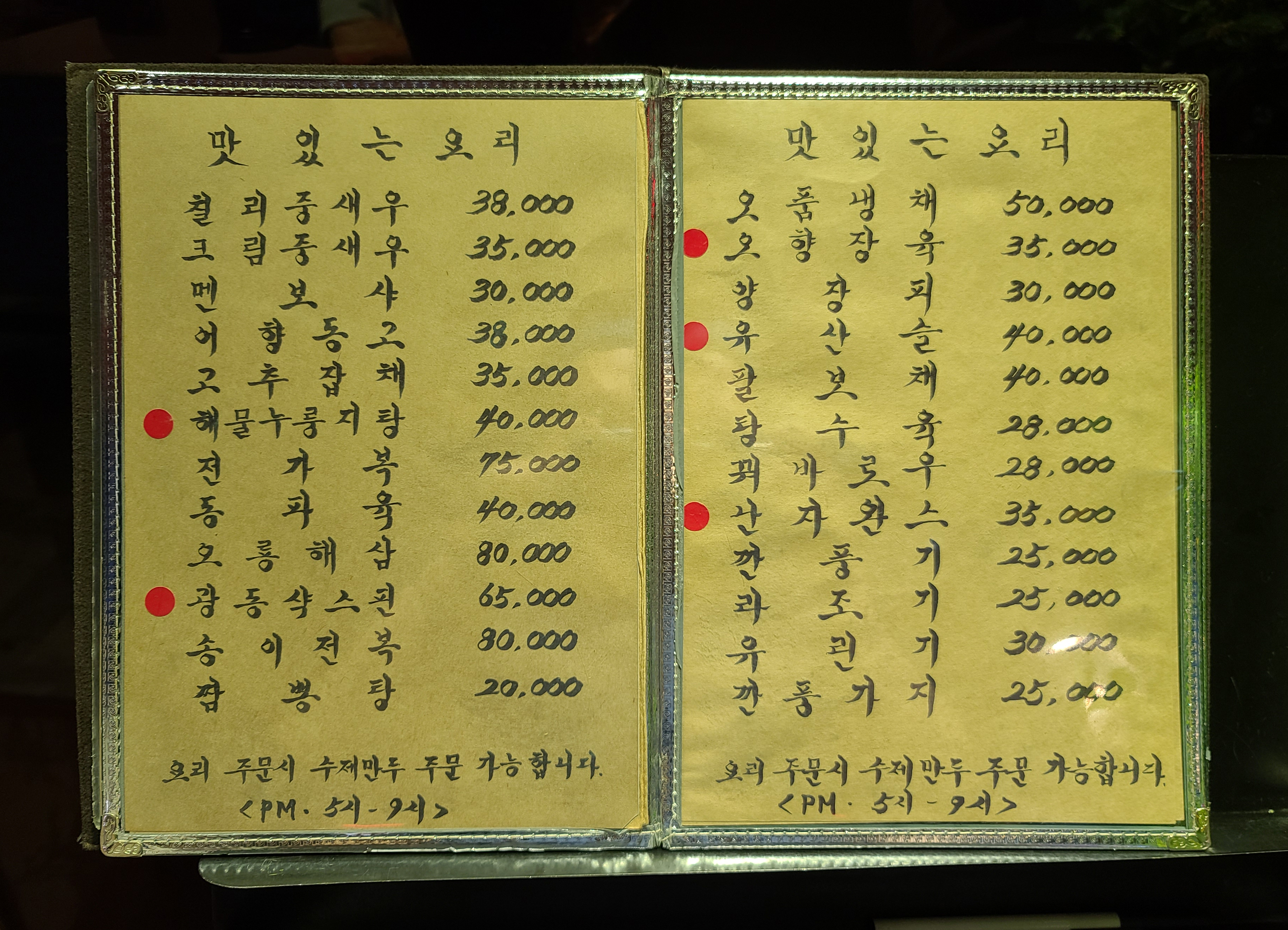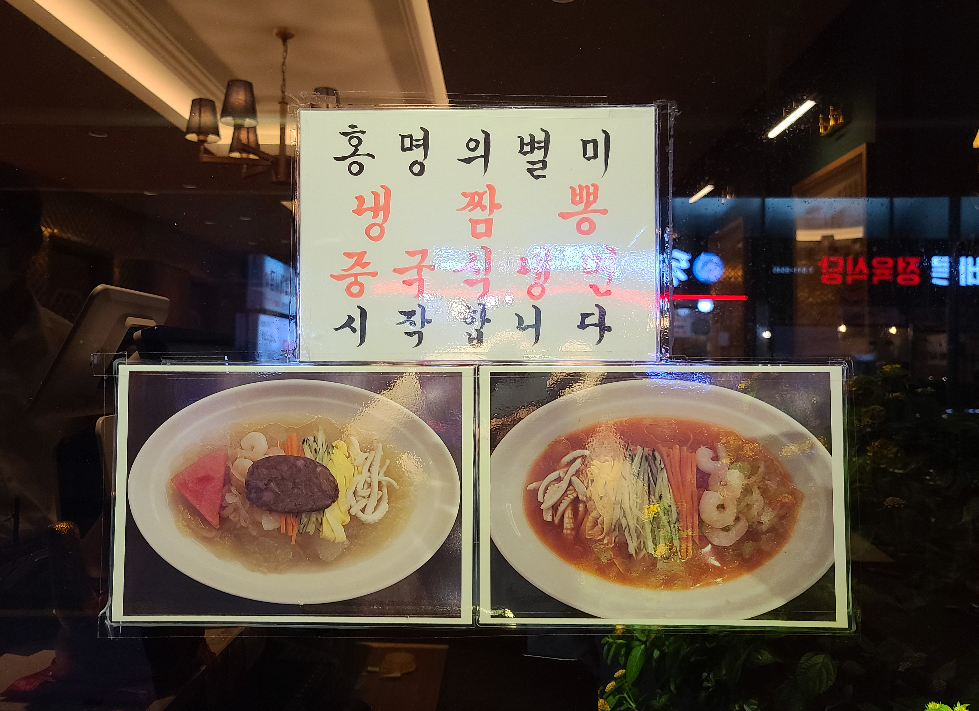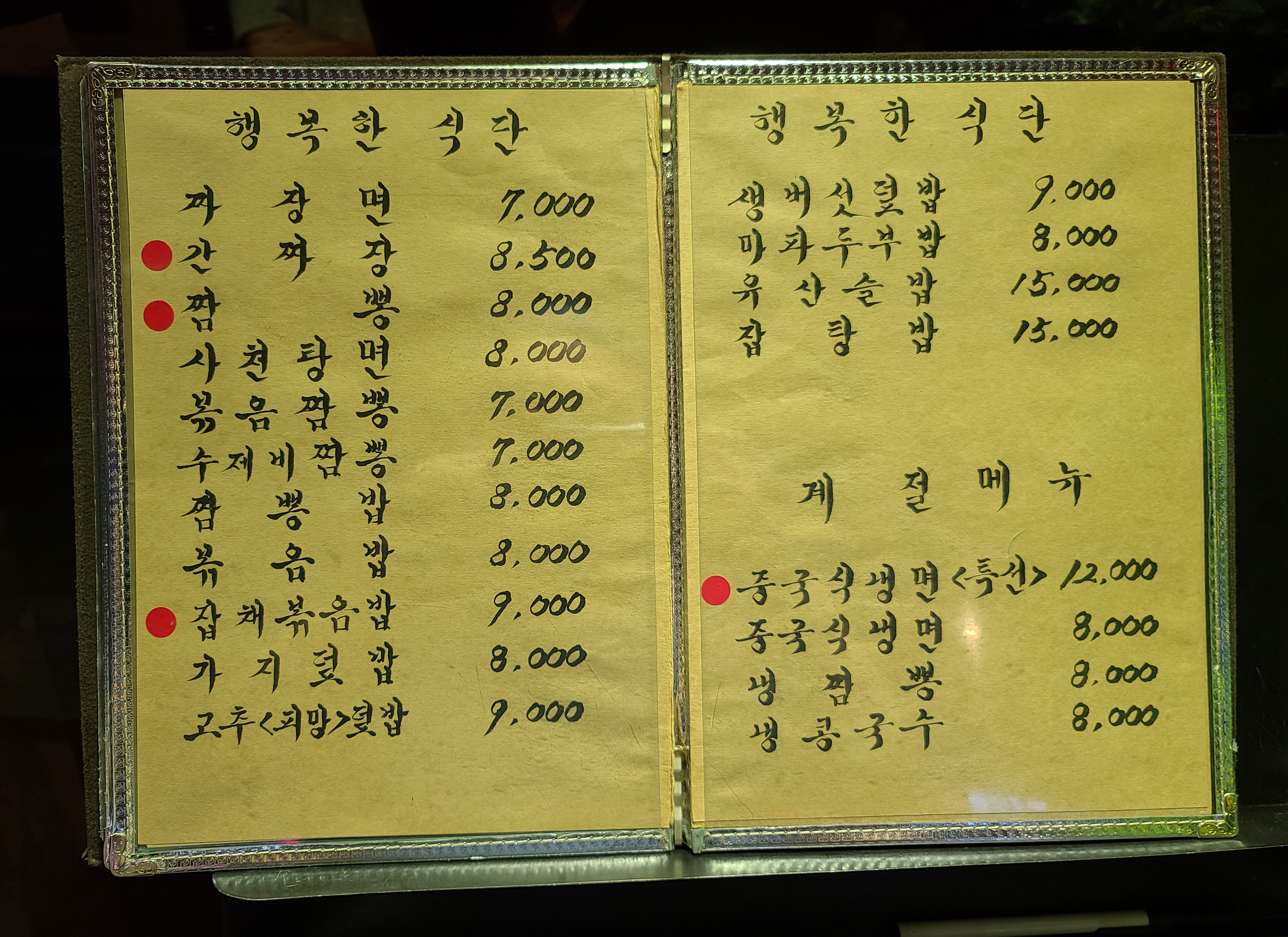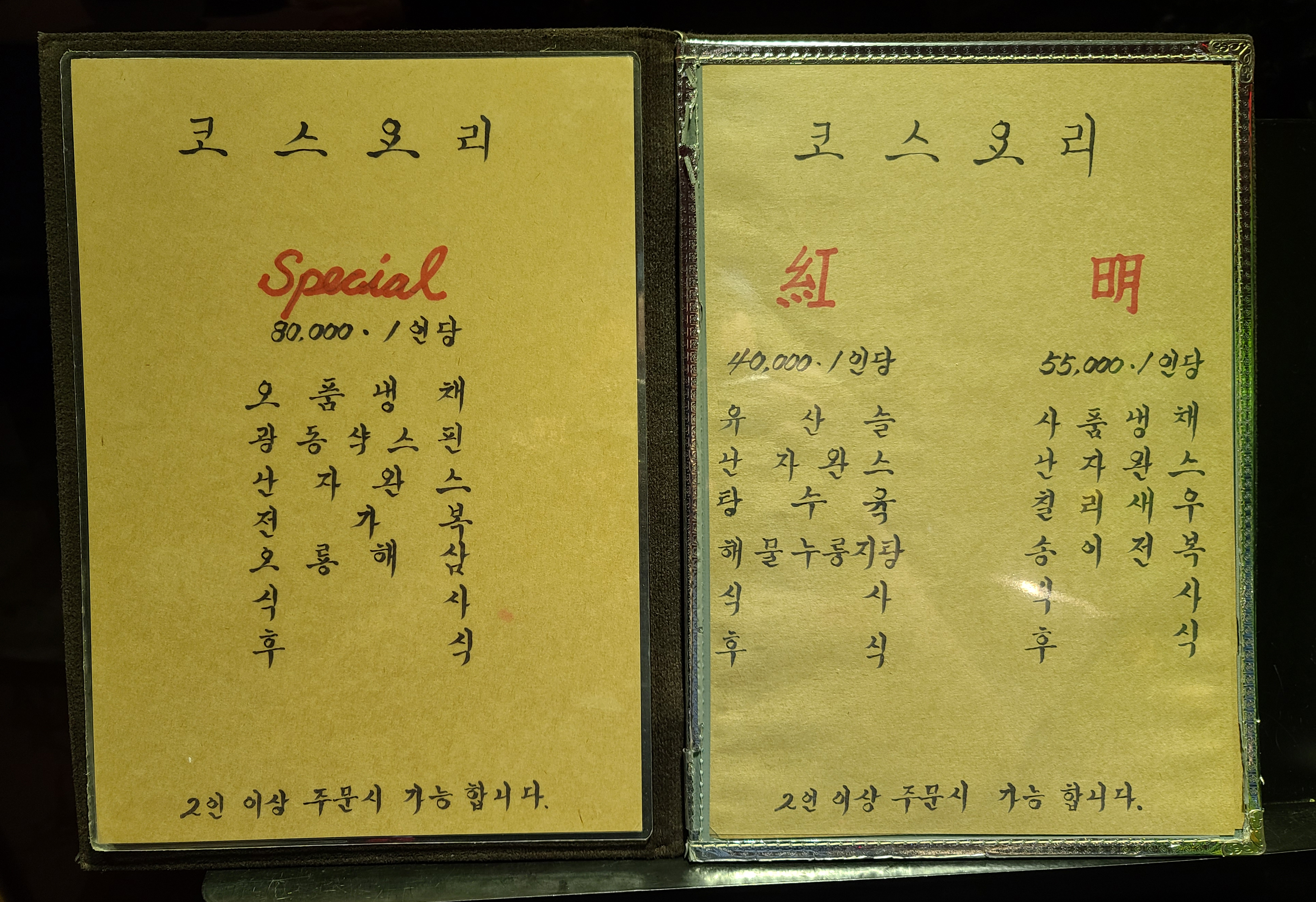 홍명의 손으로 직접 쓴 메뉴는 다음과 같았습니다. 칠리중새우, 크림중새우, 멘보샤, 어향동고, 고추잡채, 해물누룽지탕, 진가복, 동파육, 오룡해삼, 광동샥스핀, 송이전복, 짬뽕탕, 오품냉채, 오향장육, 양장피, 유산슬, 팔보채, 탕수육, 꿔바로우, 난자완스, 깐풍기, 라조기, 유린기, 깐풍가지, 짜장면, 간짜장, 짬뽕, 사천탕면, 볶음짬뽕, 수제비짬뽕, 짬뽕밥, 볶음밥, 잡채볶음밥, 가지덮밥, 고추(피망)덮밥, 생버섯덮밥, 마파두부밥, 유산슬밥, 잡탕밥, 중국식냉면, 냉짬뽕, 냉콩국수 등 이 있었습니다. (붉은색 표시 메뉴는 가게 추천 메뉴로 보였습니다.)