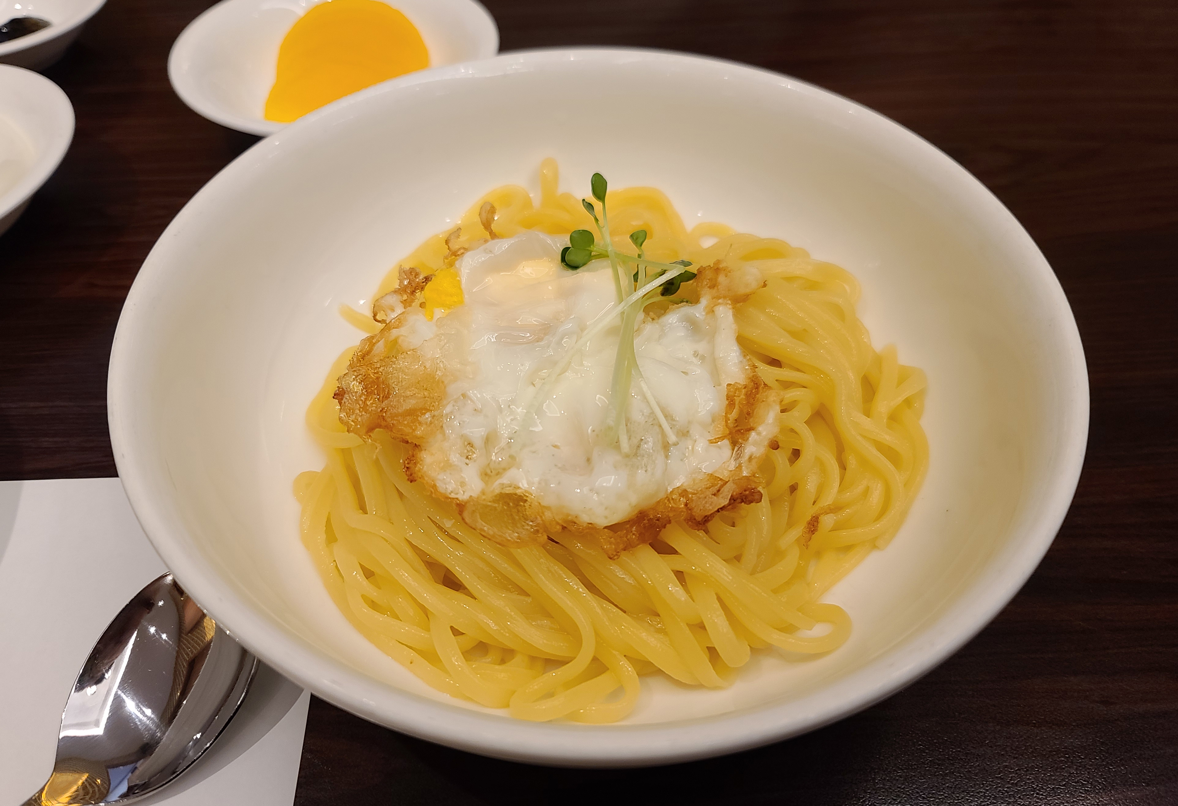 곧이어 제 차례가 왔고, 자리를 안내받아 식사할 자리로 이동하였습니다. 반찬은 양파와 단무지, 춘장이 제공되었으며 중식당답게 자스민차를 내어주었습니다. 주문한 간짜장은 달걀프라이가 올라간 형태였는데요, 한눈에 봐도 진하게 볶여져 나온 간짜장 소스는 보기만해도 군침이 돌았습니다.