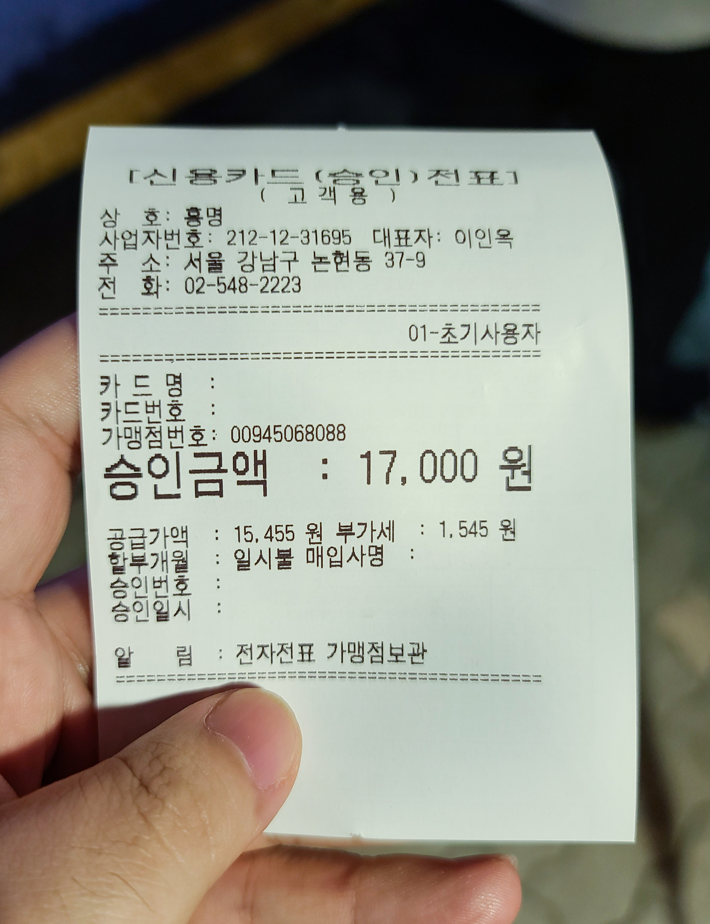홍명의 간짜장 금액은 1인분에 8,500원씩 2명이서 먹었으니, 17,000원이 나왔습니다. 가격은 좀 있는 편이지만 맛은 괜찮았던 중식당이었습니다. 나중에 기회가 된다면 식사 메뉴를 도전해봐야겠습니다. (ㅋㅋ)