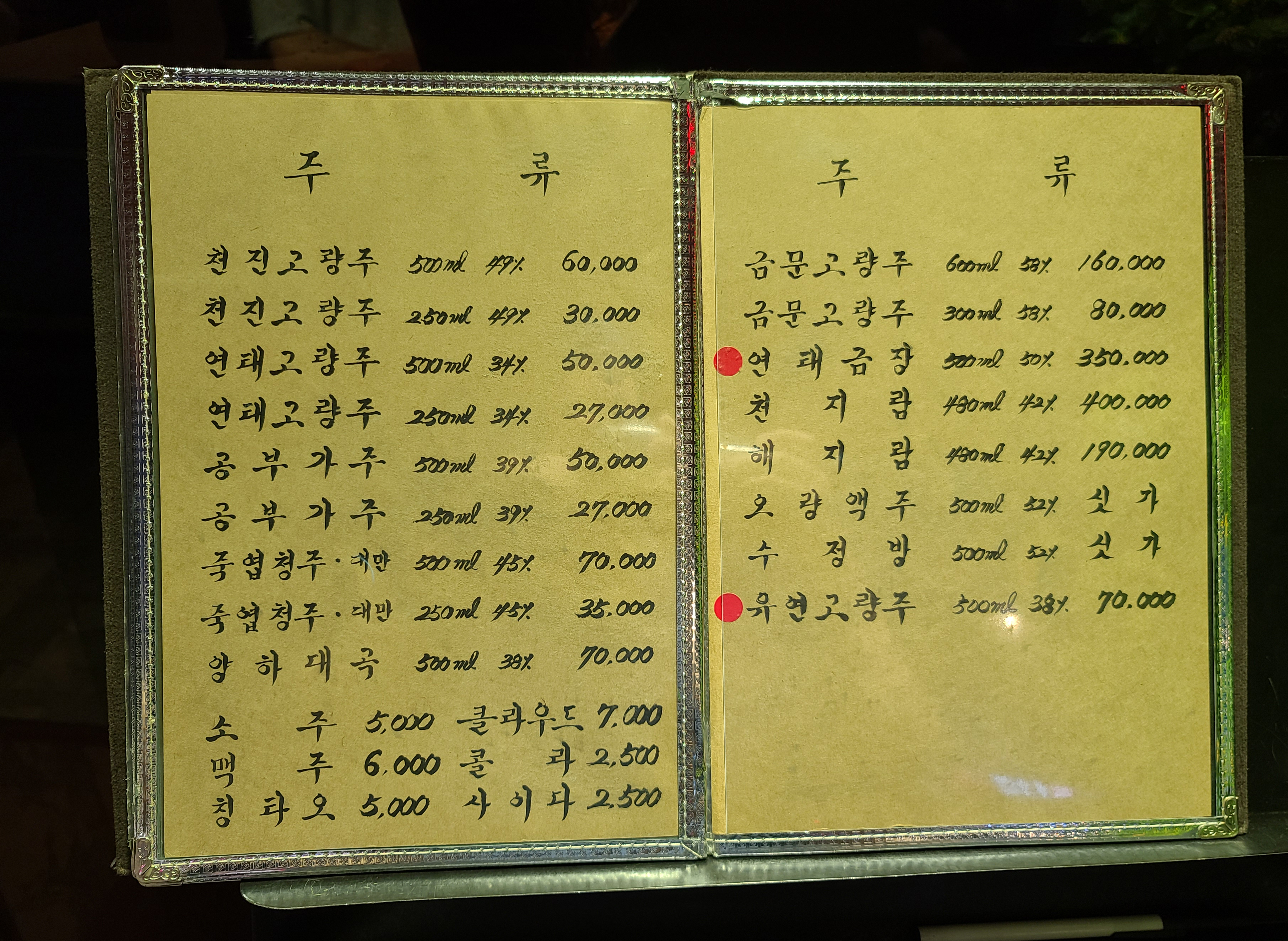 홍명의 손으로 직접 쓴 메뉴는 다음과 같았습니다. 칠리중새우, 크림중새우, 멘보샤, 어향동고, 고추잡채, 해물누룽지탕, 진가복, 동파육, 오룡해삼, 광동샥스핀, 송이전복, 짬뽕탕, 오품냉채, 오향장육, 양장피, 유산슬, 팔보채, 탕수육, 꿔바로우, 난자완스, 깐풍기, 라조기, 유린기, 깐풍가지, 짜장면, 간짜장, 짬뽕, 사천탕면, 볶음짬뽕, 수제비짬뽕, 짬뽕밥, 볶음밥, 잡채볶음밥, 가지덮밥, 고추(피망)덮밥, 생버섯덮밥, 마파두부밥, 유산슬밥, 잡탕밥, 중국식냉면, 냉짬뽕, 냉콩국수 등 이 있었습니다. (붉은색 표시 메뉴는 가게 추천 메뉴로 보였습니다.)