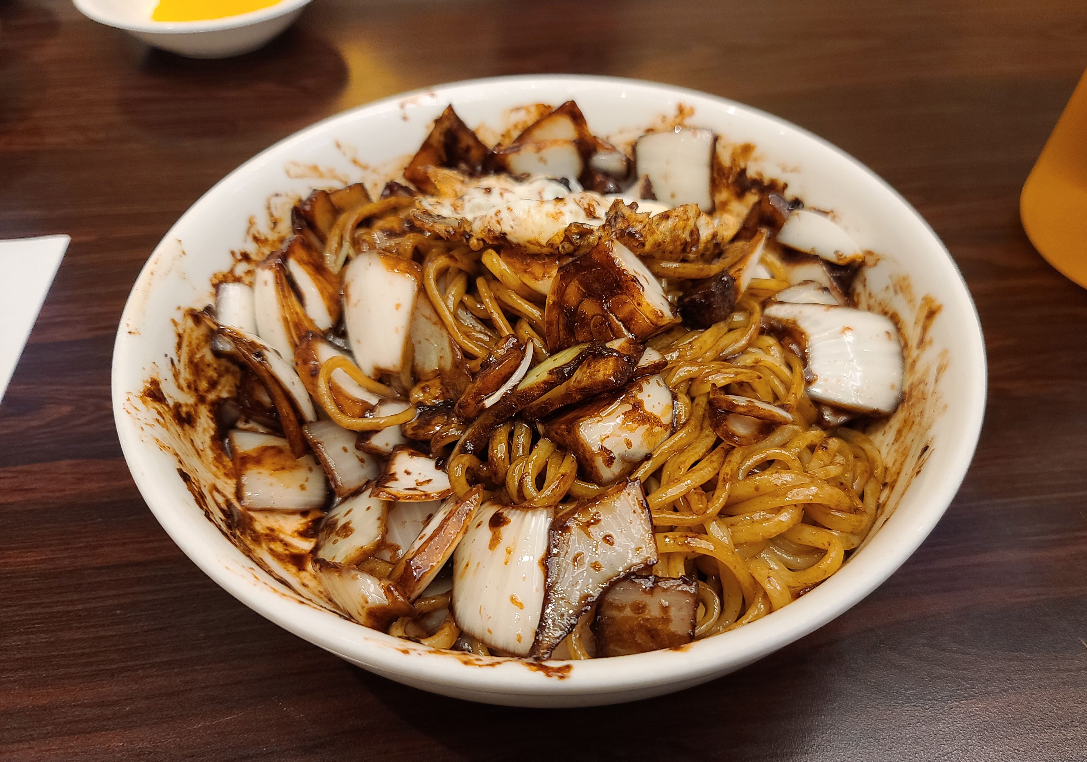 소스를 면 위에 부어서 젓가락으로 슥슥 비벼주었습니다. 홍명의 간짜장은 양파가 거의 날것으로 들어가는데요, 이게 은근 매력이 있더라고요. 아삭아삭 단 맛이 나는 양파는 느끼할 수 있는 짜장면과 잘 어울렸고, 짜장의 양념이 진하게 볶여 나와서 그런지 더욱 감칠맛이 돌았습니다.