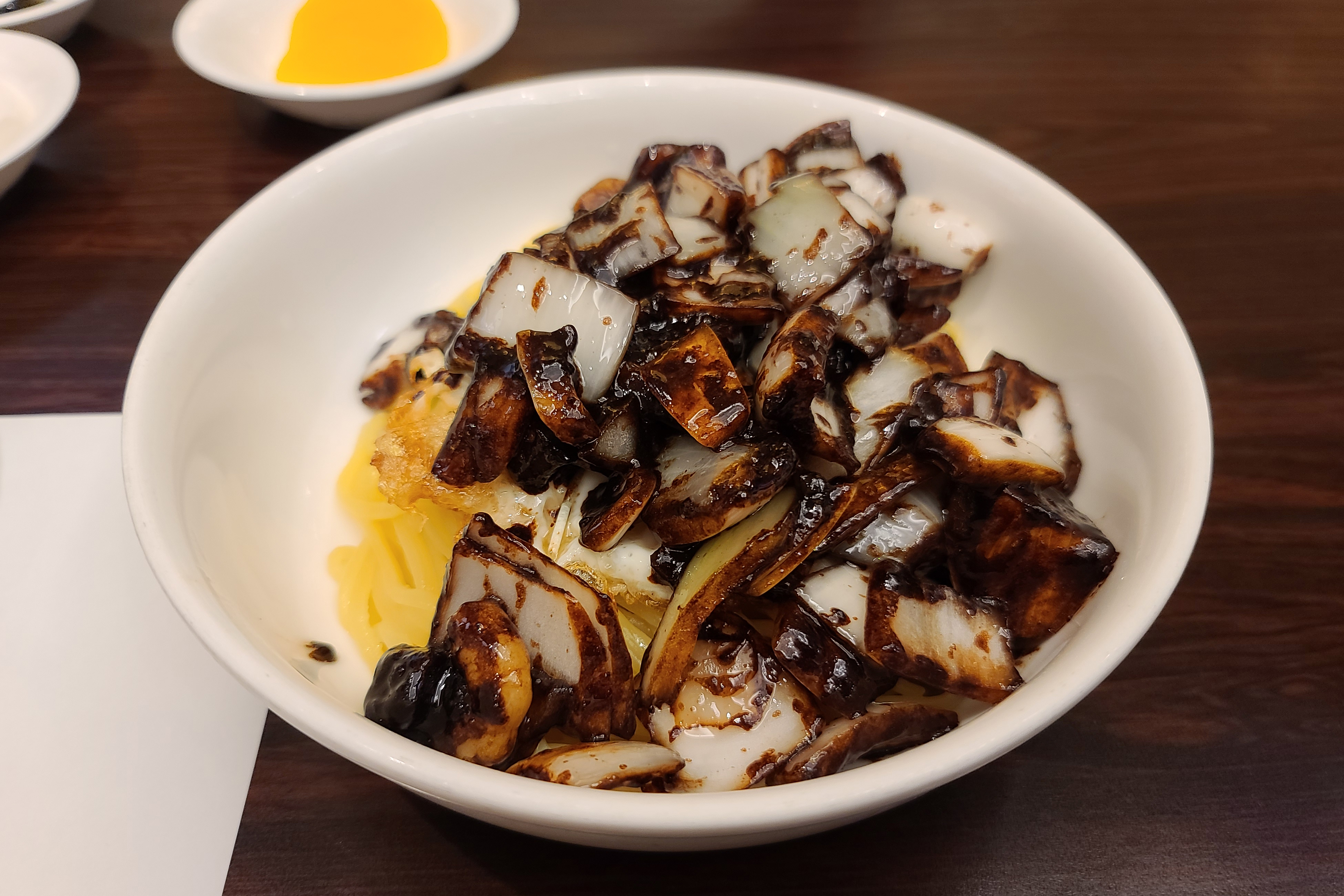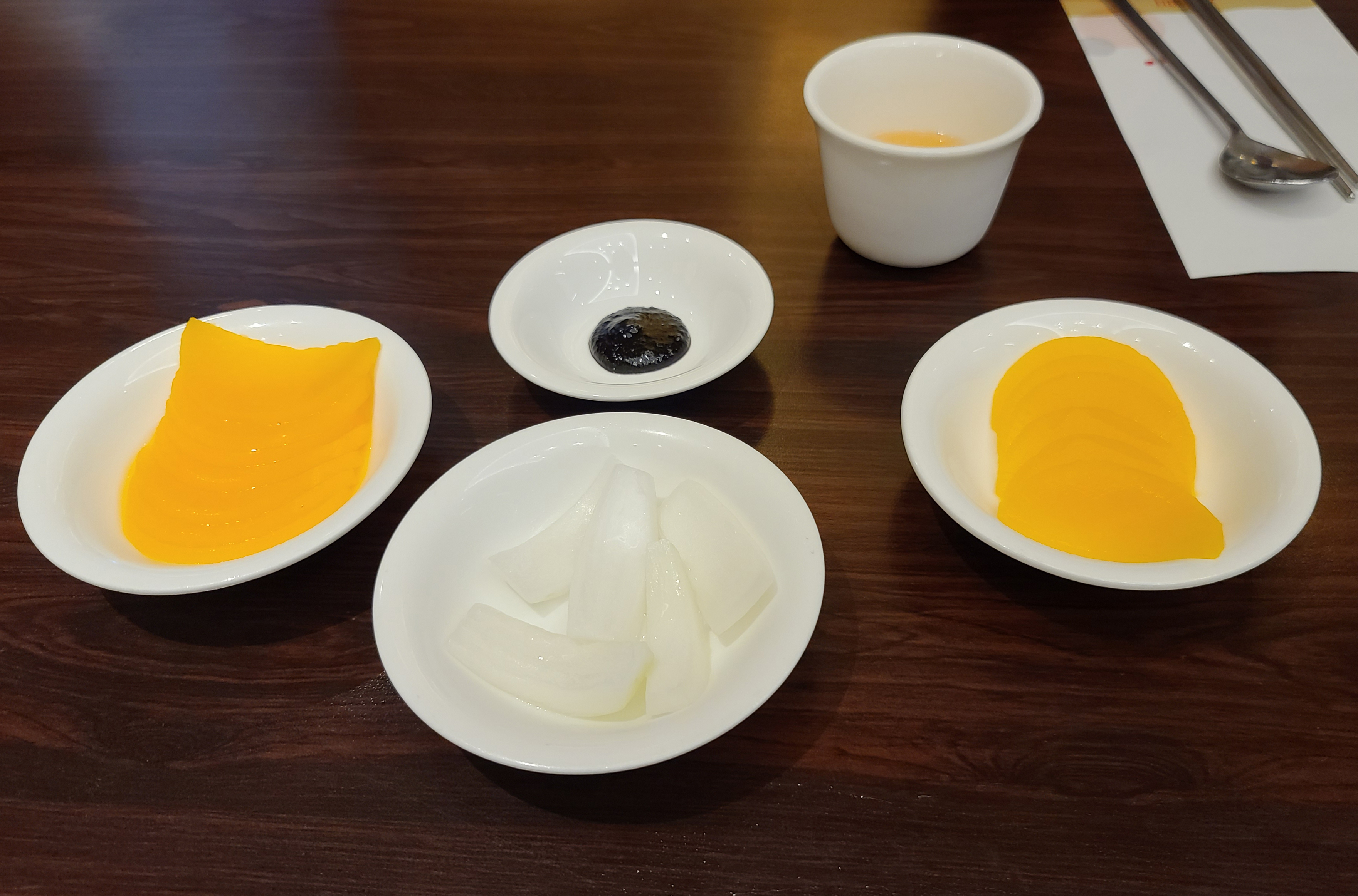 곧이어 제 차례가 왔고, 자리를 안내받아 식사할 자리로 이동하였습니다. 반찬은 양파와 단무지, 춘장이 제공되었으며 중식당답게 자스민차를 내어주었습니다. 주문한 간짜장은 달걀프라이가 올라간 형태였는데요, 한눈에 봐도 진하게 볶여져 나온 간짜장 소스는 보기만해도 군침이 돌았습니다.
