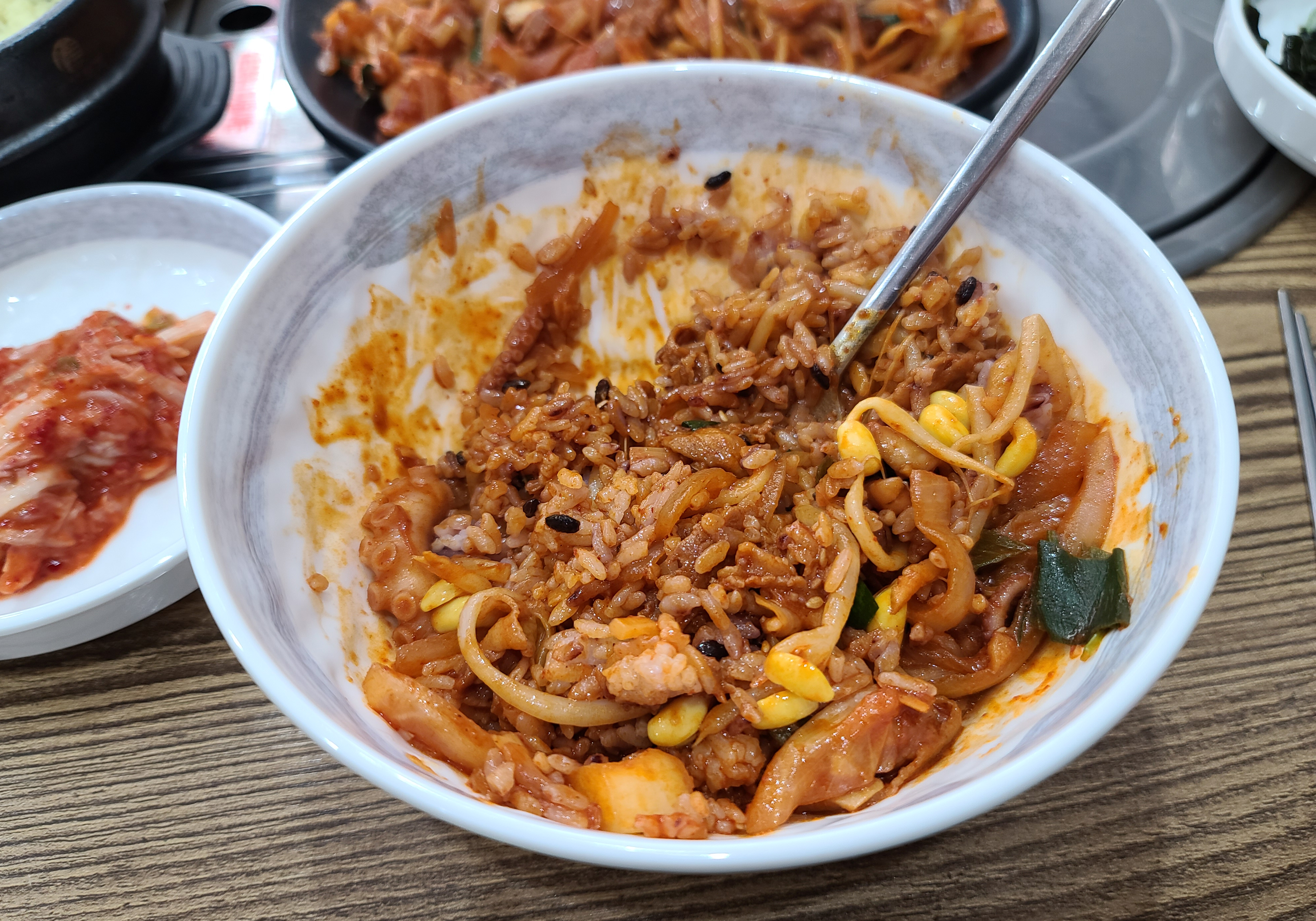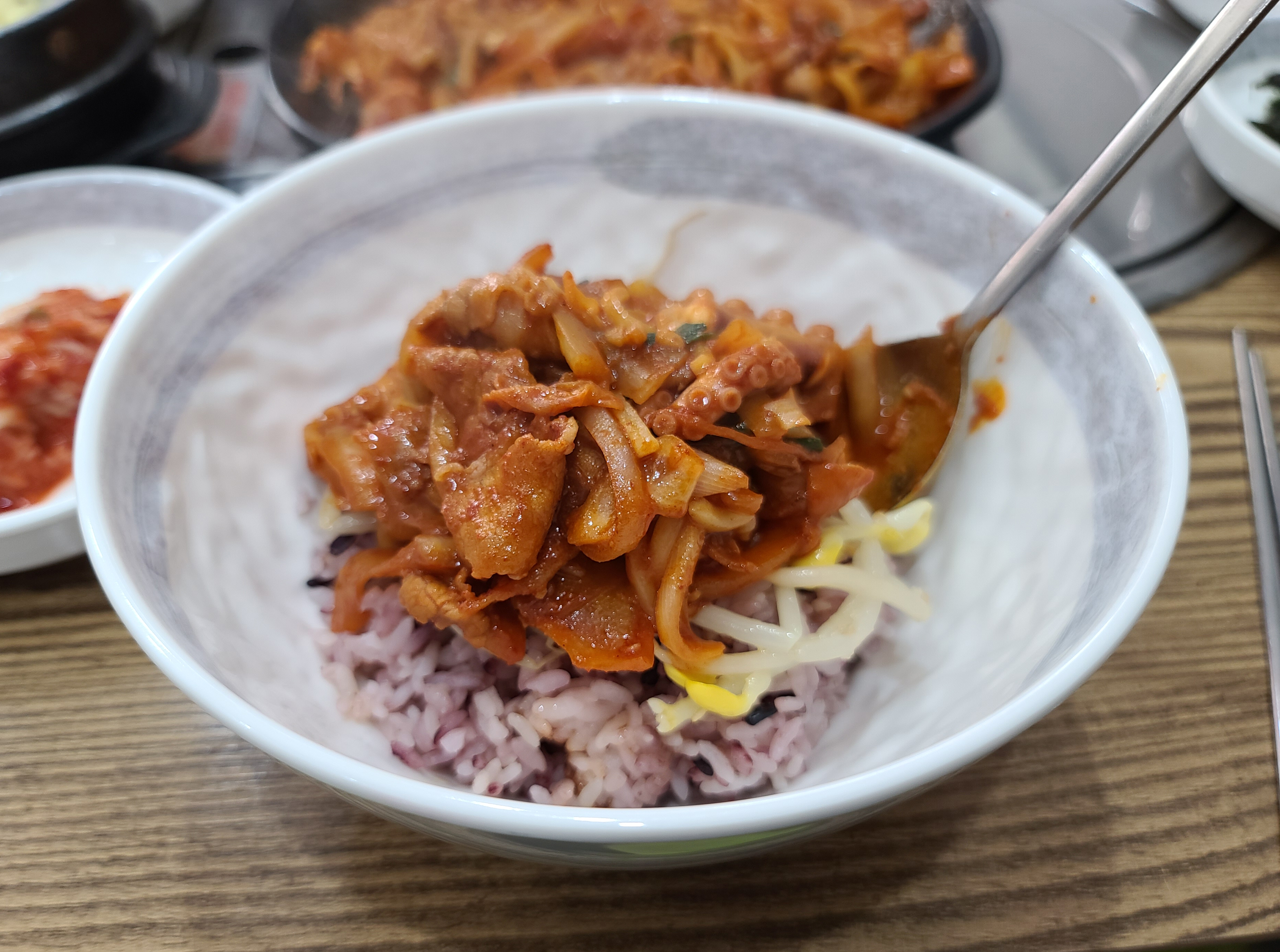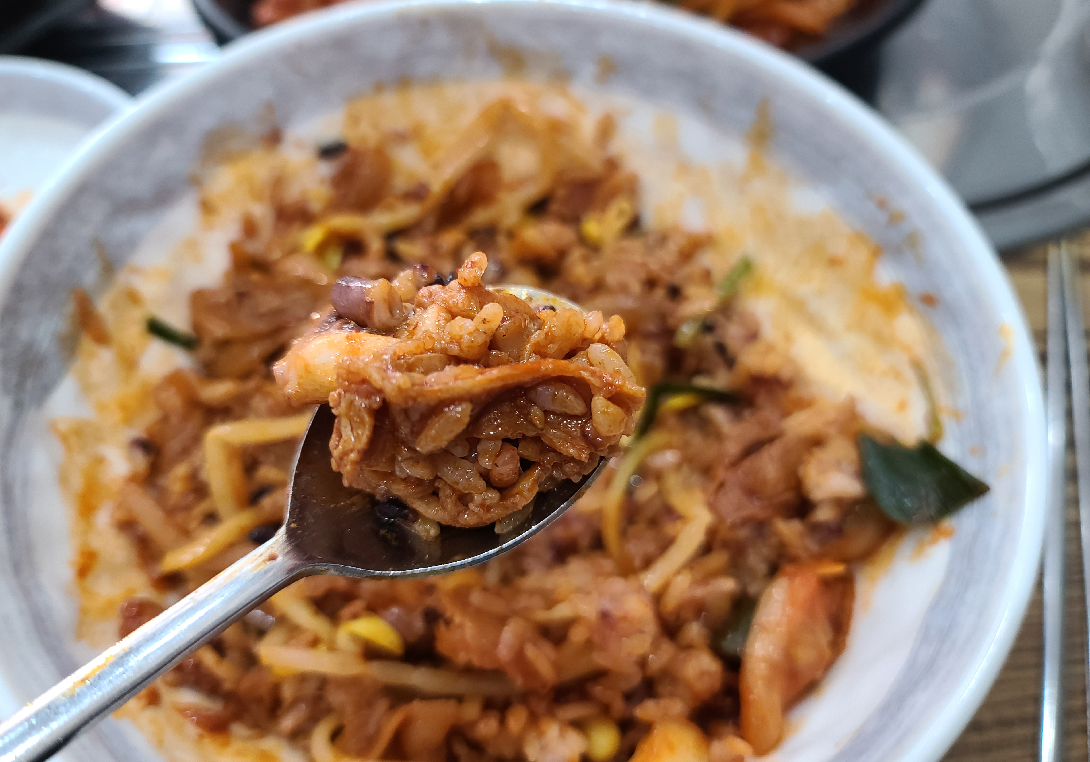 매콤한 불맛 나는 낙지볶음을 먹기 좋게 잘라준 뒤 같이 나오는 밥과 콩나물 위에 얹고 비벼먹으면 되었습니다. 처음으로 이용해본 가게였는데, 생각보다 맛이 괜찮았고 낙지도 꽤 넉넉하게 들어있어 좋았습니다.