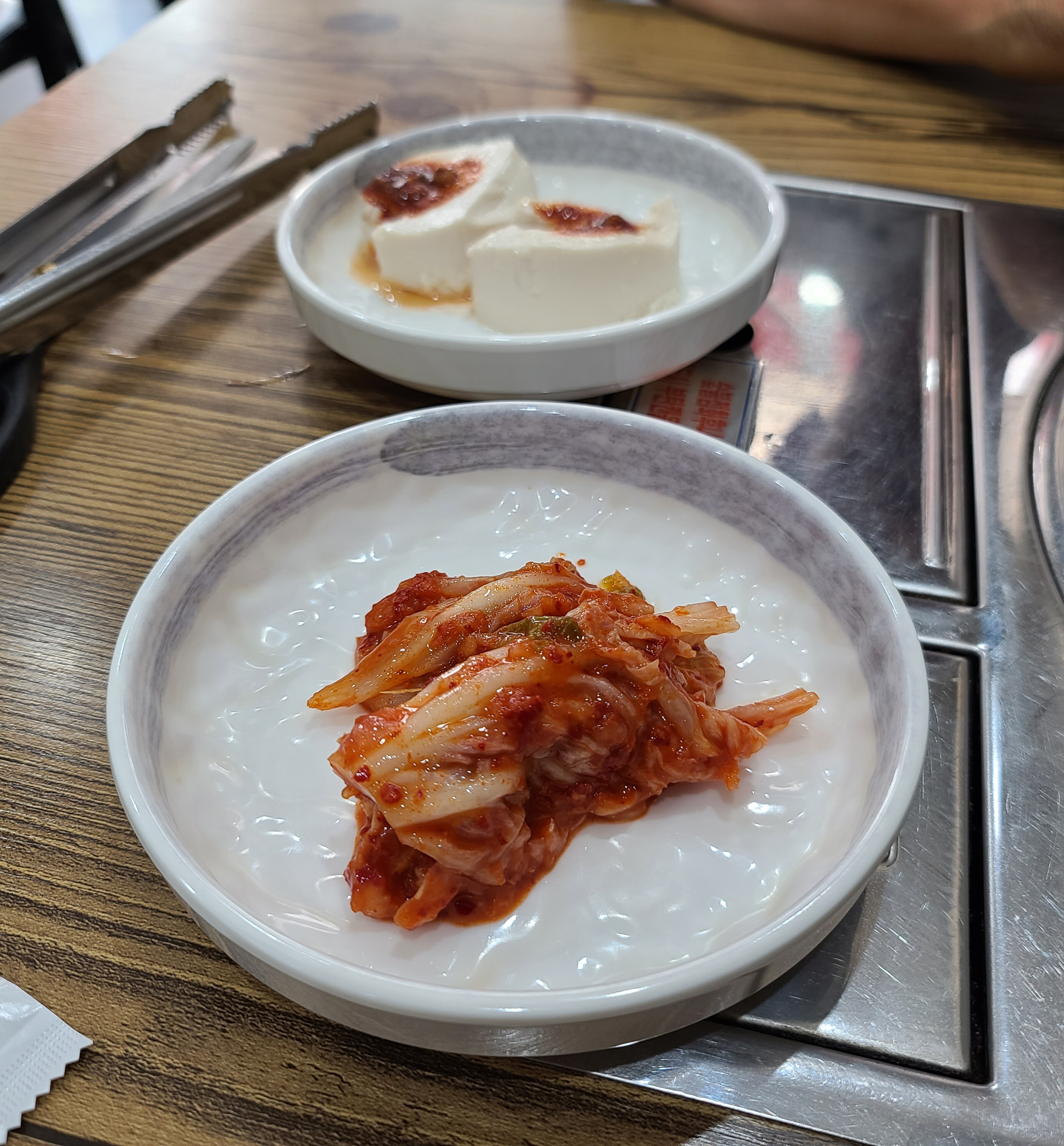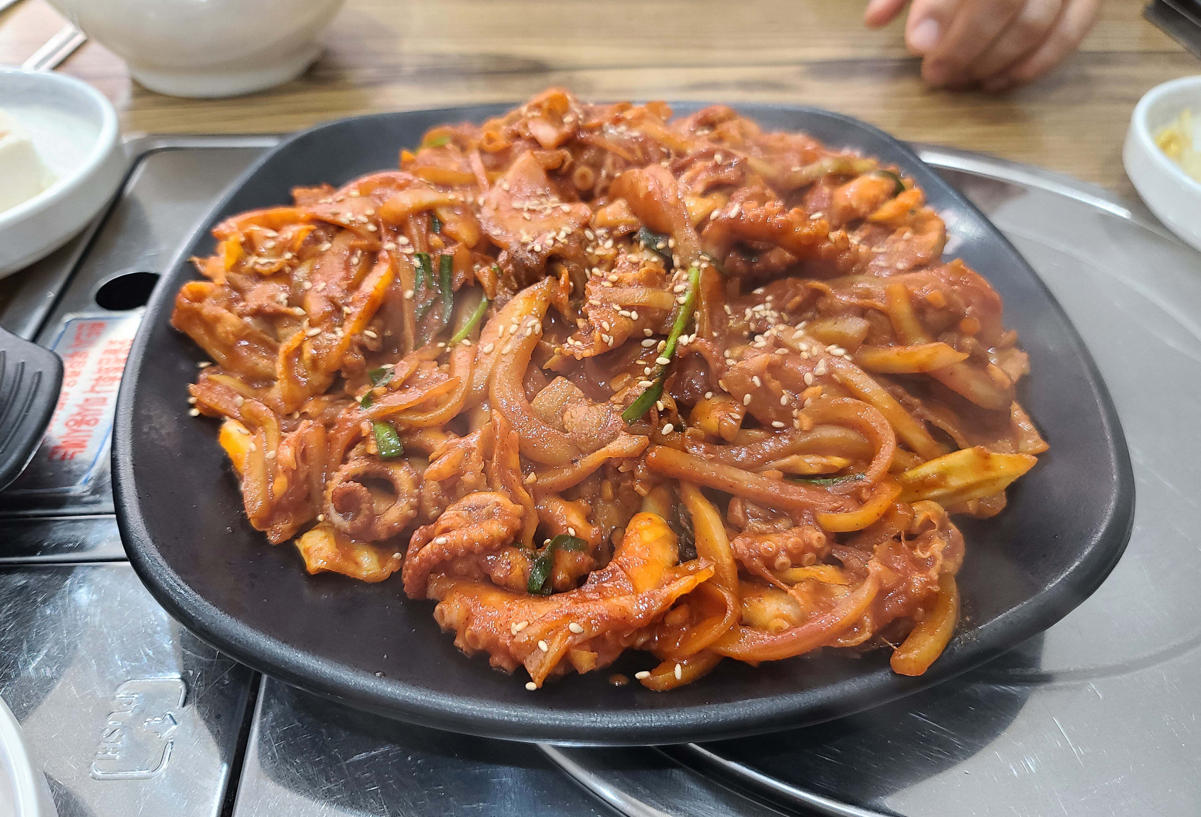 꽃낙지의 낙지볶음이 나오기 전, 반찬들로 두부, 배추김치, 콩나물, 미역무침, 계란찜이 나왔습니다. 계란찜은 가쓰오부시로 간을 내었는지 짭짤하면서도 고소한 향이 괜찮더라고요. 잠시 기다리니 기다리던 낙지볶음이 나왔습니다.