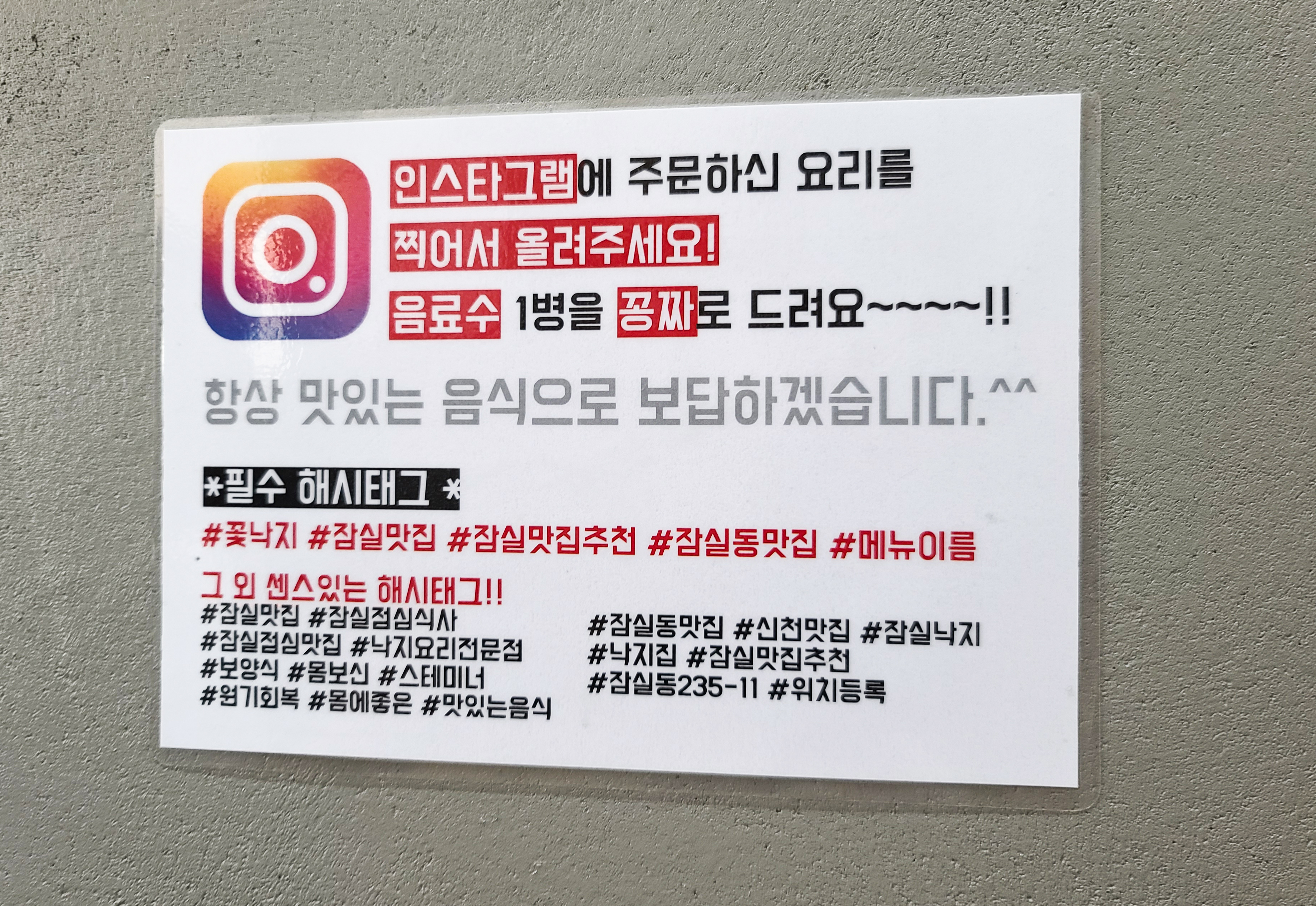 마침 인스타그램 해시태그 이벤트를 하고 있어서, 블로그 포스팅과는 별개로 음료수를 공짜로 받았습니다. (평소대로 블로그를 운영한다는 사실도 주인한테 밝히지 않고 말이죠.)