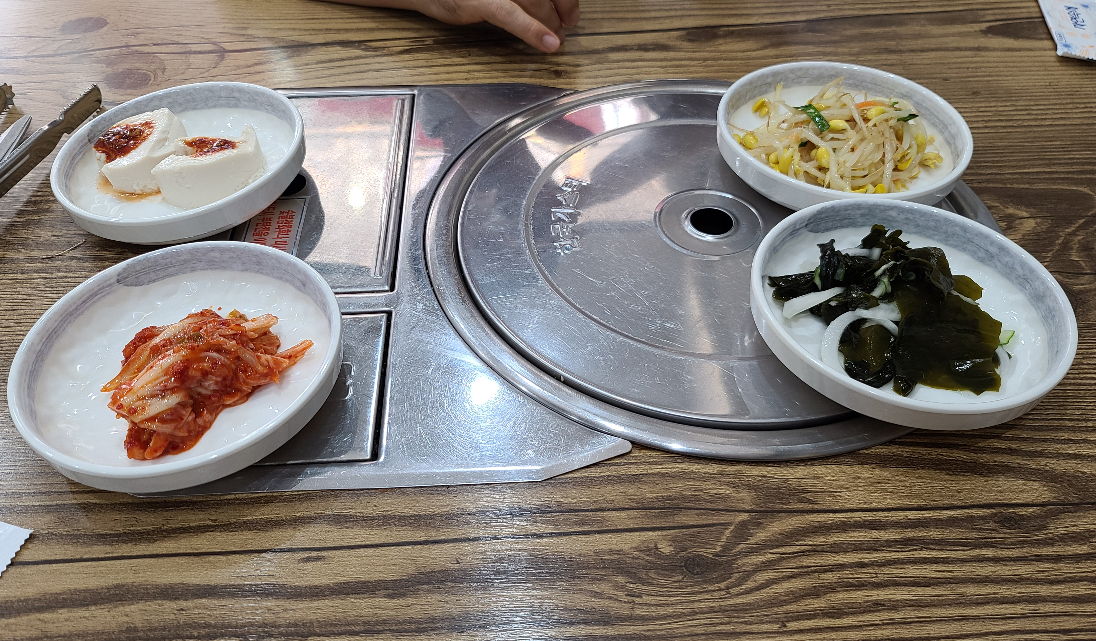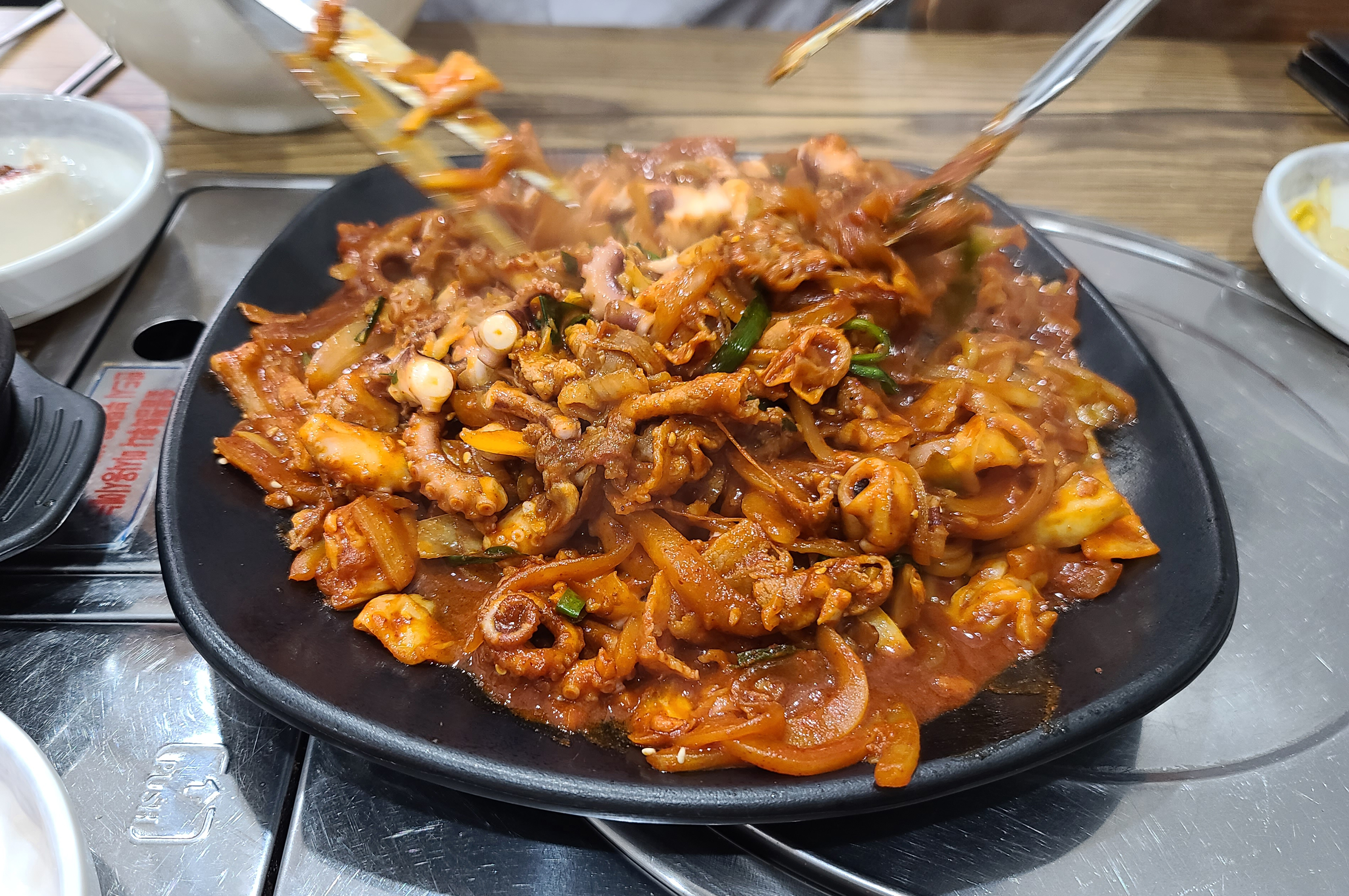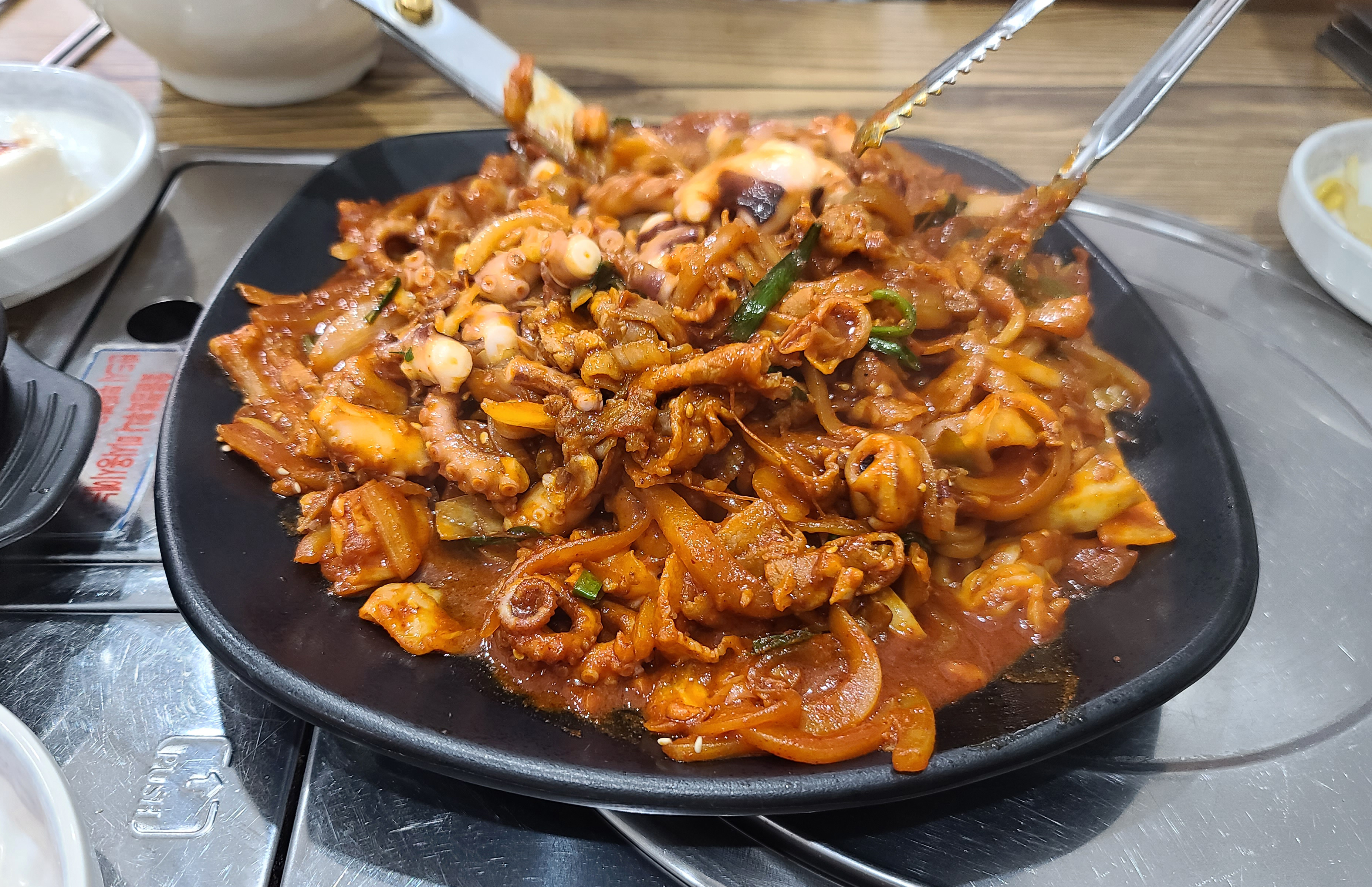 꽃낙지의 낙지볶음이 나오기 전, 반찬들로 두부, 배추김치, 콩나물, 미역무침, 계란찜이 나왔습니다. 계란찜은 가쓰오부시로 간을 내었는지 짭짤하면서도 고소한 향이 괜찮더라고요. 잠시 기다리니 기다리던 낙지볶음이 나왔습니다.