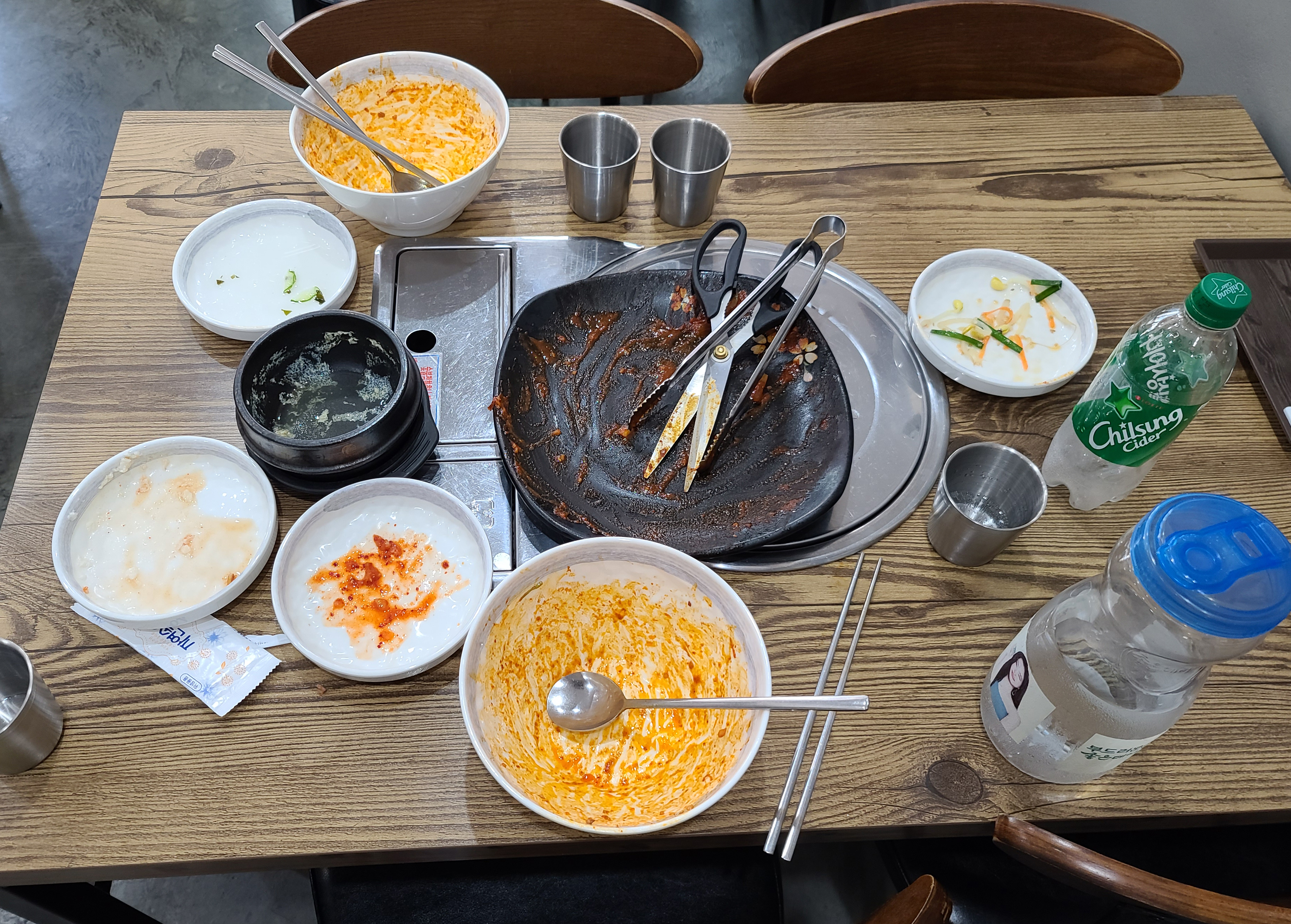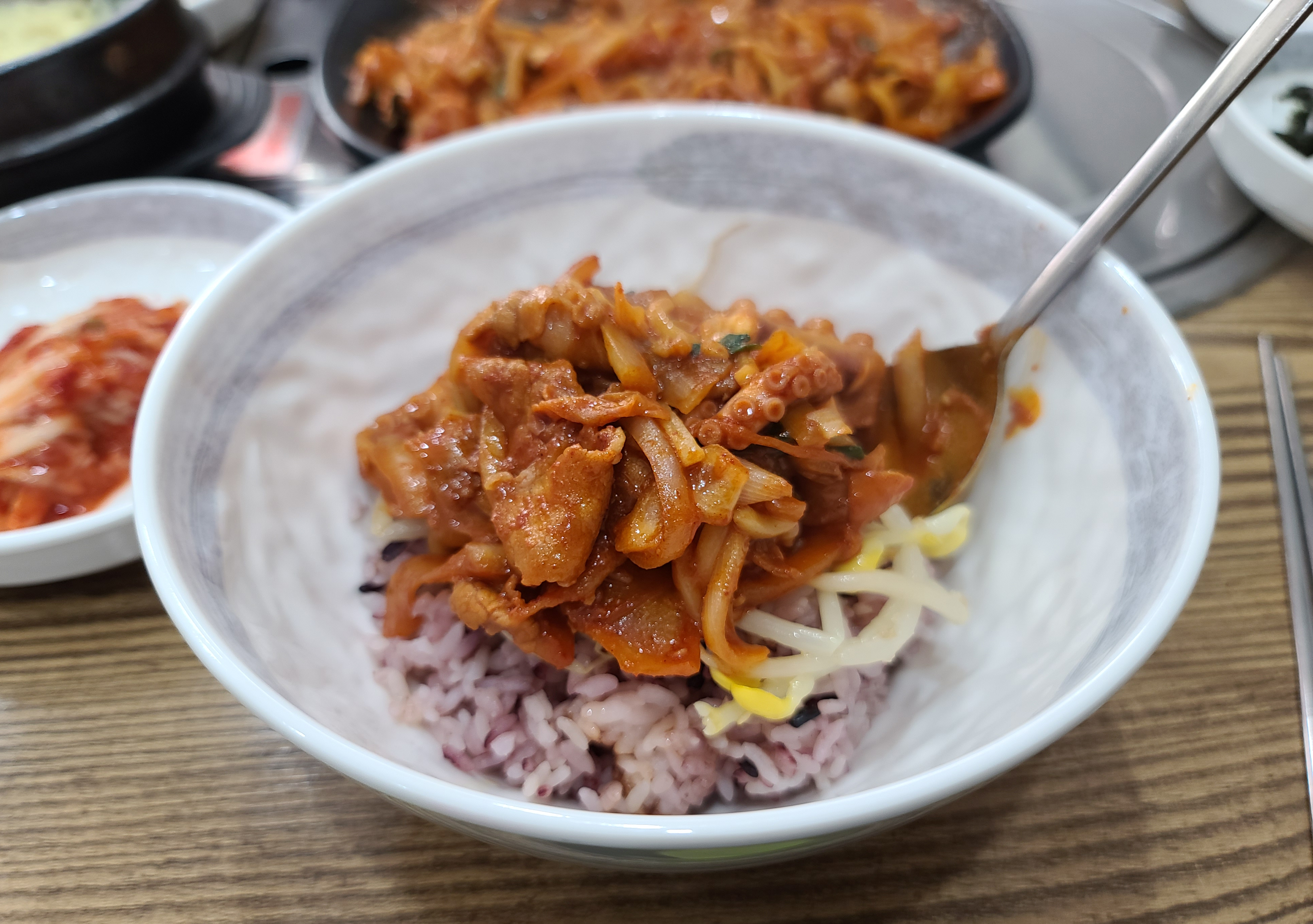 매콤한 불맛 나는 낙지볶음을 먹기 좋게 잘라준 뒤 같이 나오는 밥과 콩나물 위에 얹고 비벼먹으면 되었습니다. 처음으로 이용해본 가게였는데, 생각보다 맛이 괜찮았고 낙지도 꽤 넉넉하게 들어있어 좋았습니다.