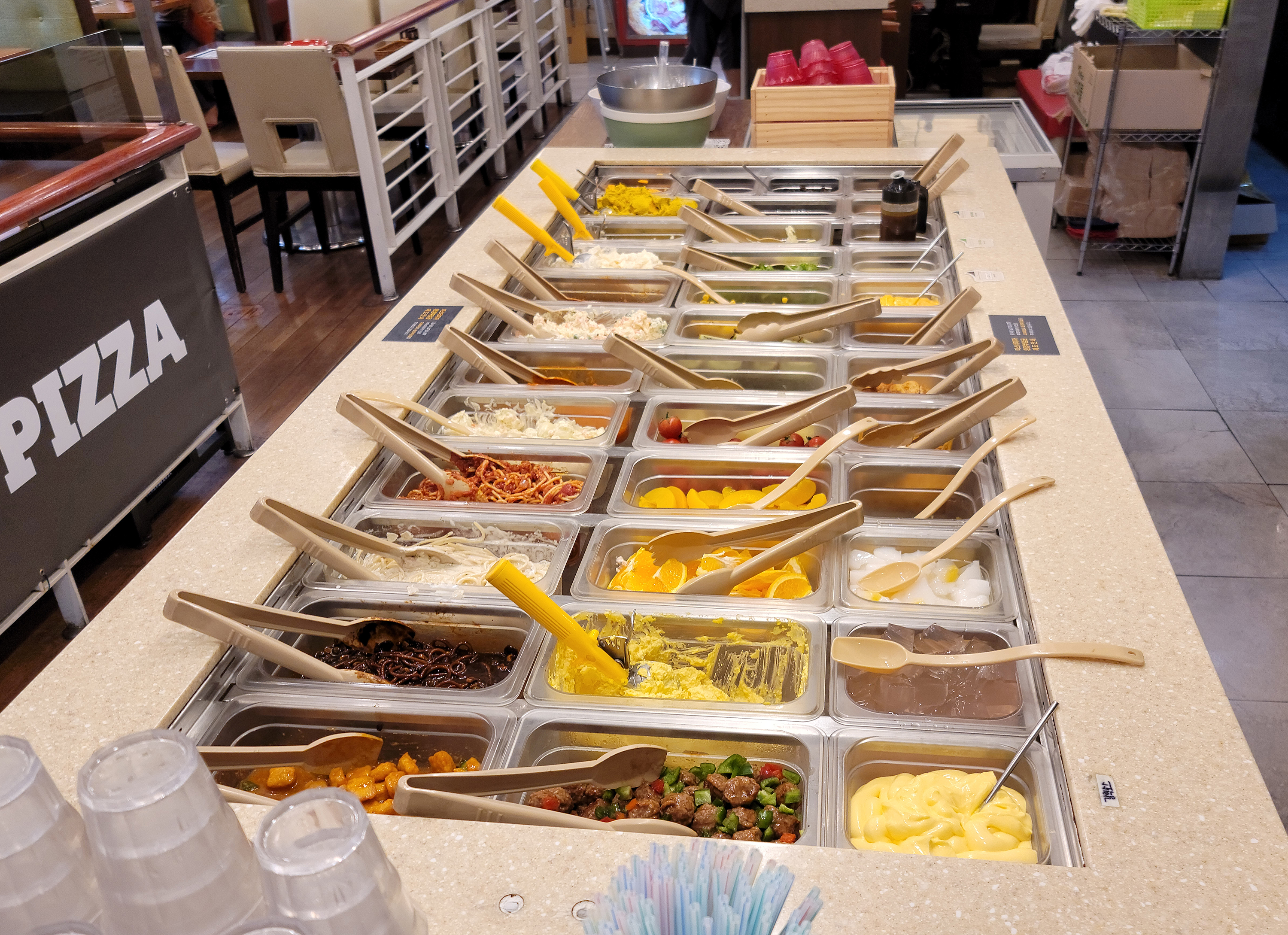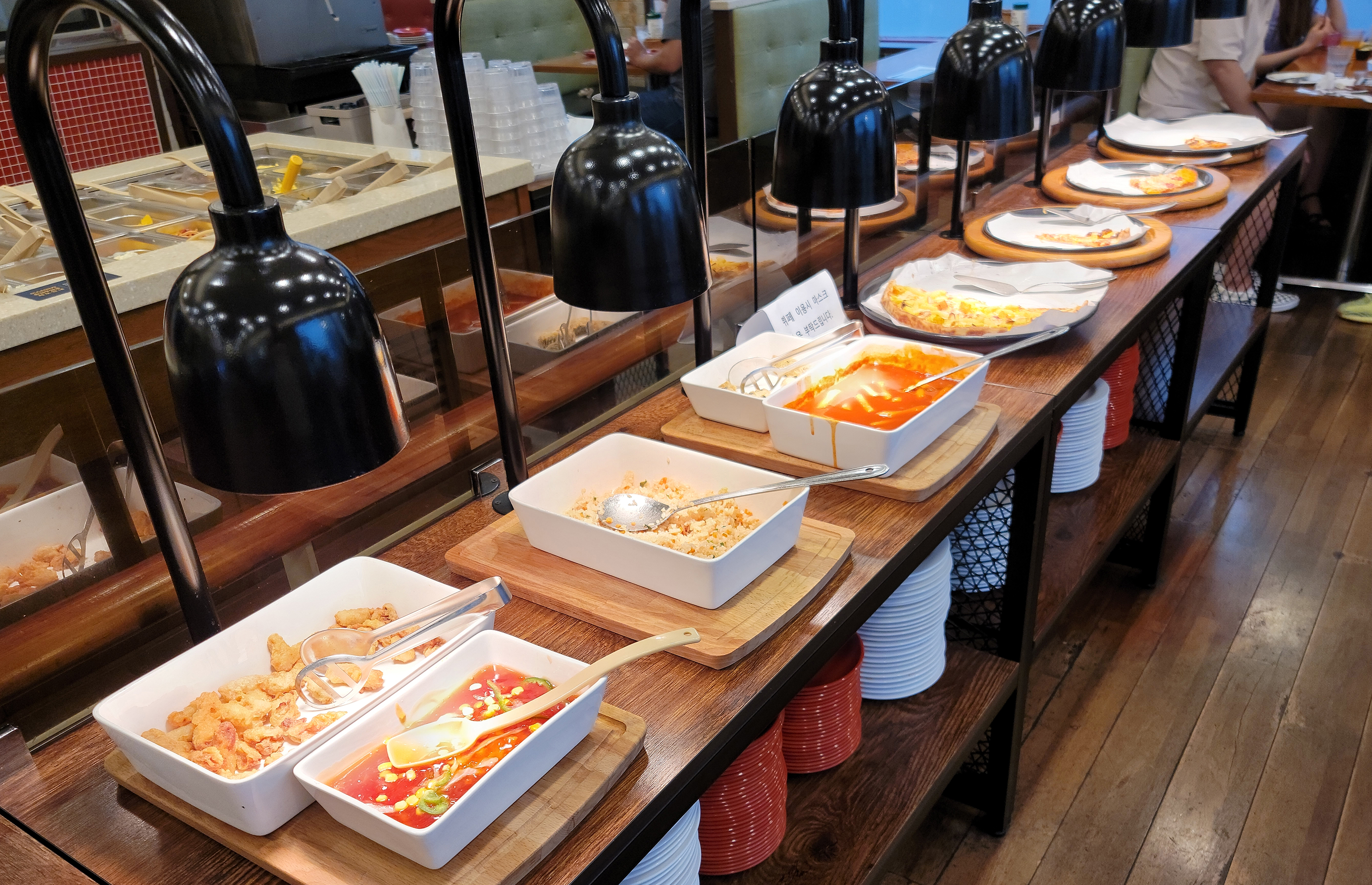 미스터피자 피자뷔페(샐러드바)는 샐러드바와 피자 코너로 나뉘어 있었으며, 샐러드는 달걀 샐러드, 감자 샐러드, 호박샐러드, 파스타, 나초 등 다양한 메뉴가 있었습니다. 피자는 그때그때 메뉴를 바꿔가며 나오는데, 사이드로 떡볶이나 볶음밥, 튀김 등을 선택할 수도 있었습니다.