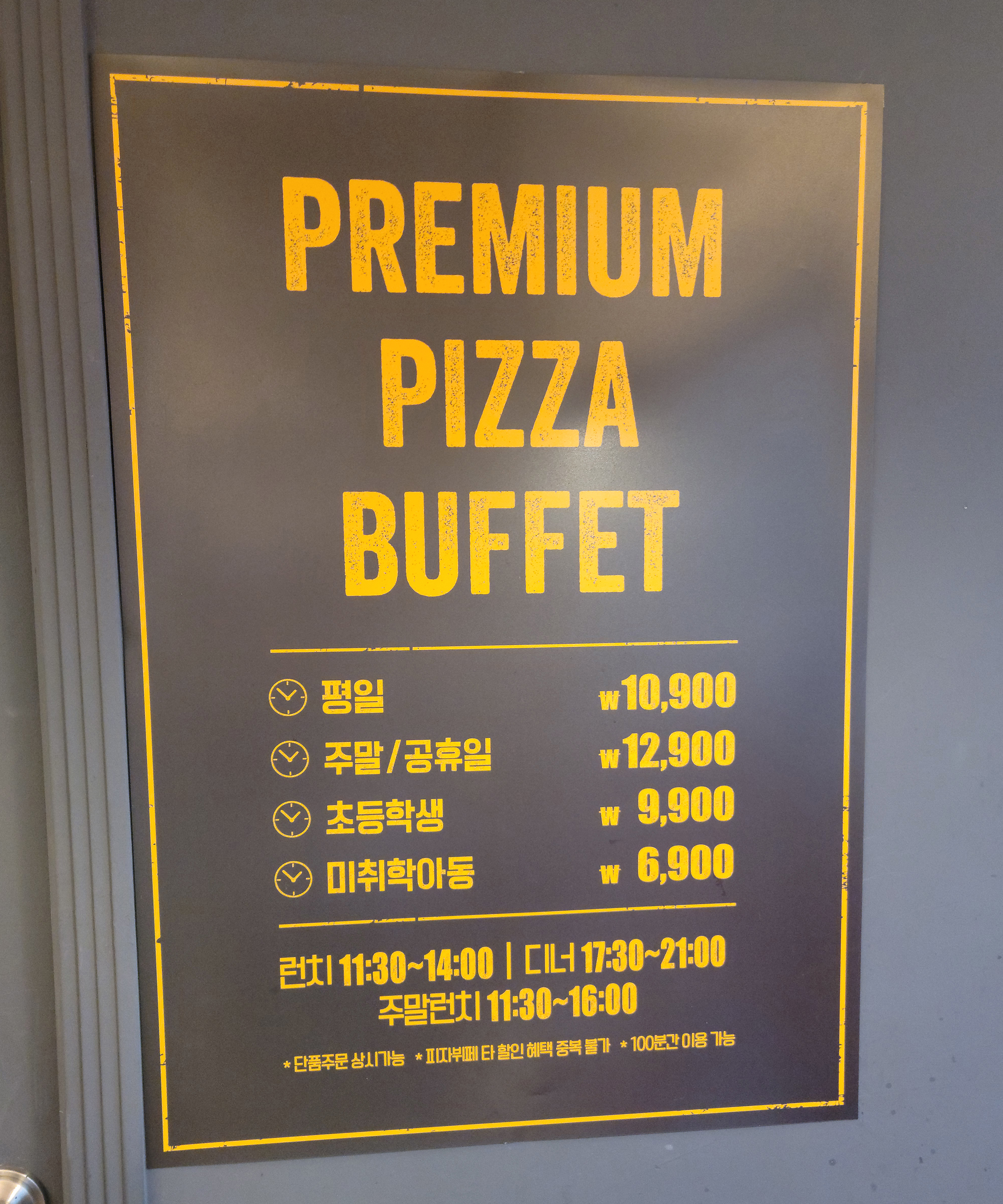 제가 이용한 미스터피자는 문정동에 위치한 피자 뷔페였으며, 가게가 위치한 건물 내 주차를 할 수는 있었지만, 꽤 불편해 보였습니다. 피자 뷔페는 성인 기준 평일 10,900원, 주말/공휴일은 12,900원, 초등학생 9,900원, 미취학 아동 6,900원 이었습니다. 나름 가격은 저렴한 것 같더라고요.
