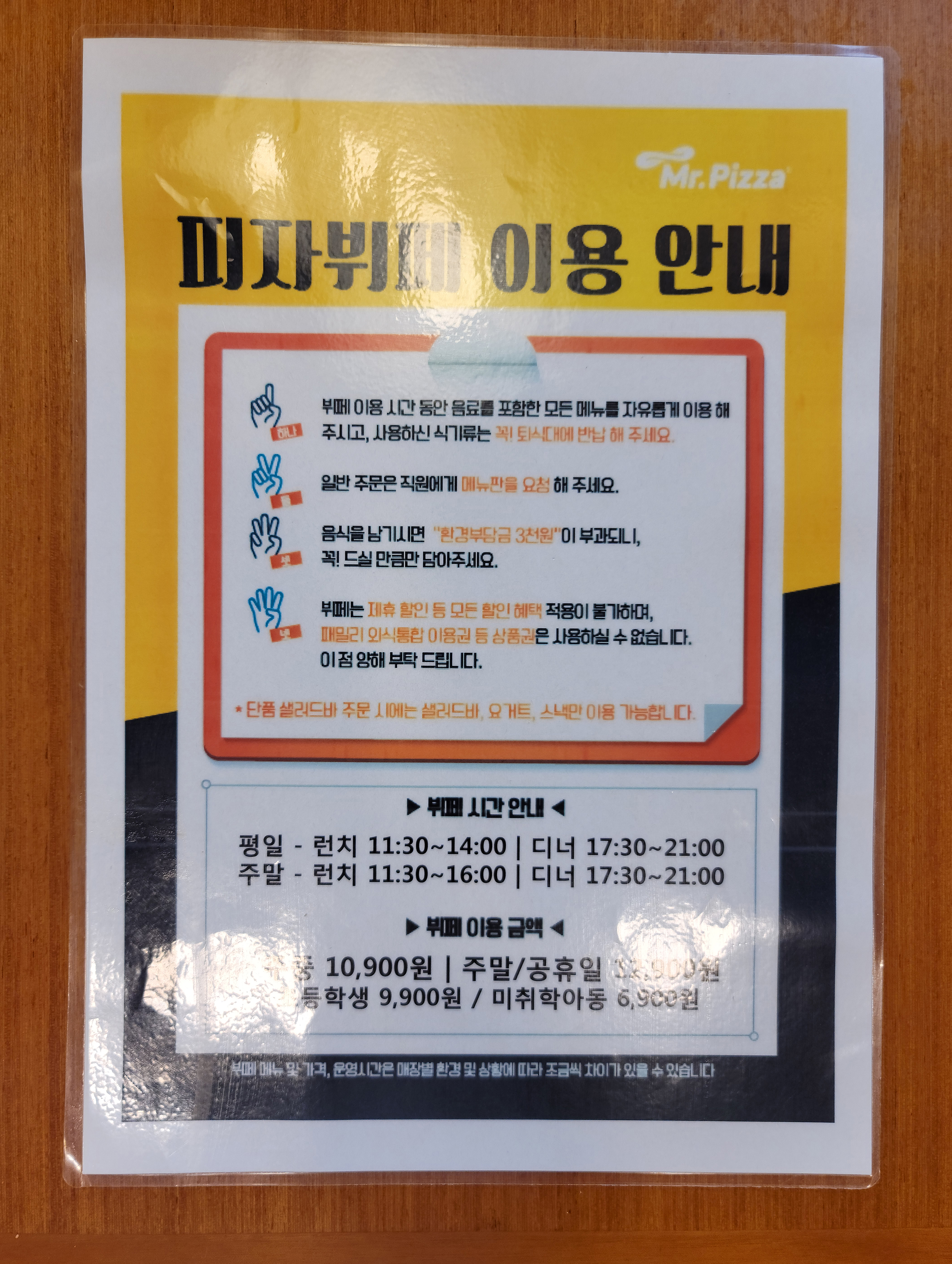 제가 이용한 미스터피자는 문정동에 위치한 피자 뷔페였으며, 가게가 위치한 건물 내 주차를 할 수는 있었지만, 꽤 불편해 보였습니다. 피자 뷔페는 성인 기준 평일 10,900원, 주말/공휴일은 12,900원, 초등학생 9,900원, 미취학 아동 6,900원 이었습니다. 나름 가격은 저렴한 것 같더라고요.