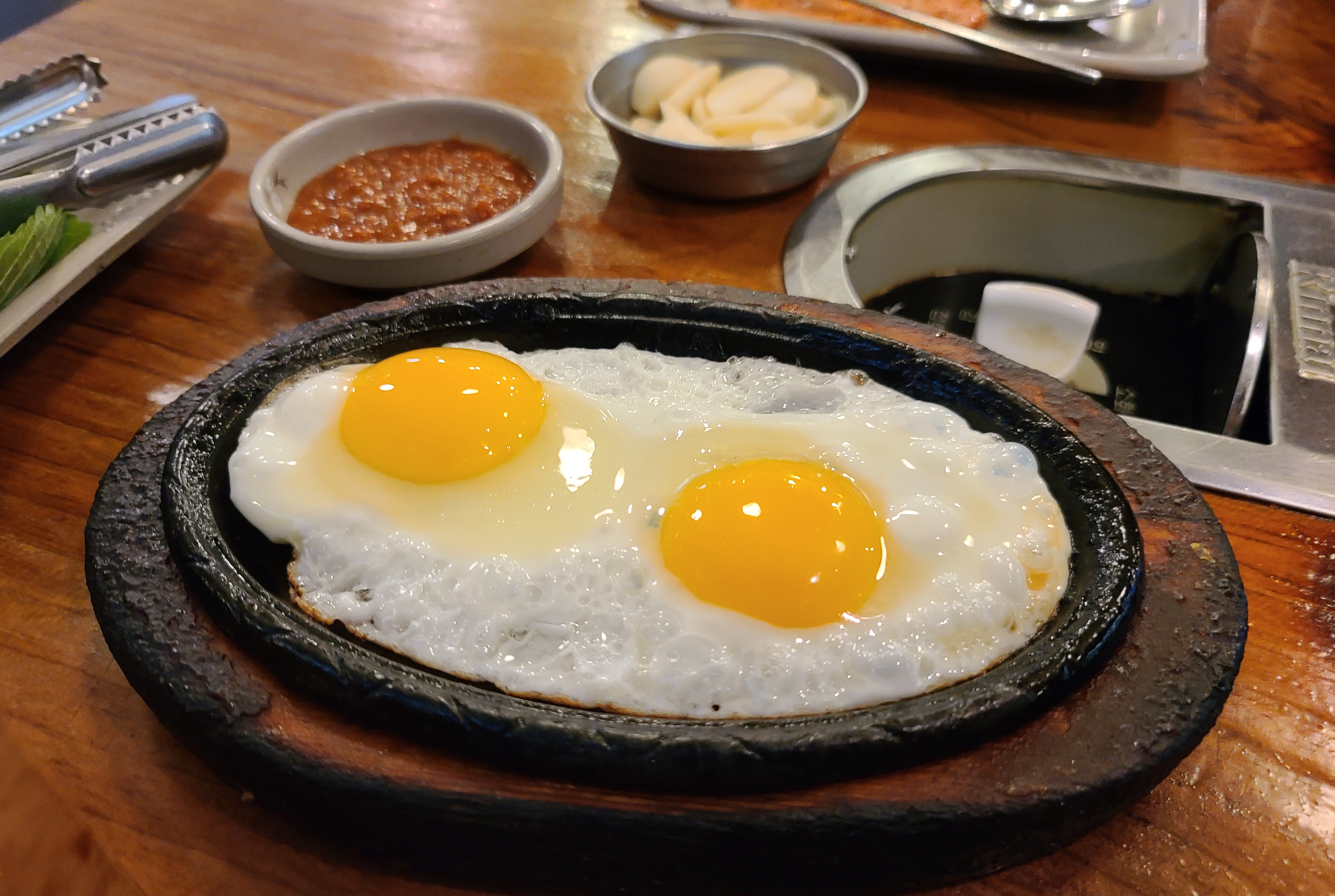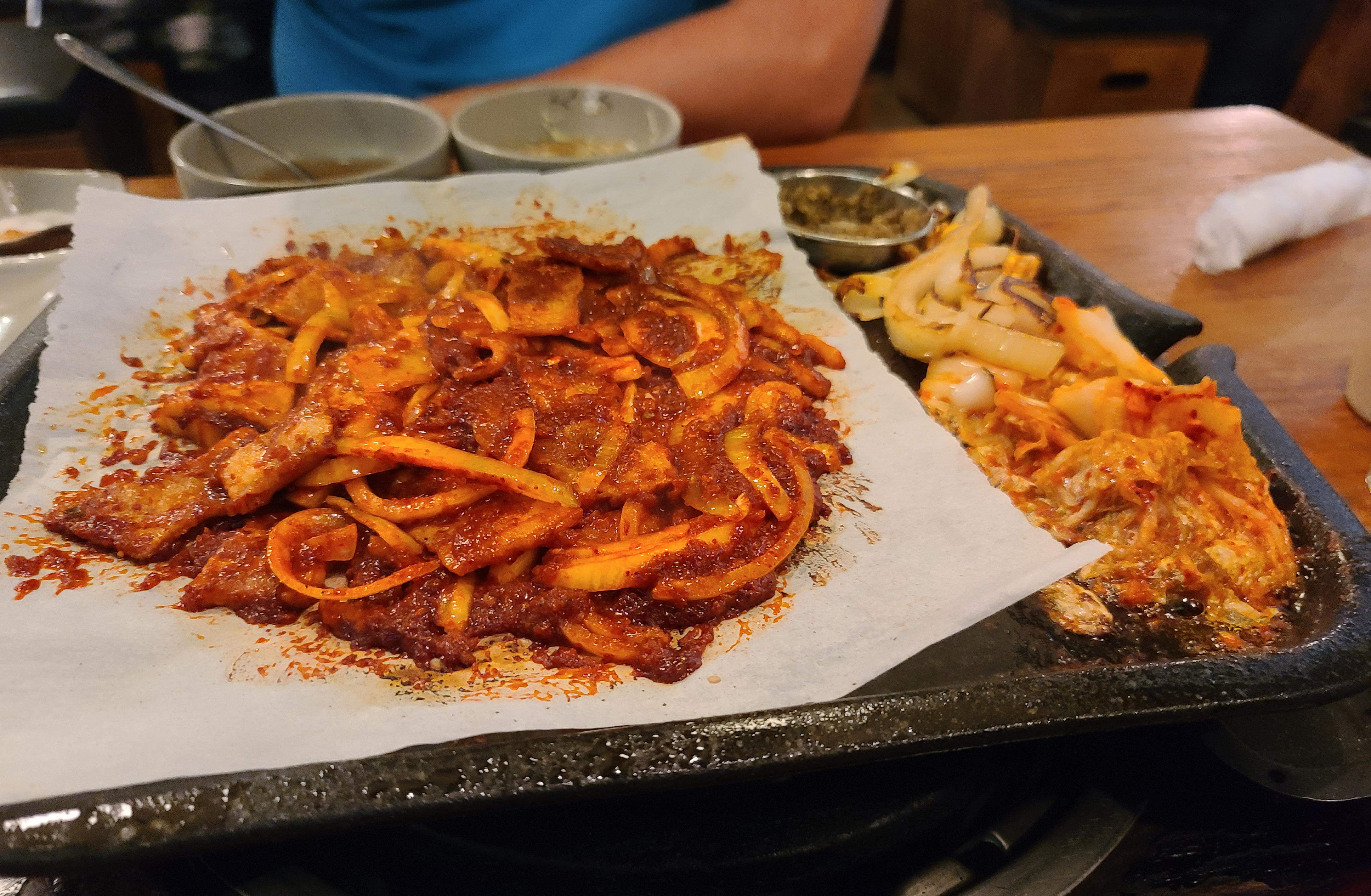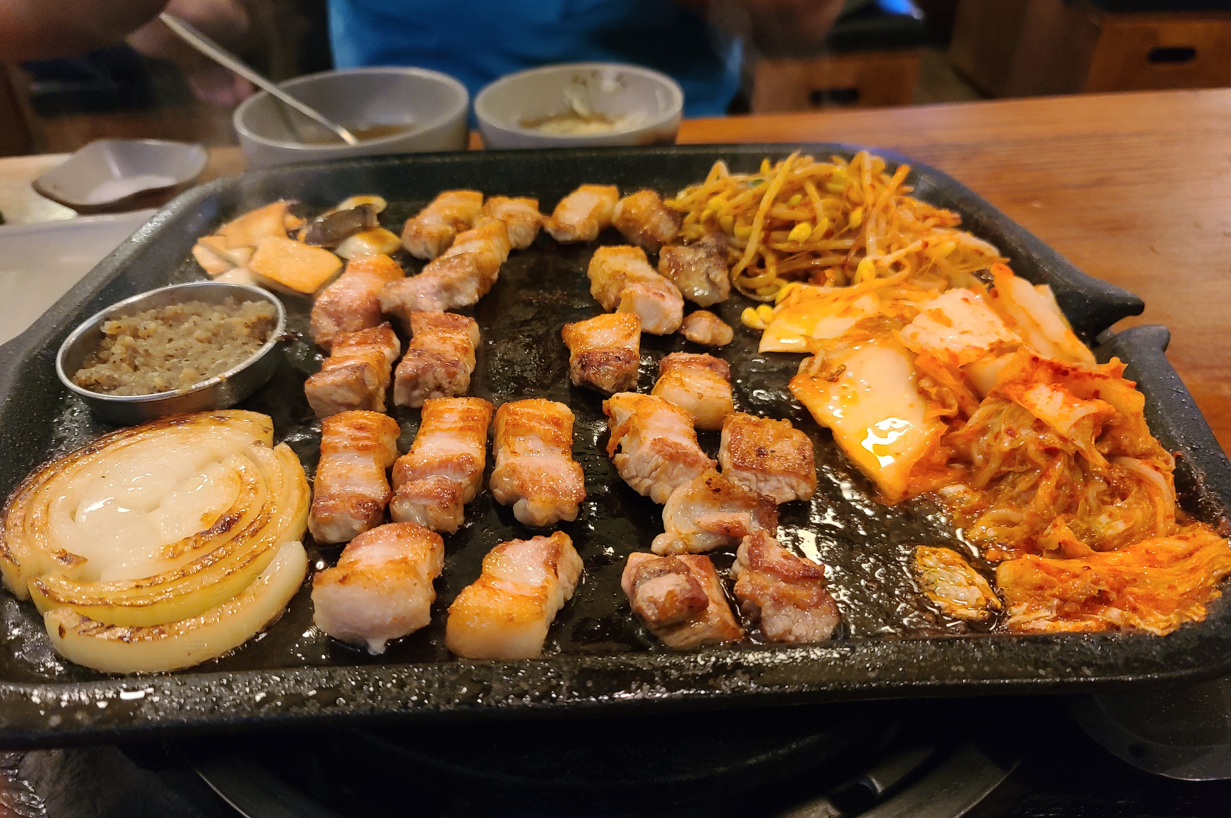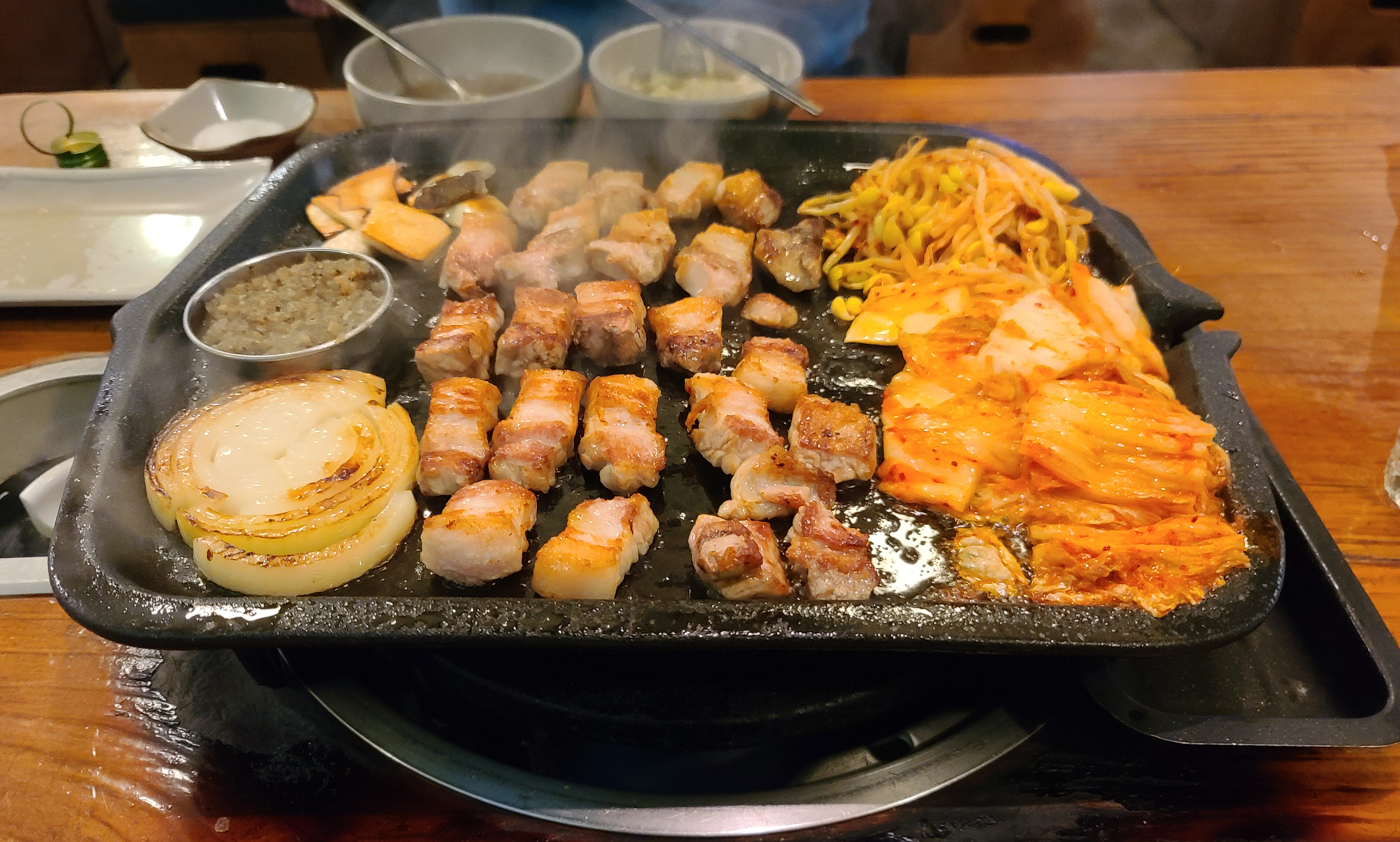노릇노릇 한 입 크기로 썰어놓은 도톰한 삼겹살은 초벌하여 익혀 나왔으며, 콩나물과 김치, 양파, 버섯까지 같이 익혀주어 먹기에 편했습니다. 특히 다진 양파와 후추를 섞어 만든 양념장은 고기와 같이 곁들이기에 괜찮은 메뉴였습니다.