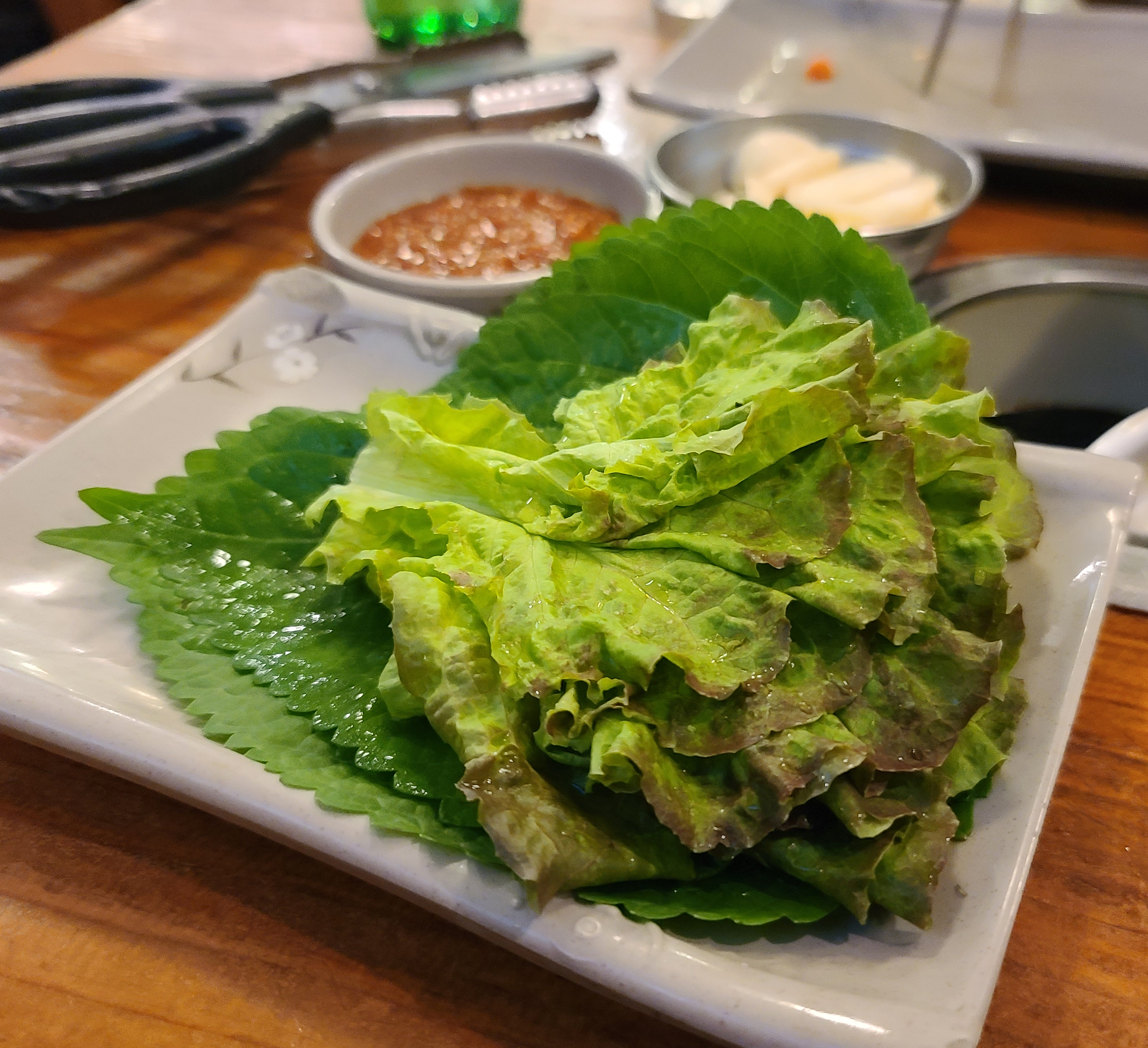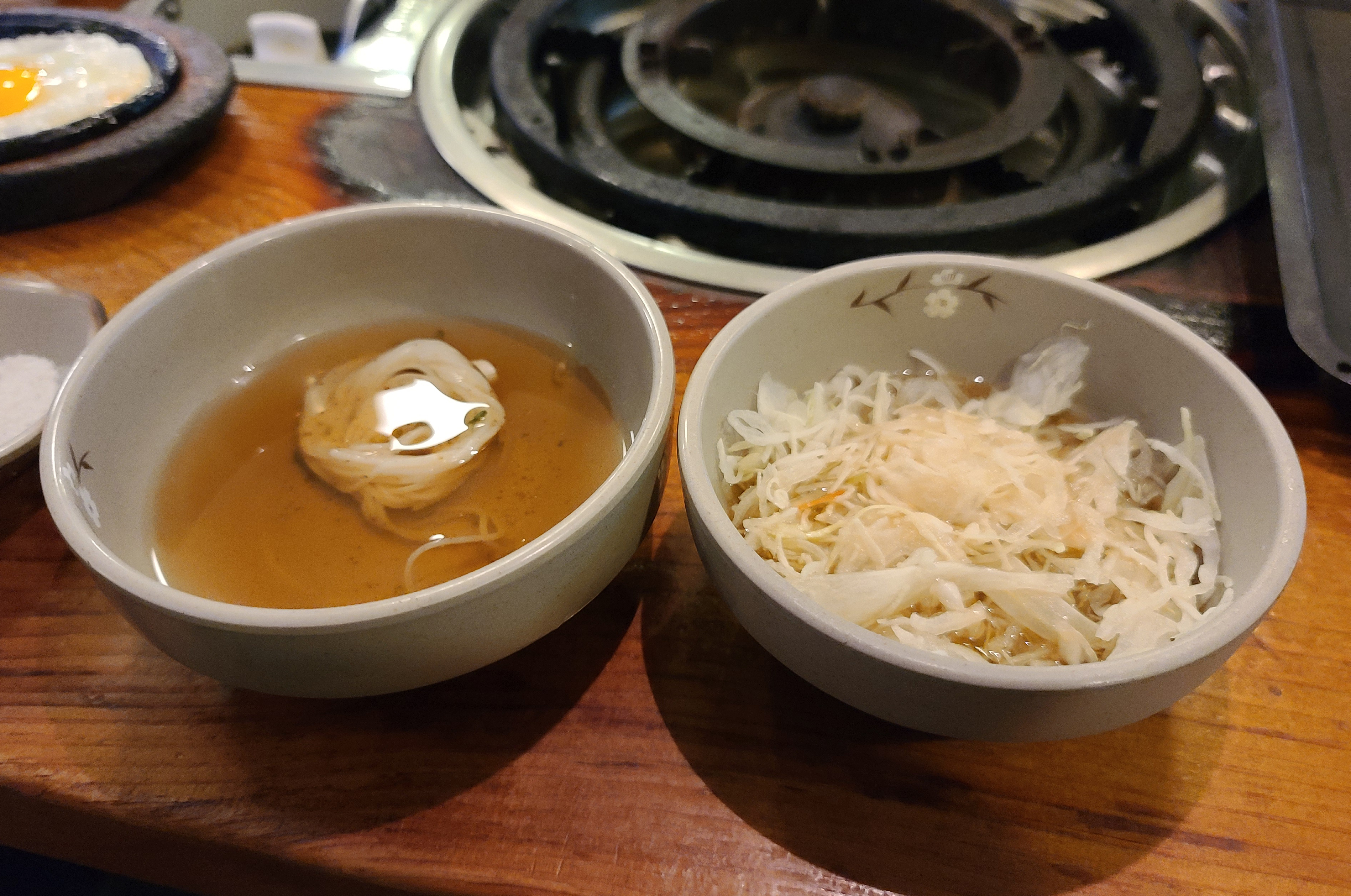 참고로 불타는 삼겹살은 고기를 초벌 하여 가져다주시기 때문에, 주문후 고기익는 시간이 따로 걸립니다. 밑반찬으로 소면과 양배추(소스), 달걀프라이, 김치전 등이 나왔습니다.