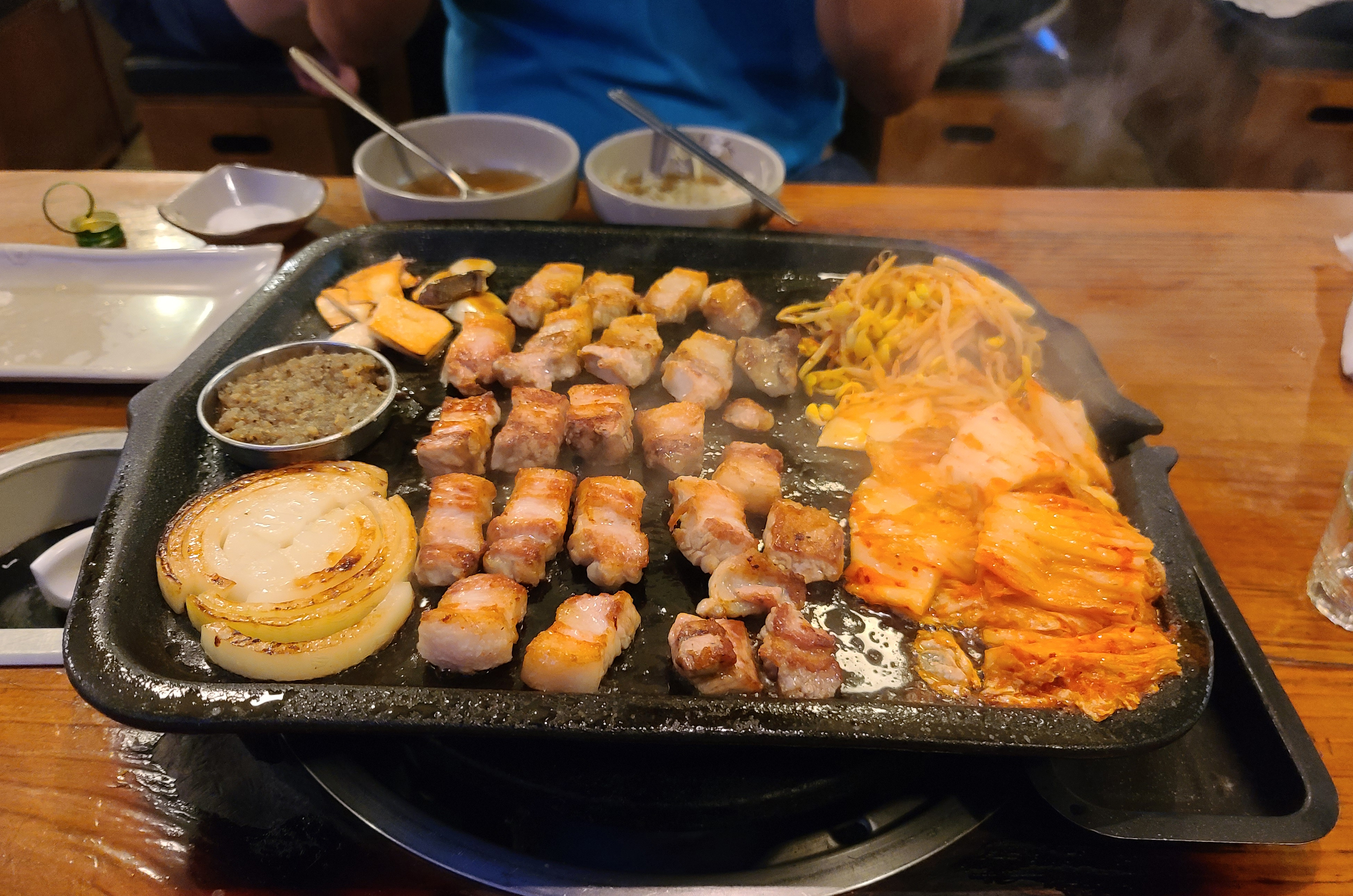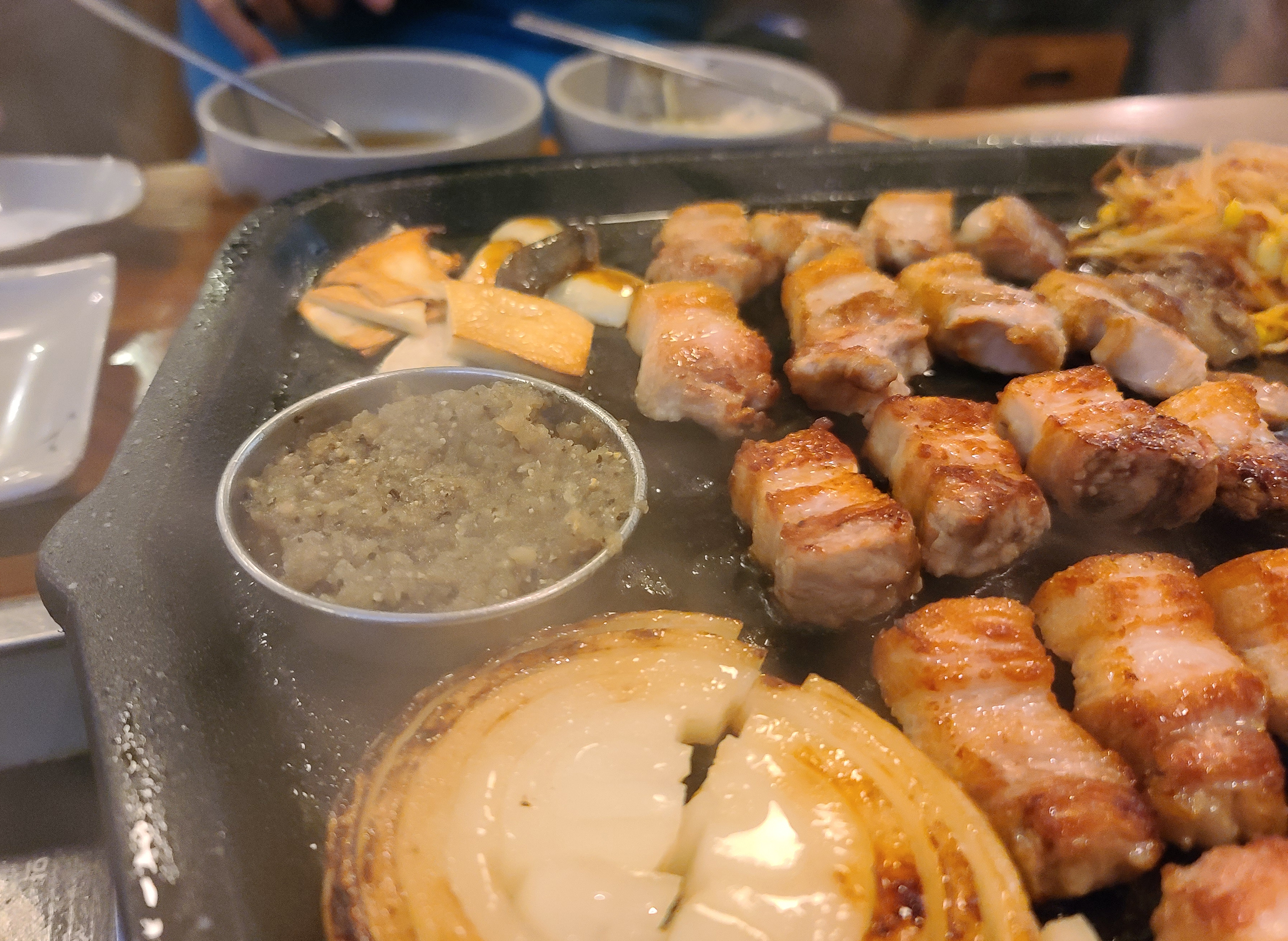 노릇노릇 한 입 크기로 썰어놓은 도톰한 삼겹살은 초벌하여 익혀 나왔으며, 콩나물과 김치, 양파, 버섯까지 같이 익혀주어 먹기에 편했습니다. 특히 다진 양파와 후추를 섞어 만든 양념장은 고기와 같이 곁들이기에 괜찮은 메뉴였습니다.