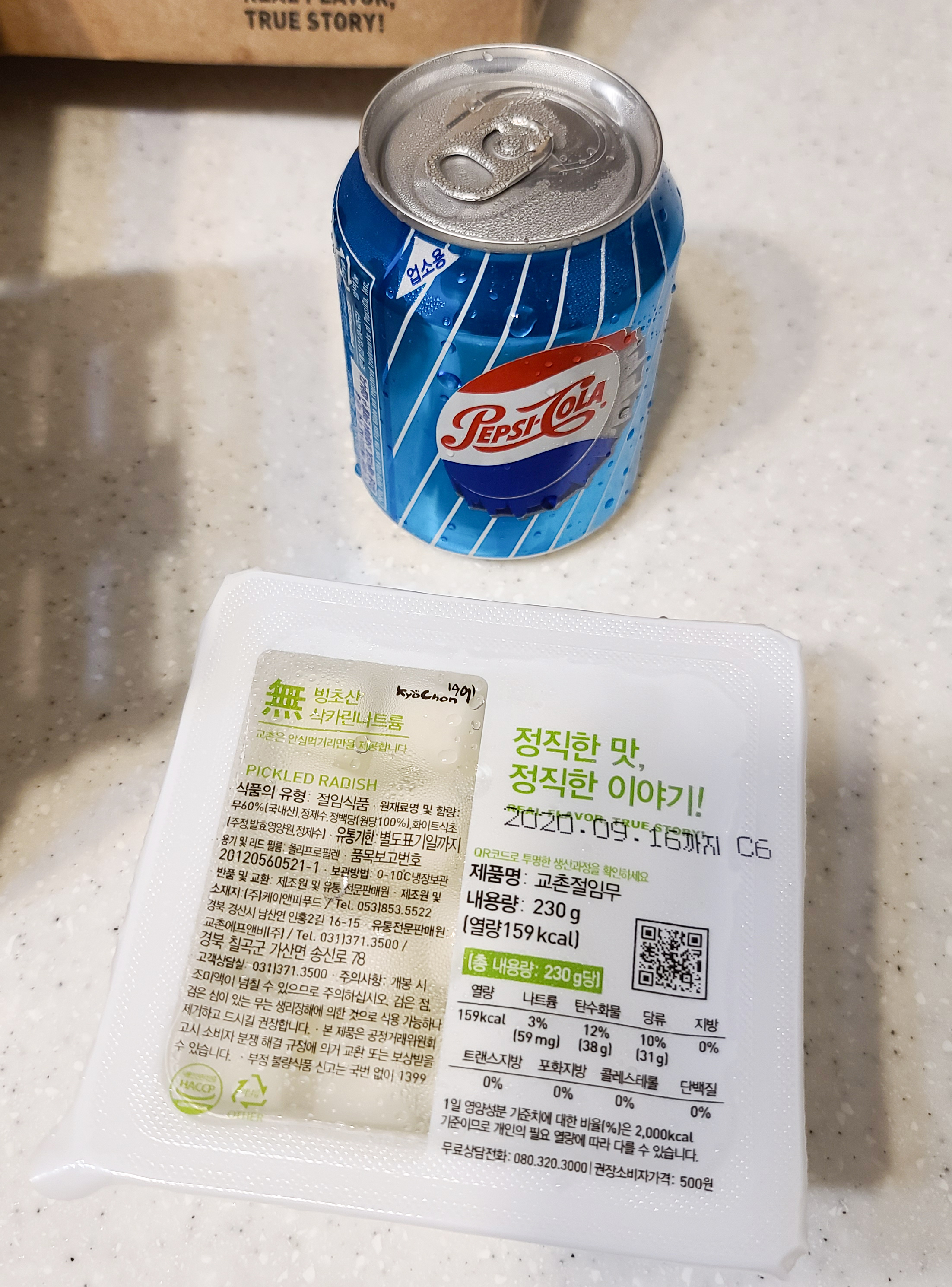 허니오리지날 치킨은 바삭하게 튀겨낸 교촌 오리지널 치킨에 허니소스를 곁들인 메뉴인데, 가격은 교촌 오리지날 치킨과 같습니다. 요즘 이상하게 탄산음료가 당기지 않아서 탄산음료는 잘 안 먹게 되더라고요. 치킨무는 원래 있어도 안 먹었고요. (그래도 사진 촬영을 위해 치킨무를 개봉했습니다.)