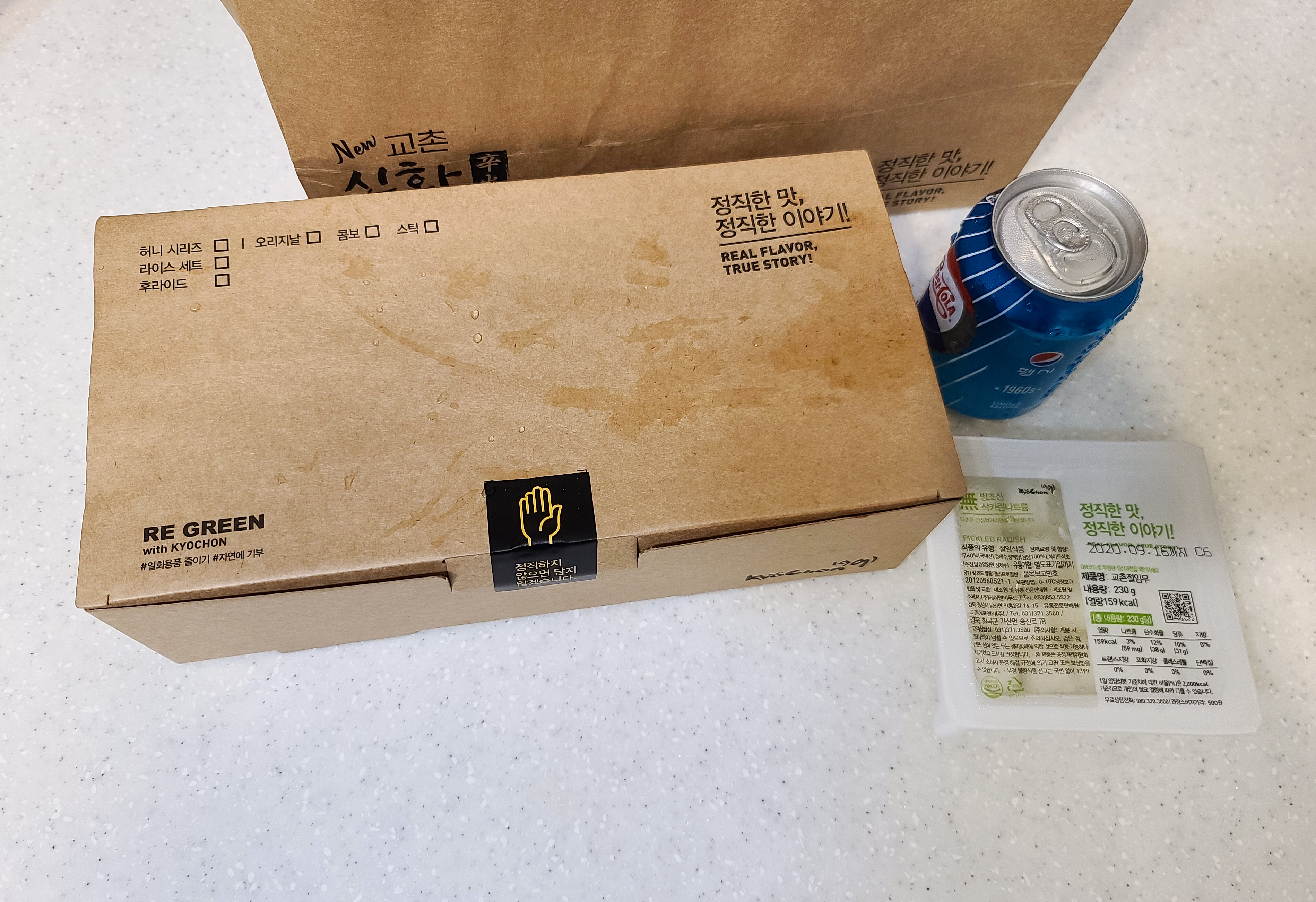교촌치킨을 배달 주문하면, 위처럼 박스 포장이 잘 되어 옵니다. 종이상자에 박스 포장까지 패키지 하나만큼은 타 치킨집보다 깔끔하고 좋은 것 같습니다. 교촌 허니오리지날 치킨의 사이드로 콜라와 치킨무가 함께 왔습니다.