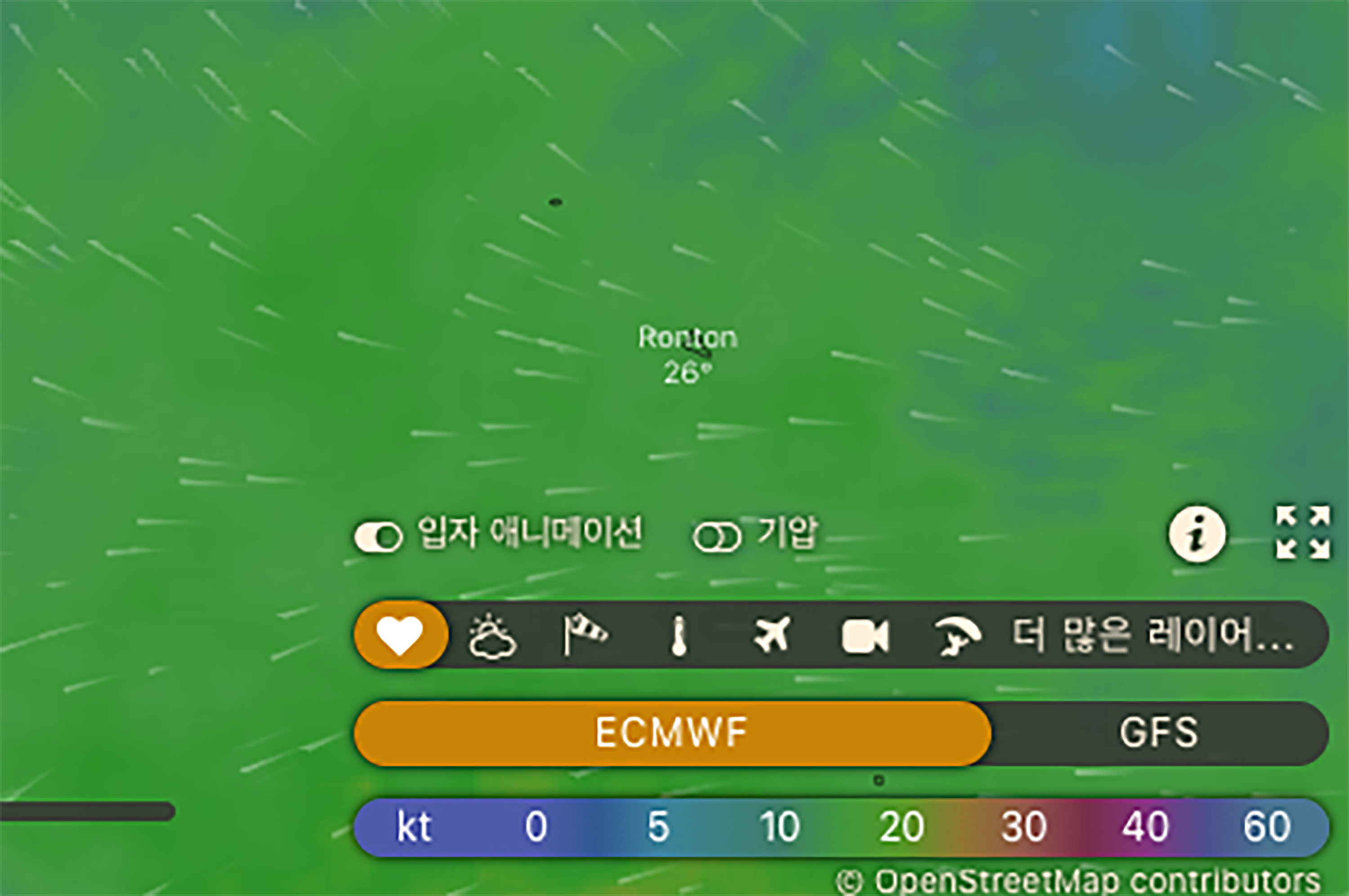 윈디 사이트를 보시면, 각 모서리에 메뉴가 위치하고 있습니다. 구성은 날씨뉴스, 허리케인추적기, 내위치찾기, 거리및계획, 레이더위성, 바람, 돌풍, 비/번개, 온도, 구름, 파도, 대기질, 애니메이션, 기압, ECMWF/GFS 등 날씨정보를 손쉽게 확인할 수 있도록 마련되어 있었습니다. 저는 이 부분이 오히려 어스널스쿨 사이트보다 좀 더 편리한 것 같아 좋더라고요.