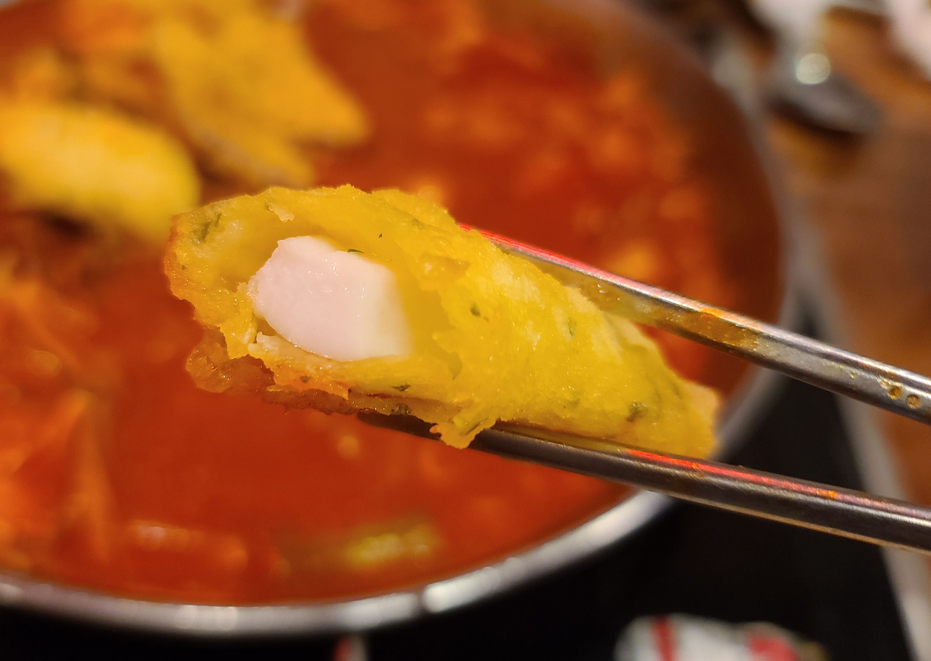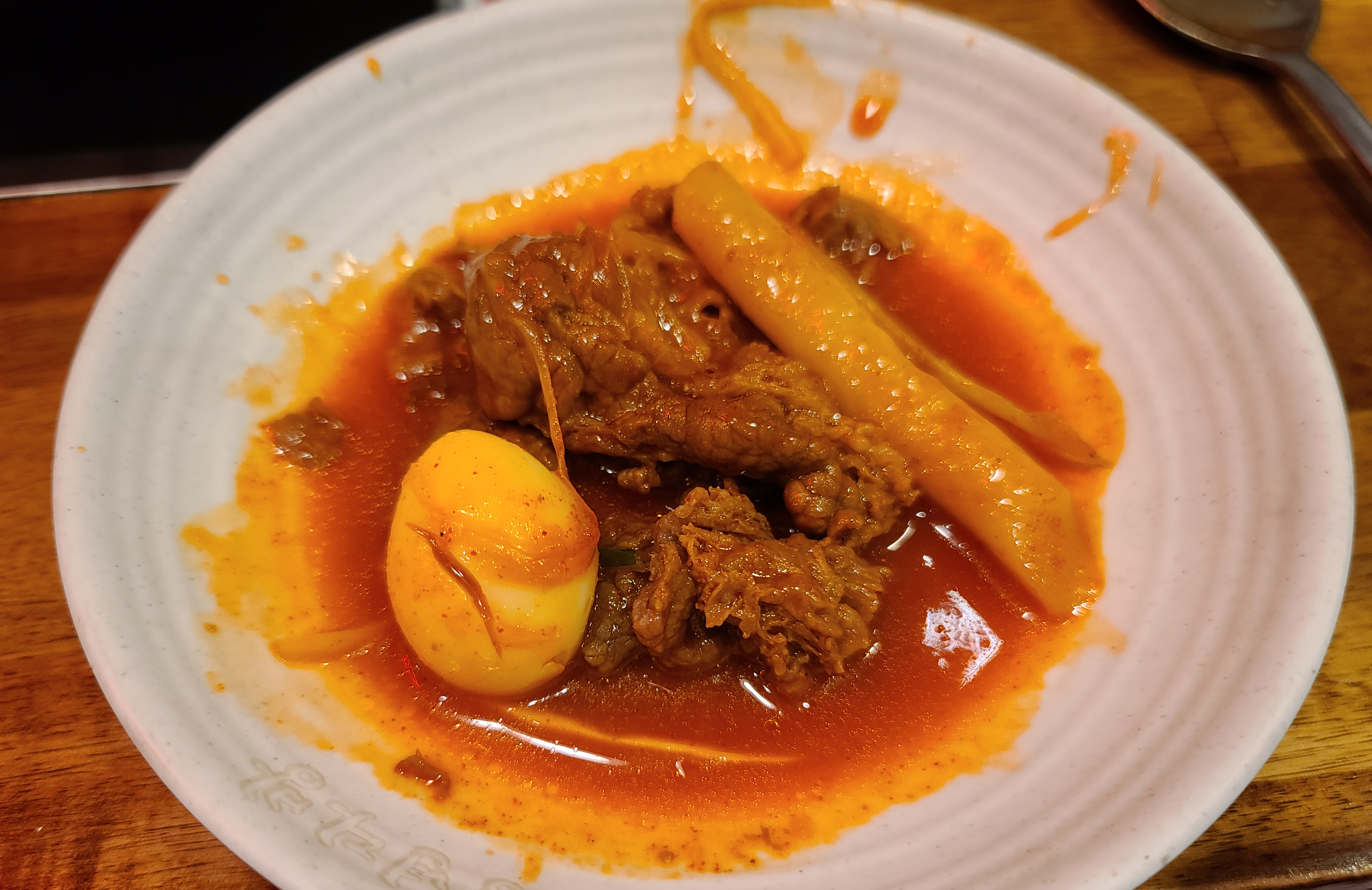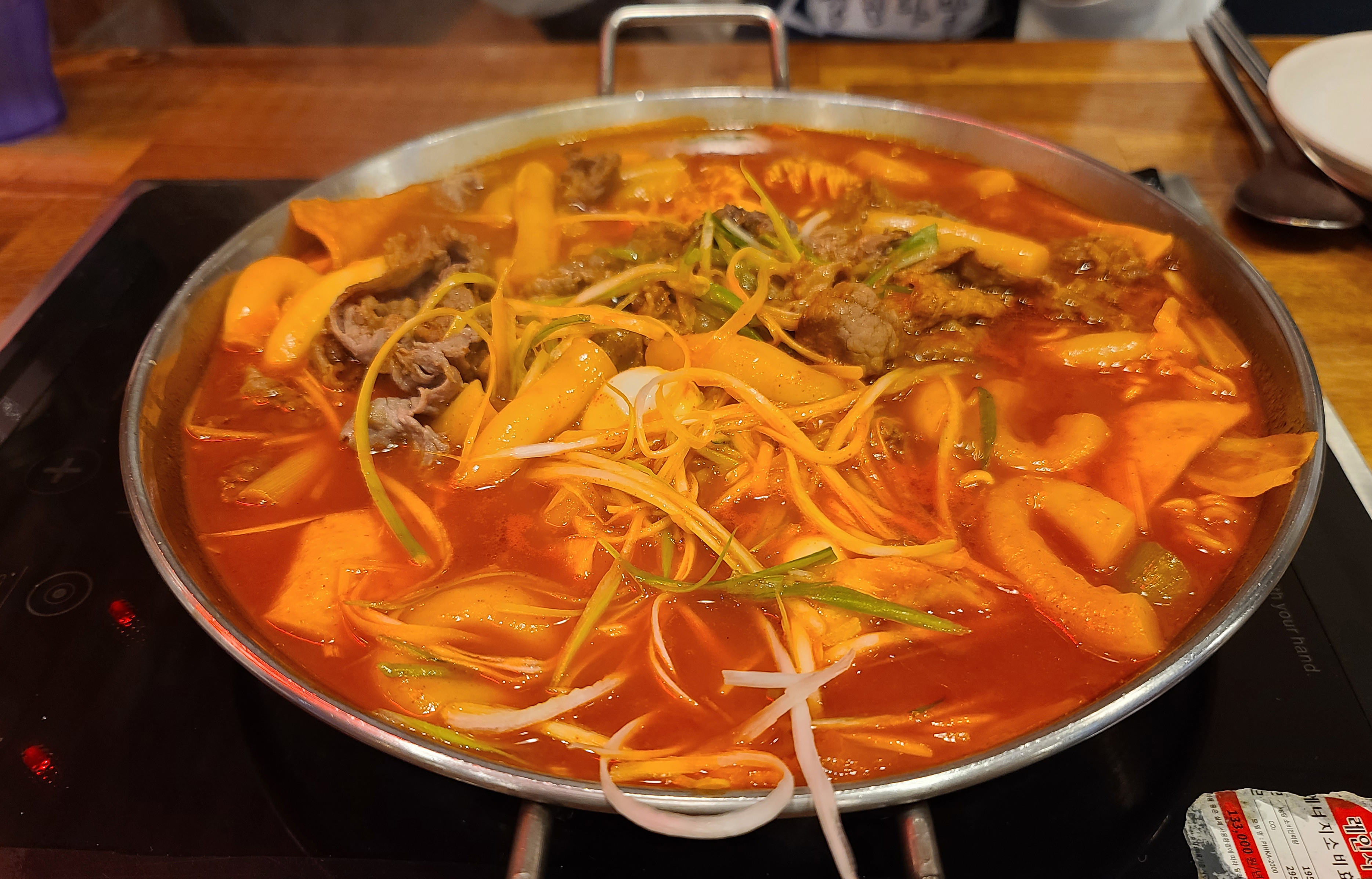 차돌떡볶이는 떡볶이 위에 차돌박이가 얹어진 형태의 떡볶이였습니다. 떡은 길쭉하게 들어가 있기 때문에 가위로 직접 잘라주어야 했고요, 떡볶이의 맛은 맵지 않고 적당했습니다. 약간 국물이 졸아들면서 짠맛이 좀 강해졌습니다.