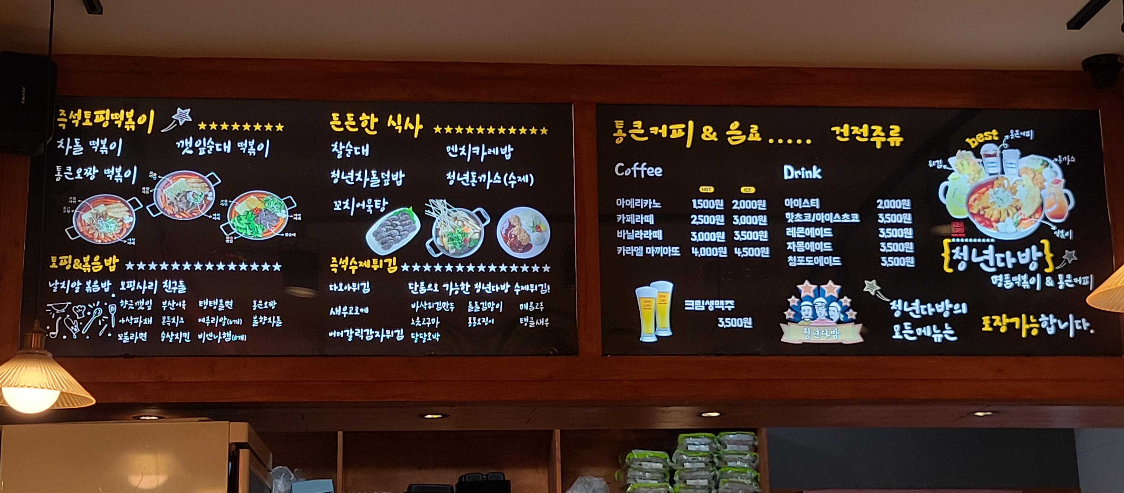 청년다방은 통큰오짱떡볶이와 차돌떡볶이가 유명한 가게이죠. 이 날은 동생이 식사를 사기로 해서 부담을 주지 않으려고 동생에게 먹고싶은 만큼만 주문하라고 했습니다.