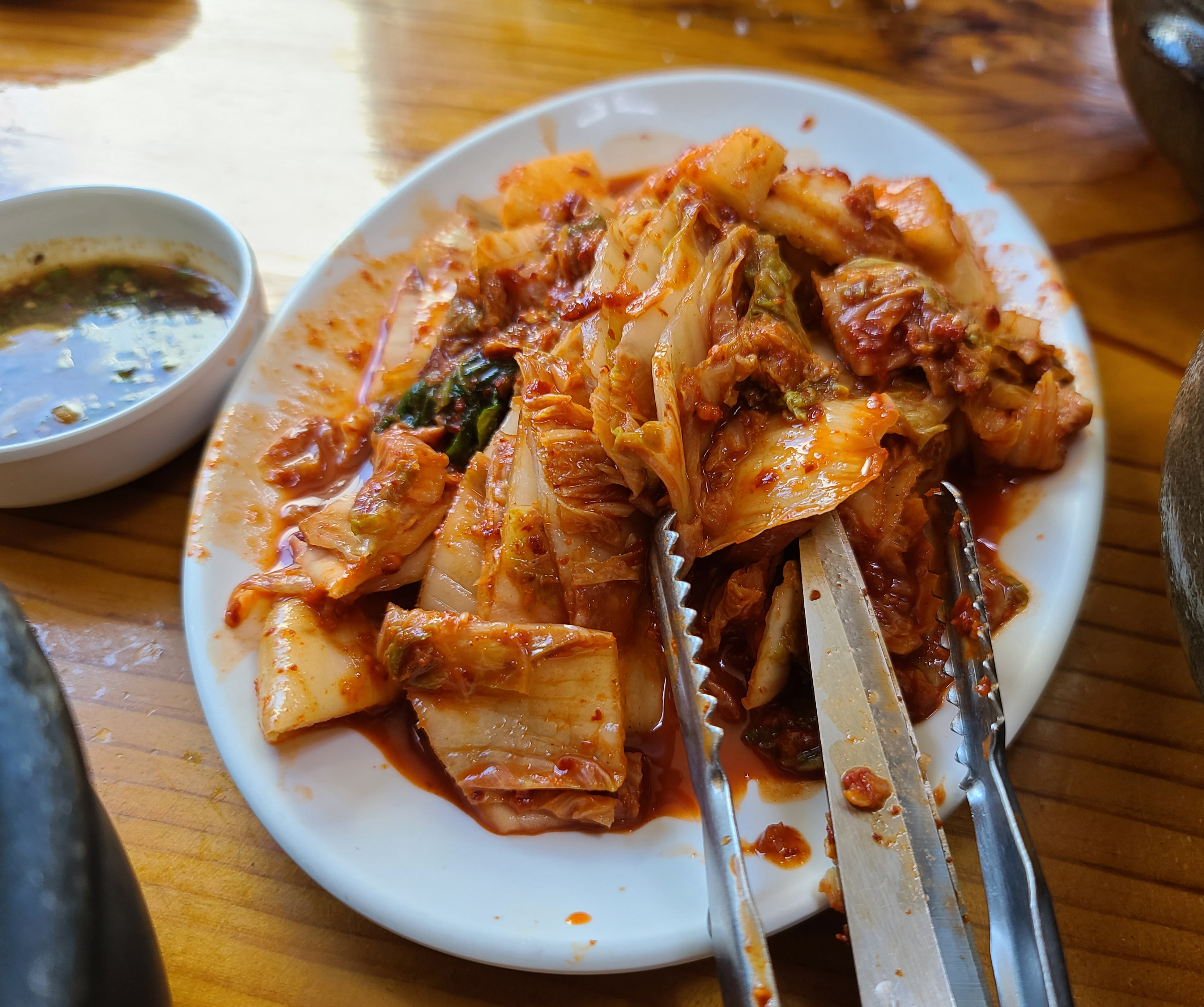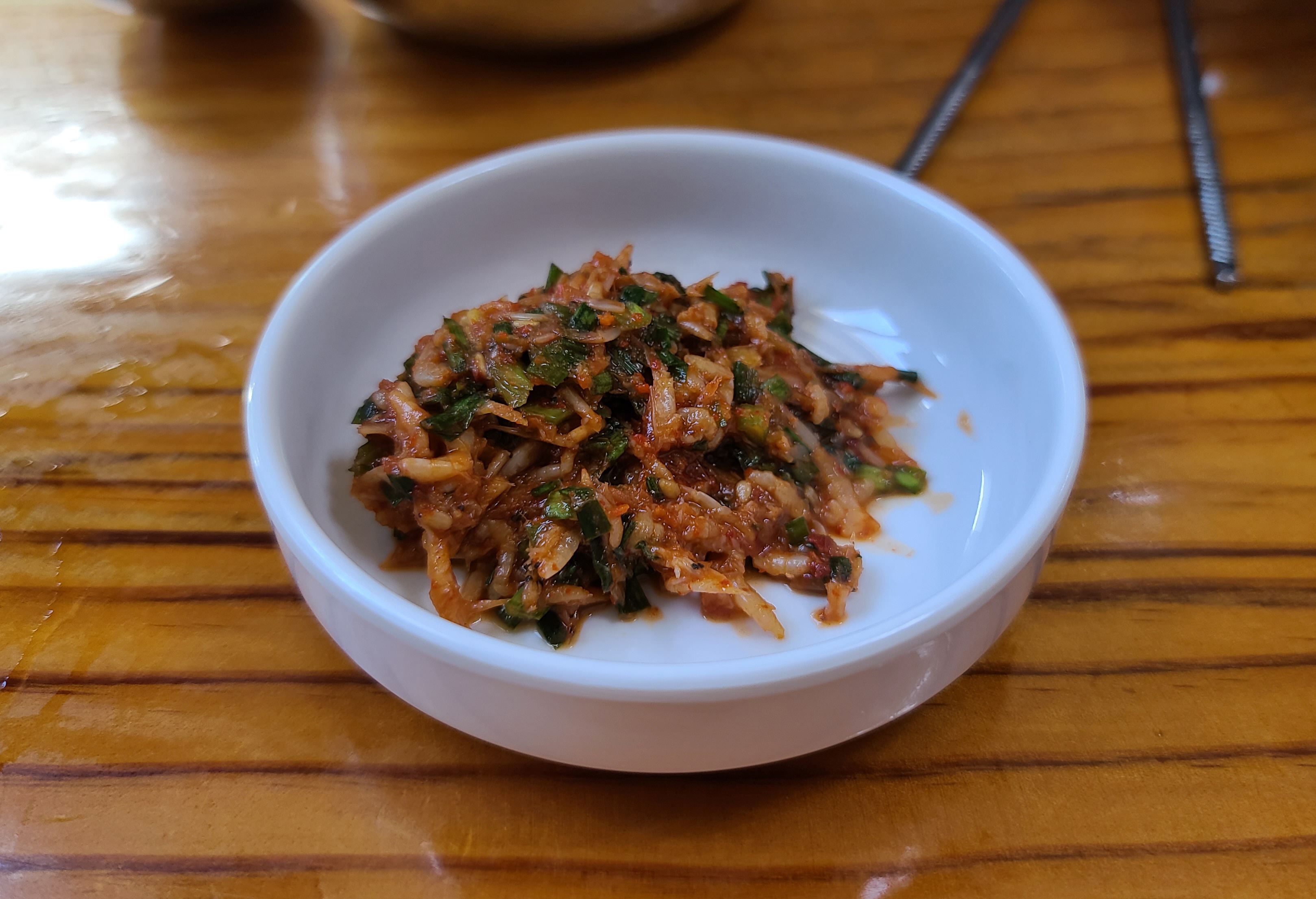 설렁탕과 함께 김치를 직접 덜어먹을 수 있게, 배추김치 섞박지가 제공되었는데 저는 배추김치를 더 좋아하기에 배추김치 위주로 그릇에 담았습니다. 그리고 설렁탕과 본가탕에 곁들일 새우젓과 양념장이 나왔습니다.