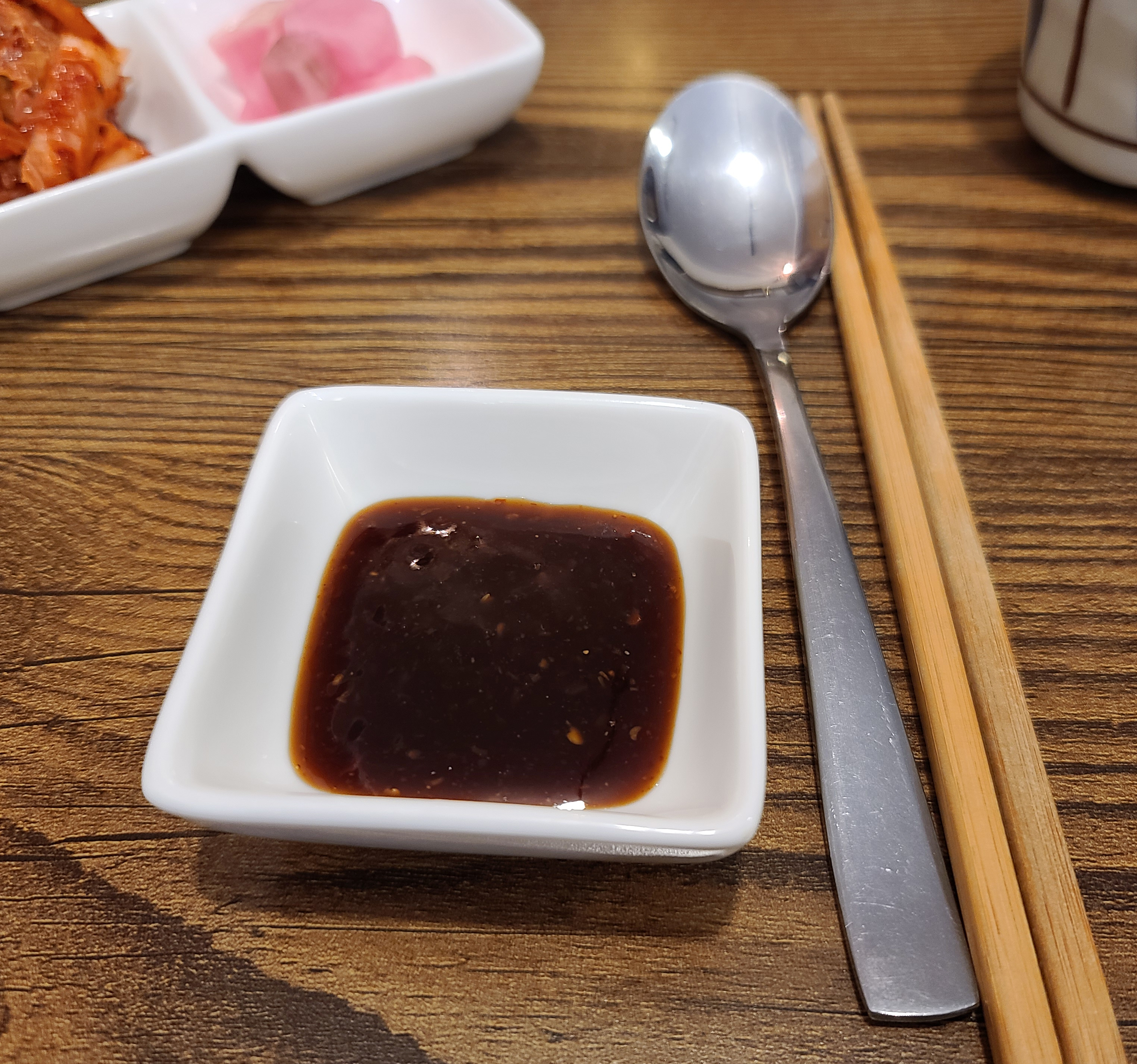 반찬통과 소스를 직접 덜어먹을 수 있게 되어있었으며, 반찬은 배추김치, 무 피클이 있었습니다. 소스는 기본 소스와 매콤한 소스가 있는데, 저는 매콤한 소스를 좋아해서 매운 소스만 덜어 먹었습니다.