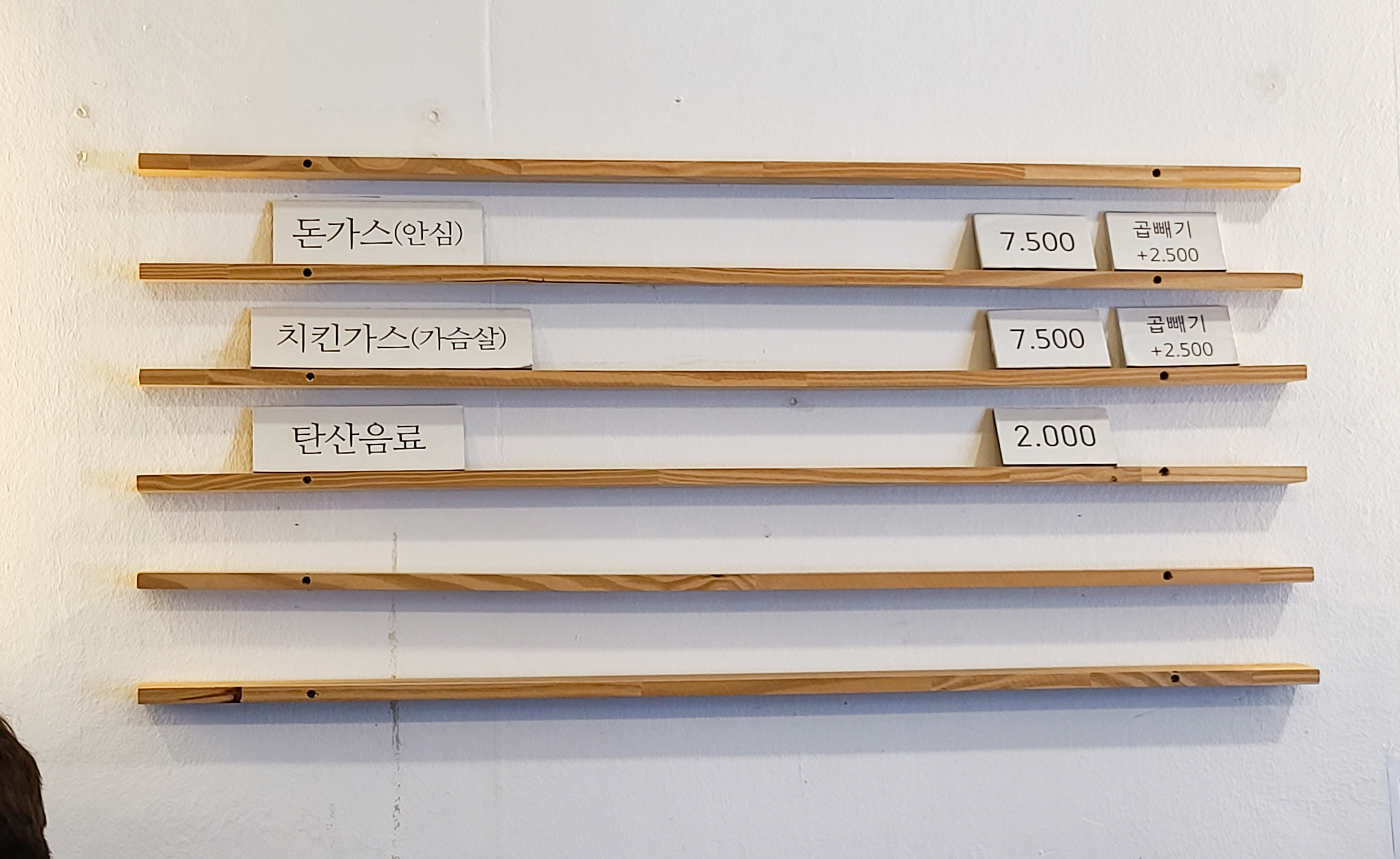 바삭한식당 메뉴는 돈까스, 치킨까스, 탄산음료가 있었습니다. 전에 방문했을 때는 감자튀김도 판매했는데, 이 날은 돈까스 메뉴만 보였습니다. 돈까스와 치킨까스 모두 7,500원부터 주문이 가능하여, 부담 없이 먹을 수 있었습니다. 저희는 돈가스, 돈가스 곱빼기, 치킨가스를 주문했습니다.