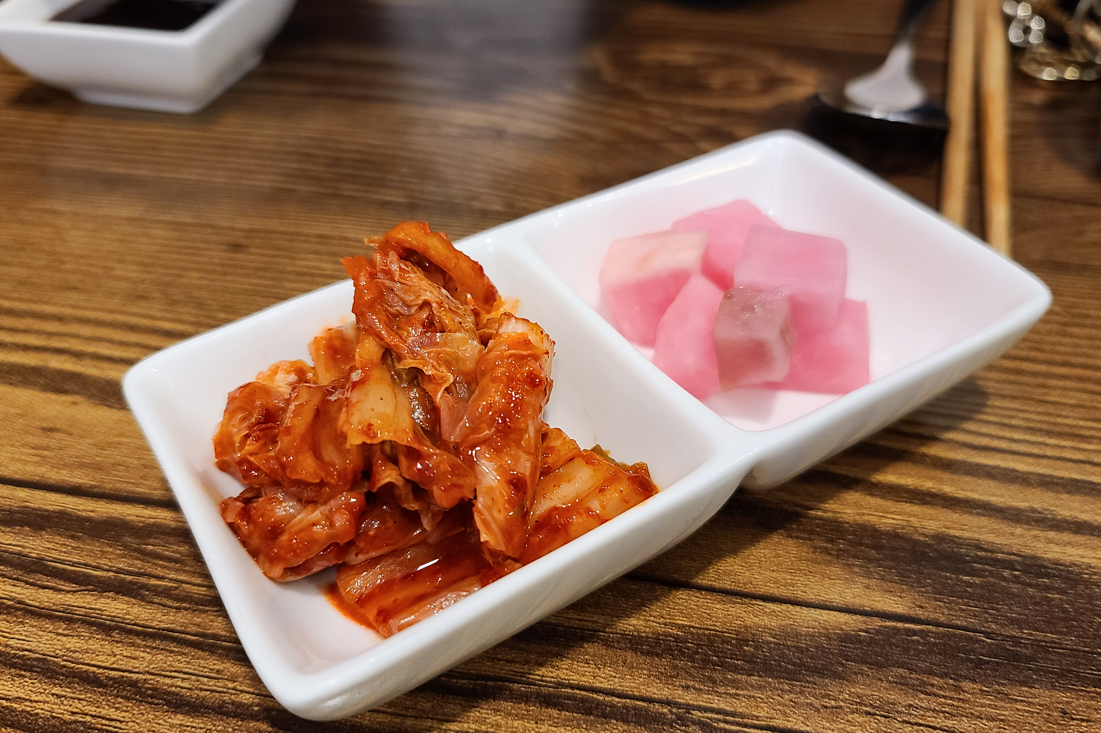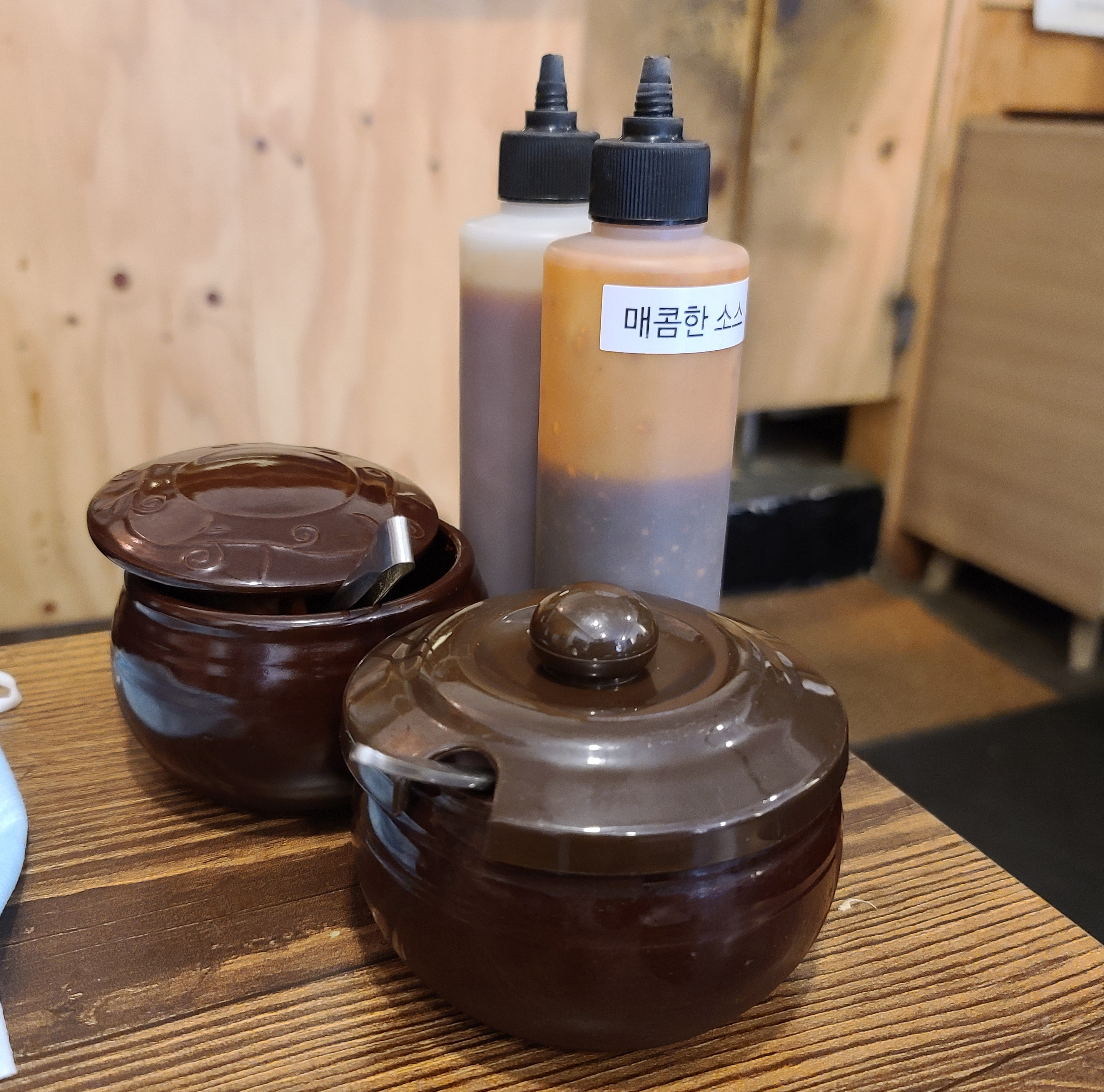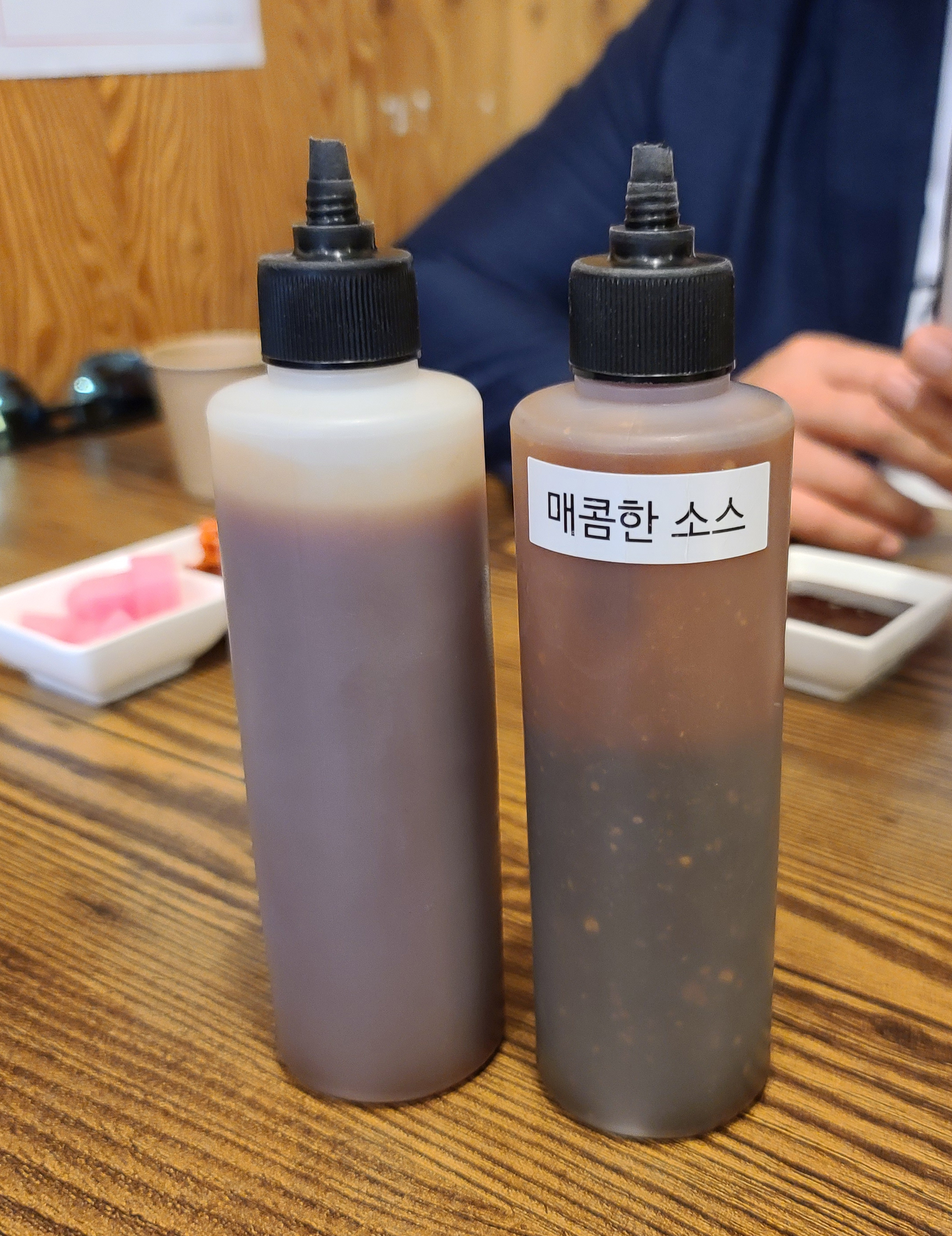 반찬통과 소스를 직접 덜어먹을 수 있게 되어있었으며, 반찬은 배추김치, 무 피클이 있었습니다. 소스는 기본 소스와 매콤한 소스가 있는데, 저는 매콤한 소스를 좋아해서 매운 소스만 덜어 먹었습니다.