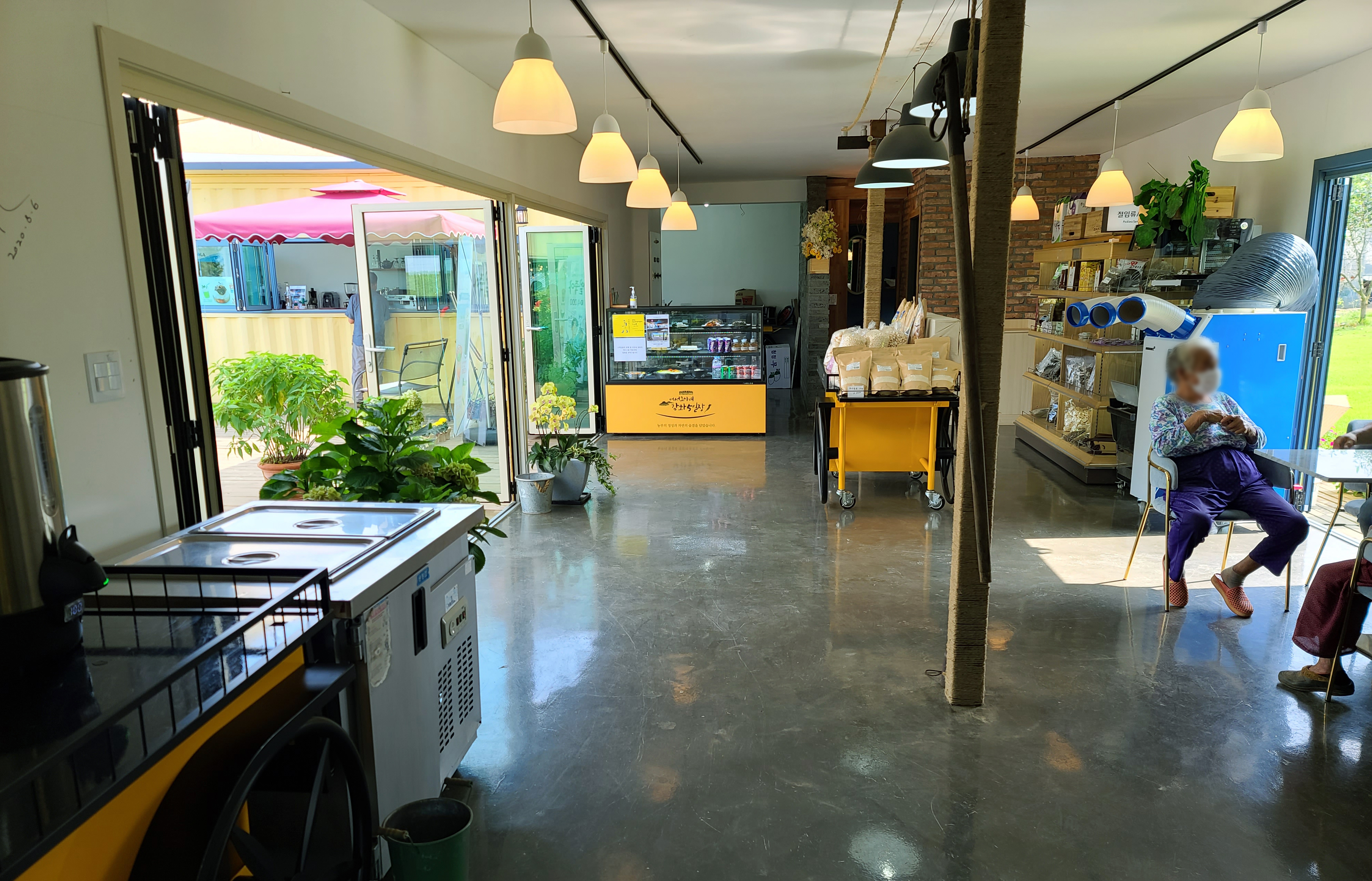 난곳카페는 컨테이너를 살린 인테리어가 돋보이는 곳이었는데, 가게에는 파스텔 톤의 페인트를 사용해 따뜻한 느낌을 잘 살려주었습니다. 가게 곳곳에는 강화 섬에서 직접 재배한 식자재로 만든 특산품도 판매 중이었습니다.