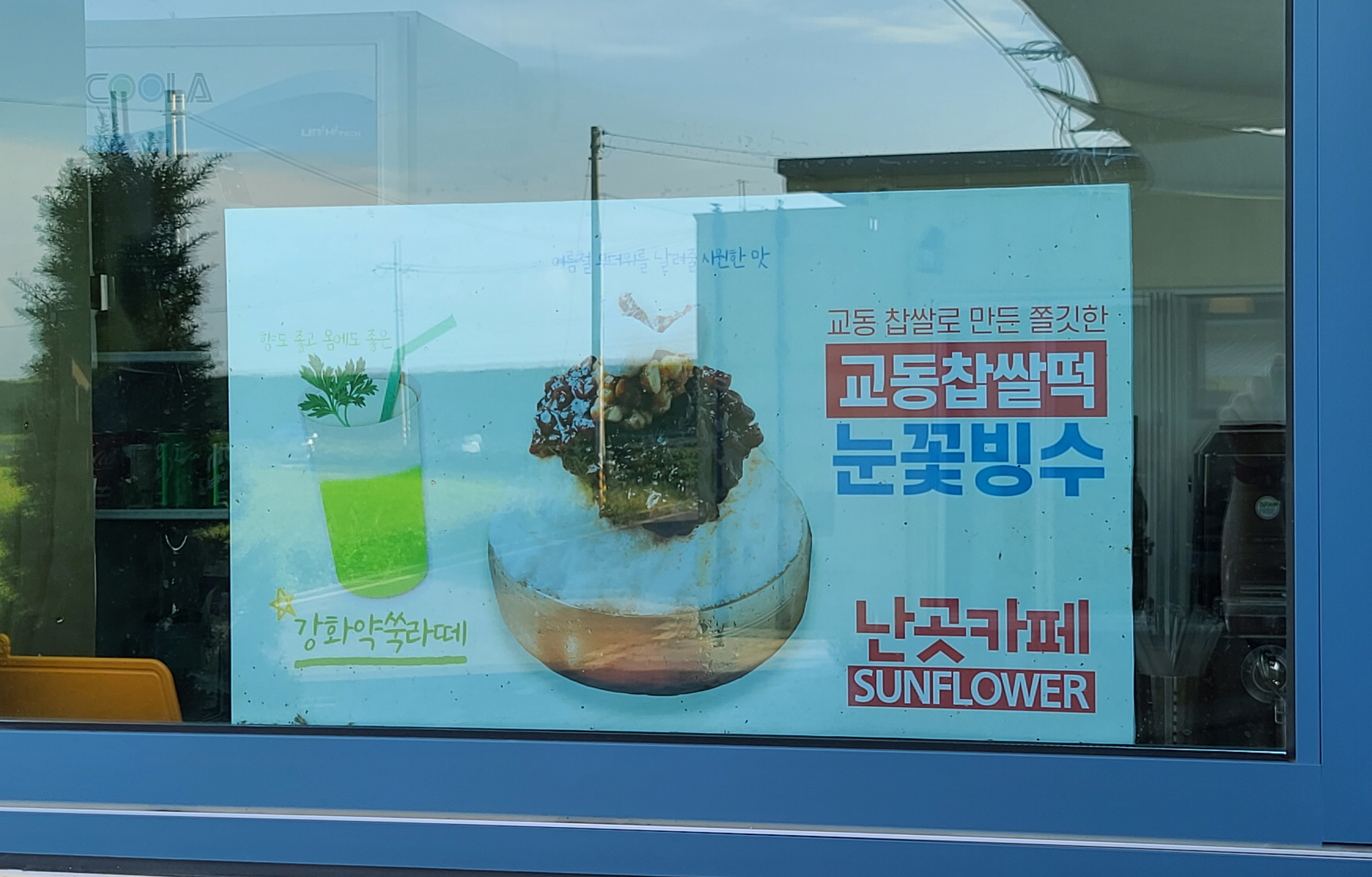 카페에는 아메리카노, 카페라떼, 강화약쑥라떼, 달콤딸기라떼, 수제청레몬에이드, 복숭아/체리아이스티, 교동눈꽃팥빙수, 고구마빵 등이 있었습니다. 이 날 교동 찹쌀떡이 들어간 눈꽃빙수와 딸기라떼, 약쑥라떼를 먹었습니다. 참고로 깔끔한 인테리어와는 달리, 시골의 카페답게 어르신들이 커피를 내려주시고, 빙수를 만들어주시다 보니 다소 시간이 소요되지만 나름 정감 있는 분위기가 좋았습니다. (게다가 가격도 부담스럽지 않다는 게 정말 매력이었죠.)