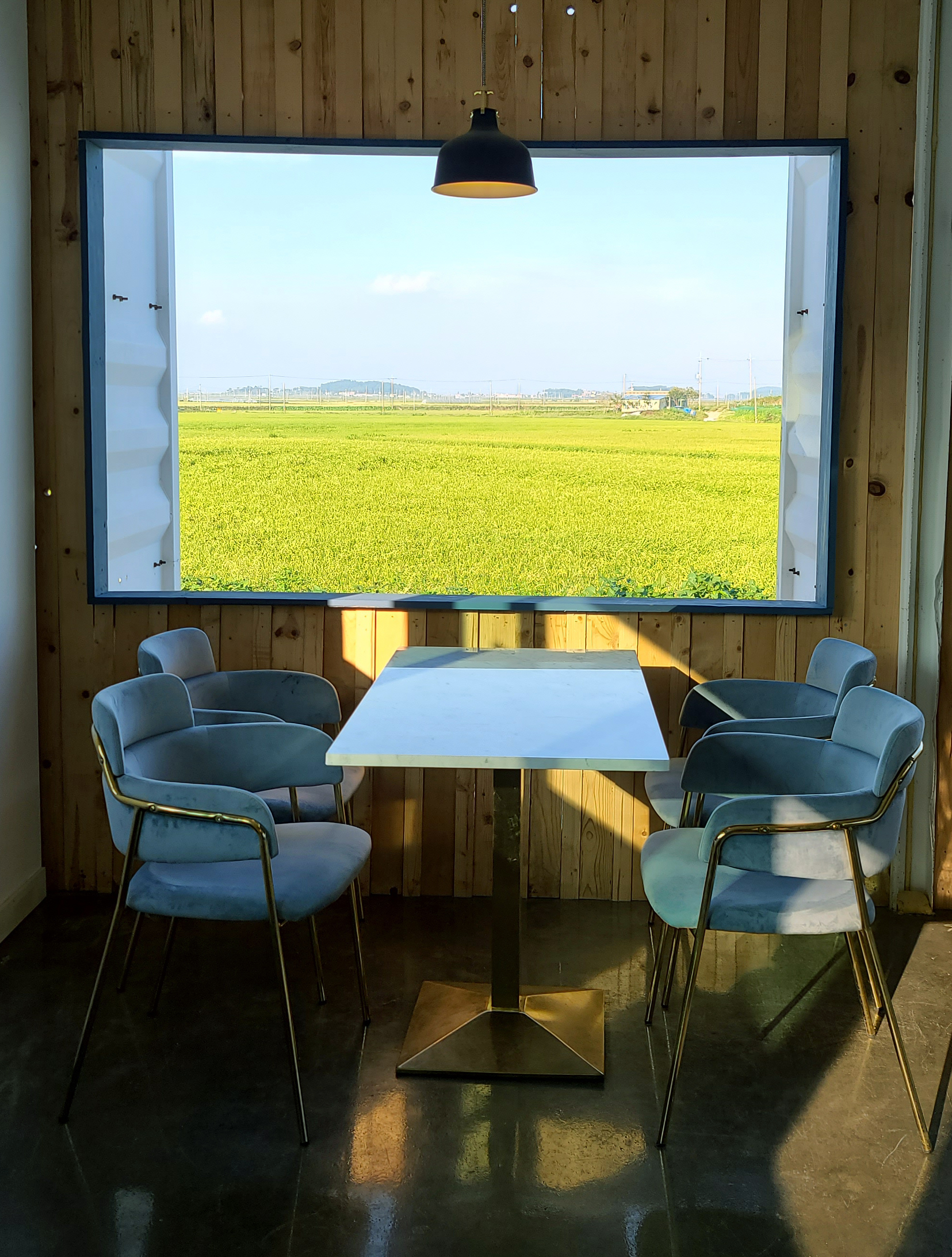 저는 난곳카페에 가장 좋았던 곳을 꼽으라면, 이 창가 자리를 선택할 것 같습니다. 커다란 창을 통해 보이는 강화 교동도의 탁 트인 논 뷰는 답답한 마음을 뻥 뚫어주는 것 같았습니다. 구도만 잘 갖추면 인생 샷을 남기기에도 부족함이 없는 곳이었죠.