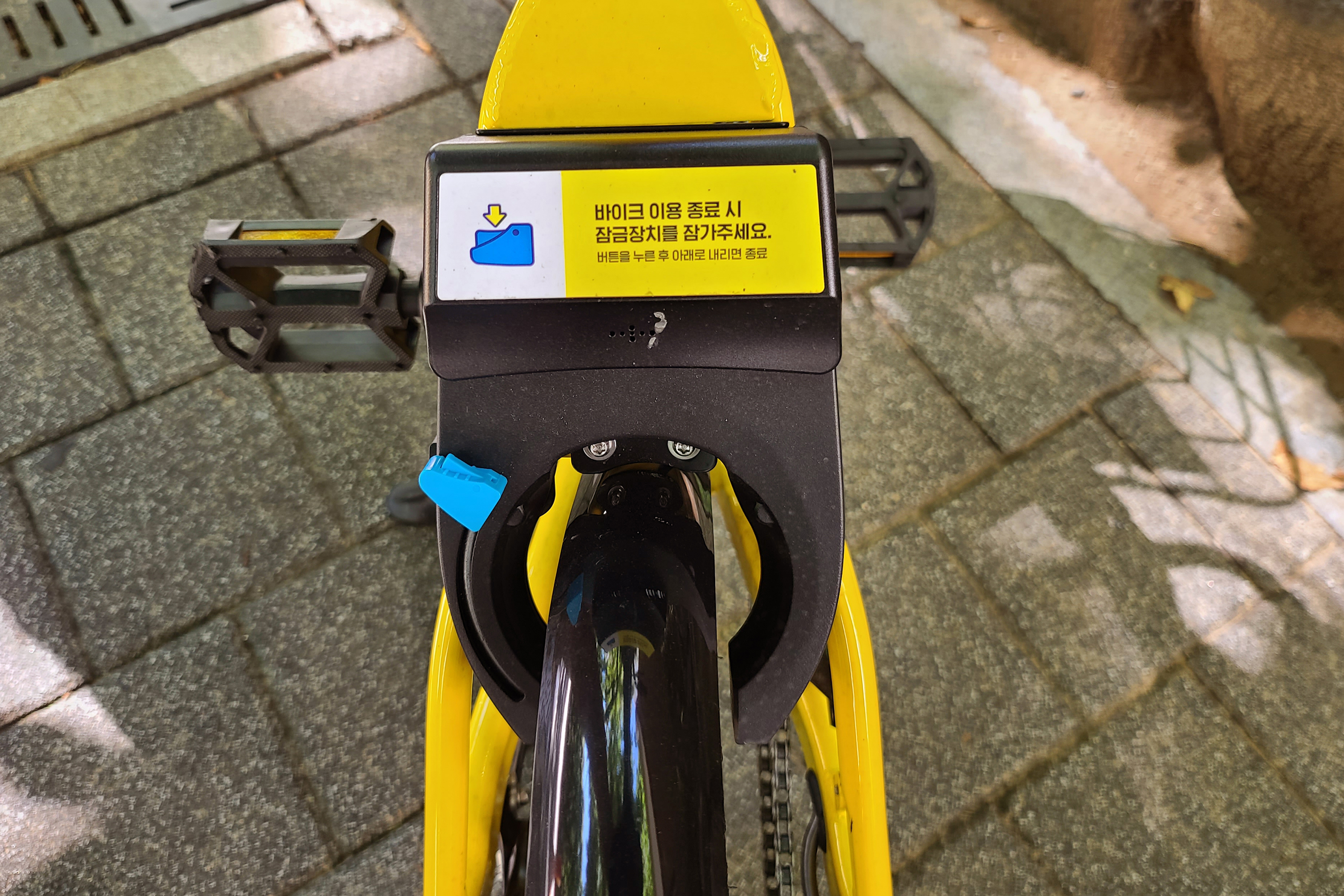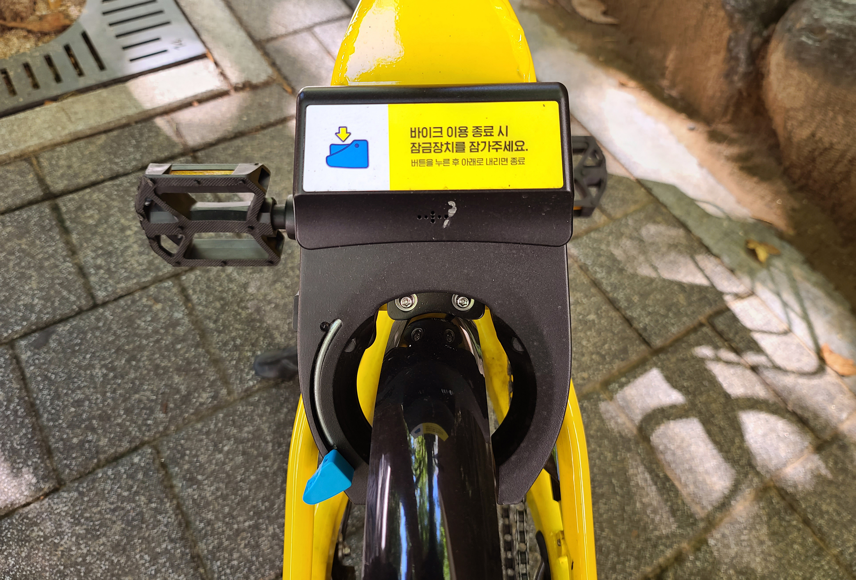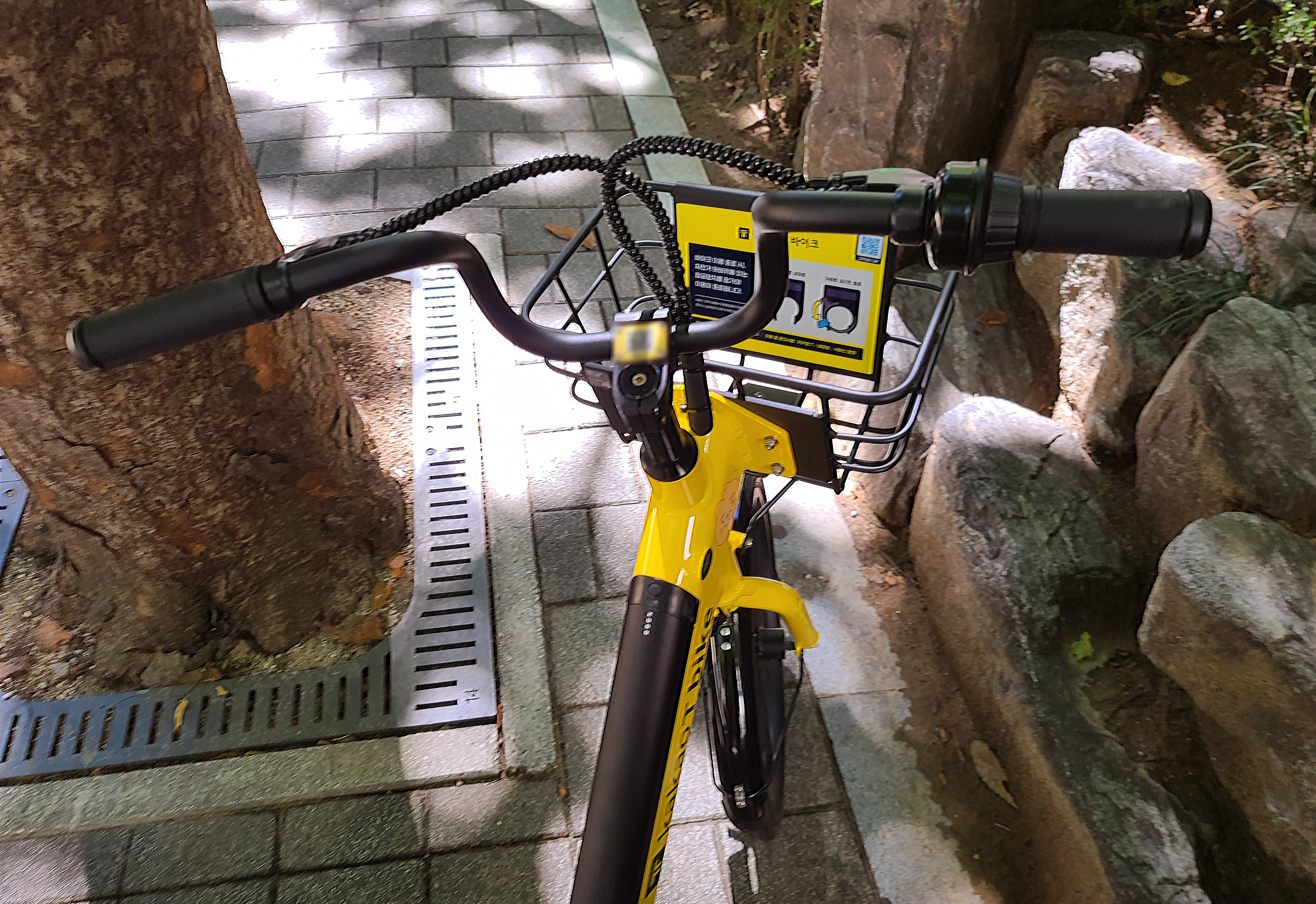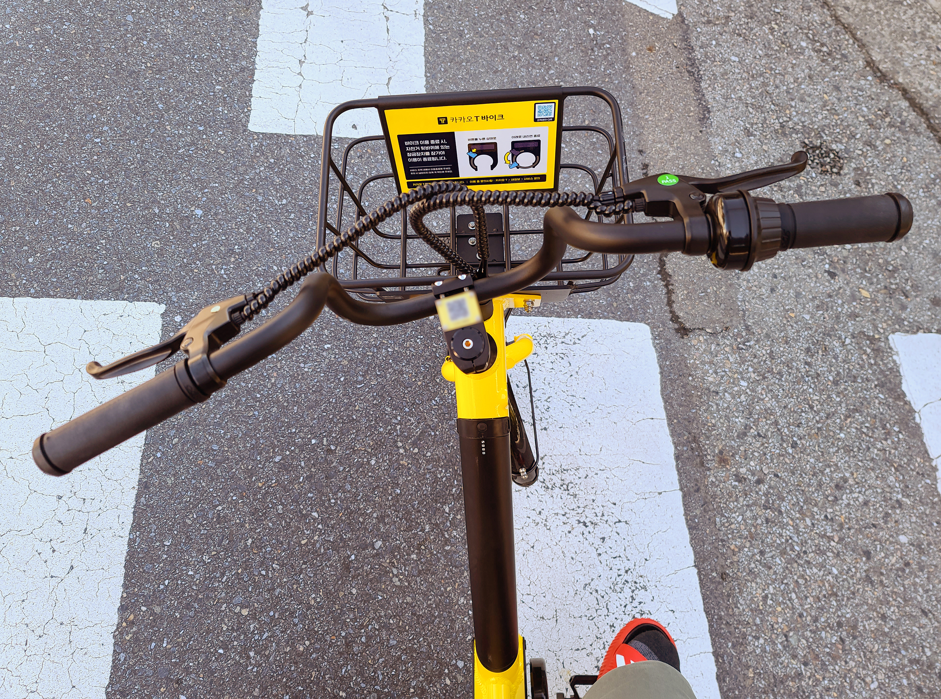 카카오 T 바이크의 모습은 위와 같이 자전거 본체와 바구니, 그리고 배터리의 잔량을 보여주는 인디케이터 등이 있었습니다. 전자식 자물쇠가 있고 GPS 신호를 이용해 자전거의 위치를 알려준다는 것을 제외하면 일반 자전거와 큰 차이는 없었습니다.