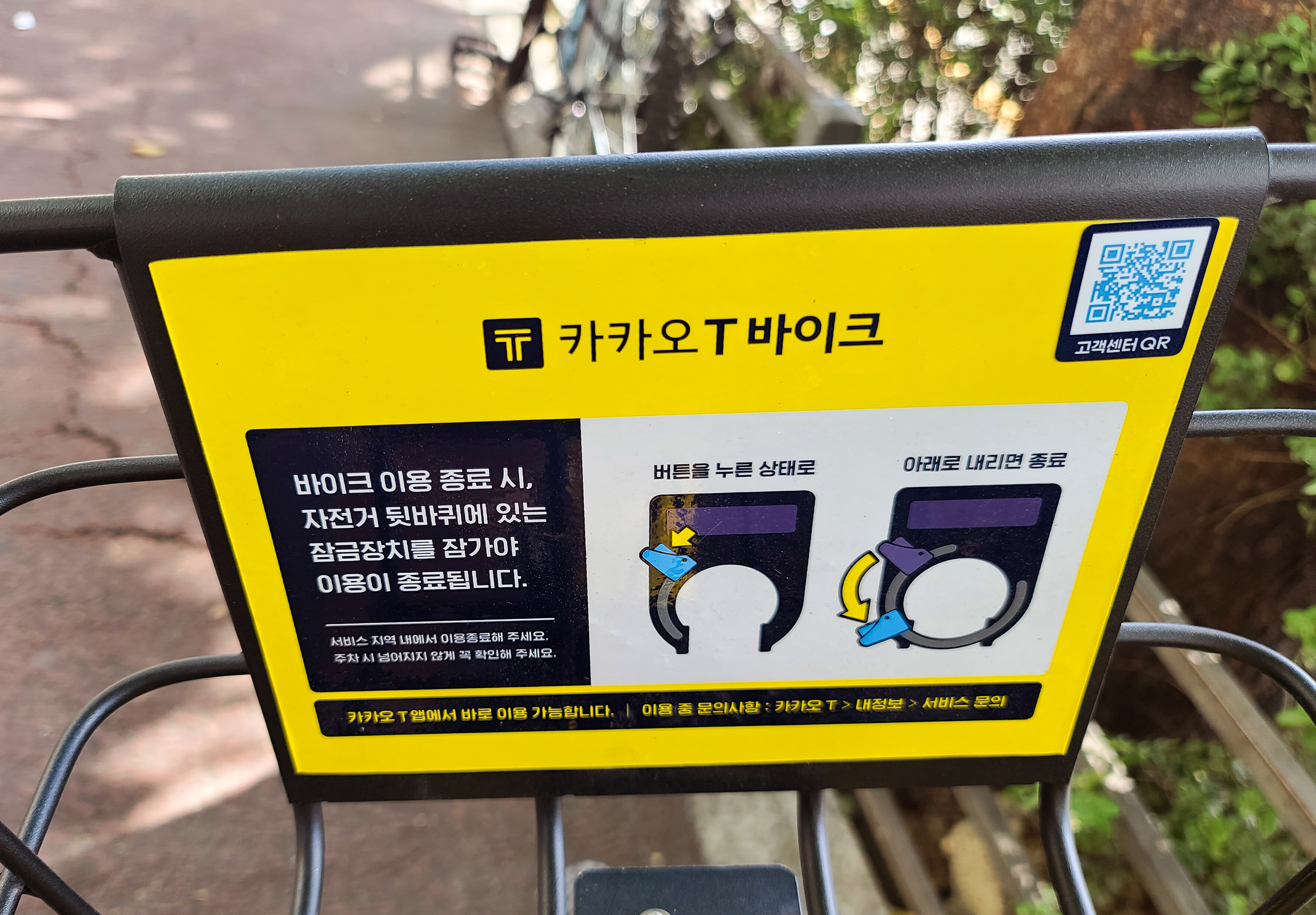 카카오 T 바이크는 스마트폰 앱스토어에서 카카오 T 앱을 받아서 사용하시면 되는데요, 앱을 켠 뒤 카카오 T 바이크 항목을 찾아서 자전거에 있는 QR 코드를 인식시키면 자동으로 자물쇠가 열리면서 자전거 이용이 가능한 시스템이었습니다. 금액도 생각보다 부담스럽지 않고, 페달을 밟으면 전기를 이용해 동력을 보태주어 자전거를 쉽고 편하게 탈 수 있었습니다.