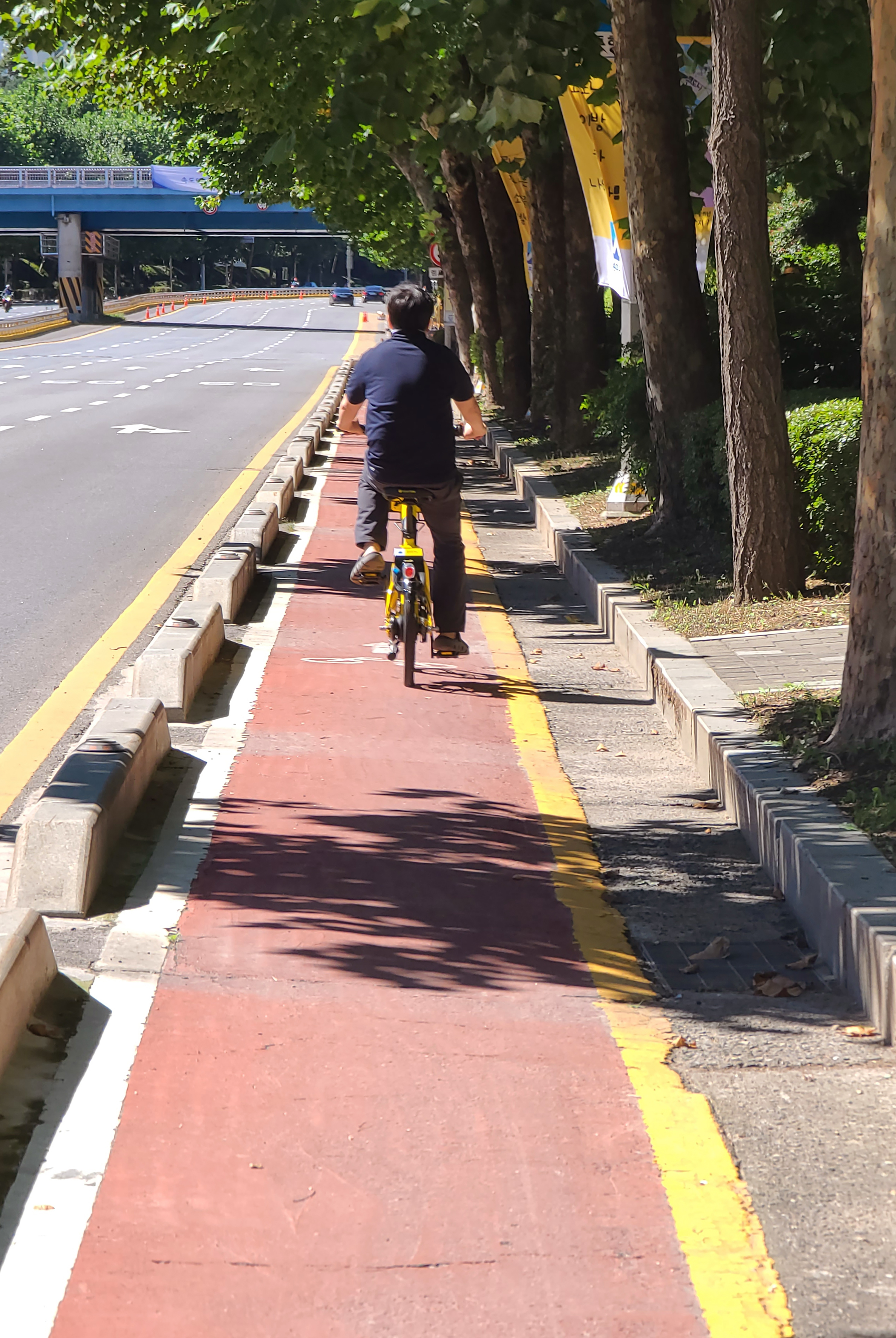 자전거는 페달을 굴리면 배터리로부터 보조 동력이 전달되어 큰 힘을 들이지 않고도, 주행할 수 있도록 되어있었습니다. 페달을 밟지 않으면 작동을 하지 않으며, 최대 속도는 20 km/h 정도 나오더라고요. 더 속도를 내려고 하면 약간 저항이 있어서 오히려 페달이 무거워지더라고요.