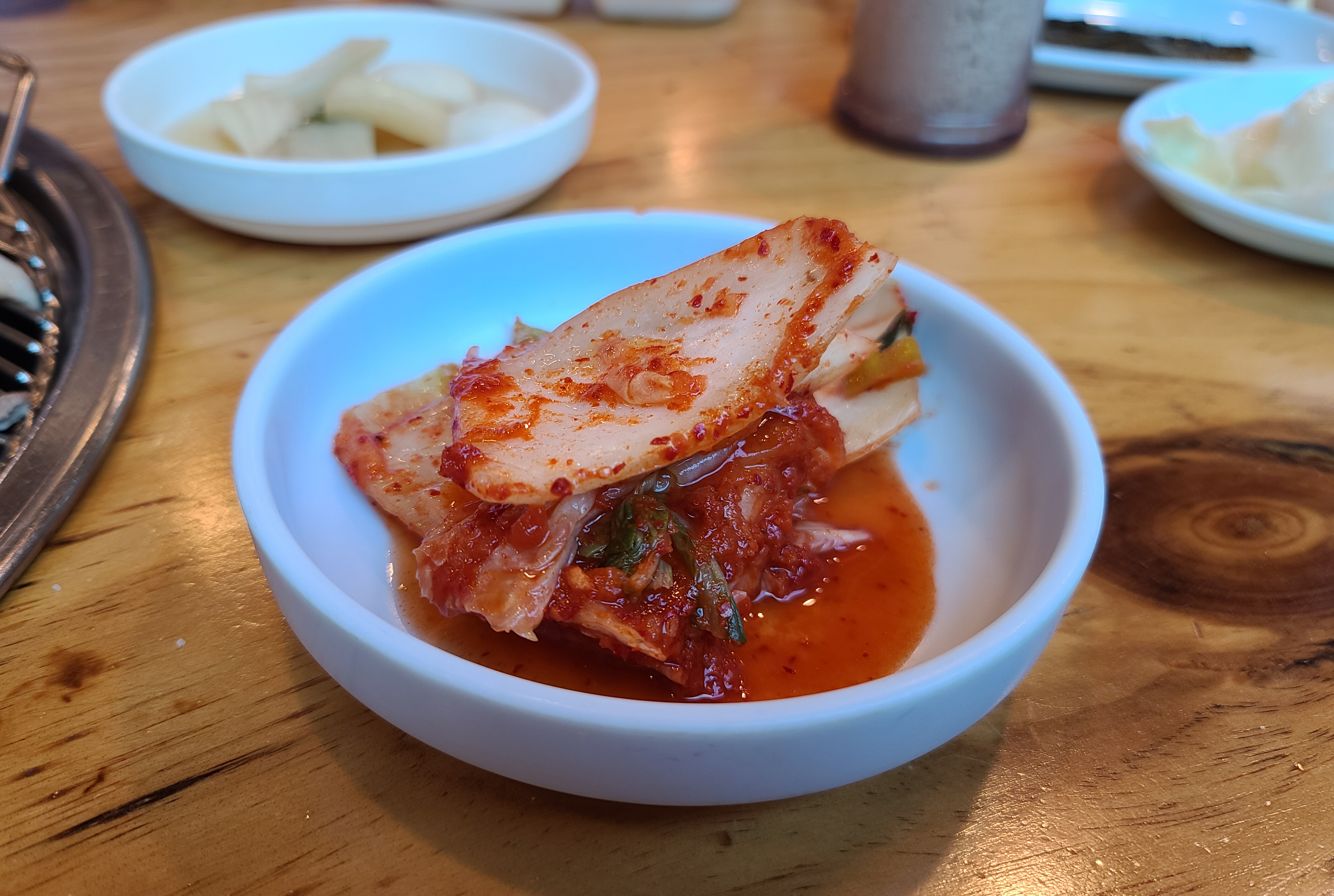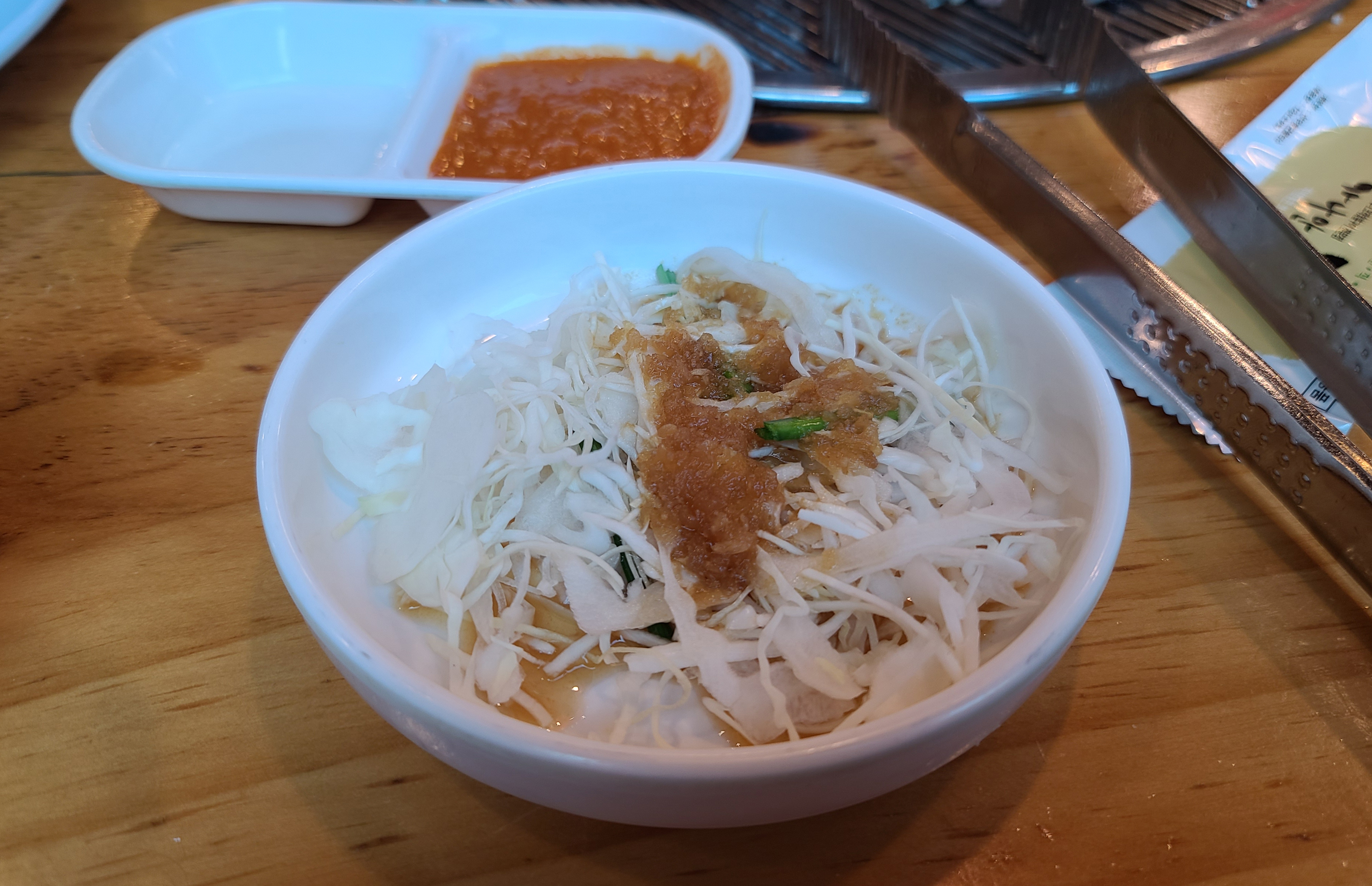 가나안덕의 반찬은 위와 같습니다. 쌈채소, 깻잎장아찌, 배추김치, 양파장아찌 등이 나왔습니다. 오리와 곁들여 먹을 채 썬 양배추와 양념장도 있었습니다.