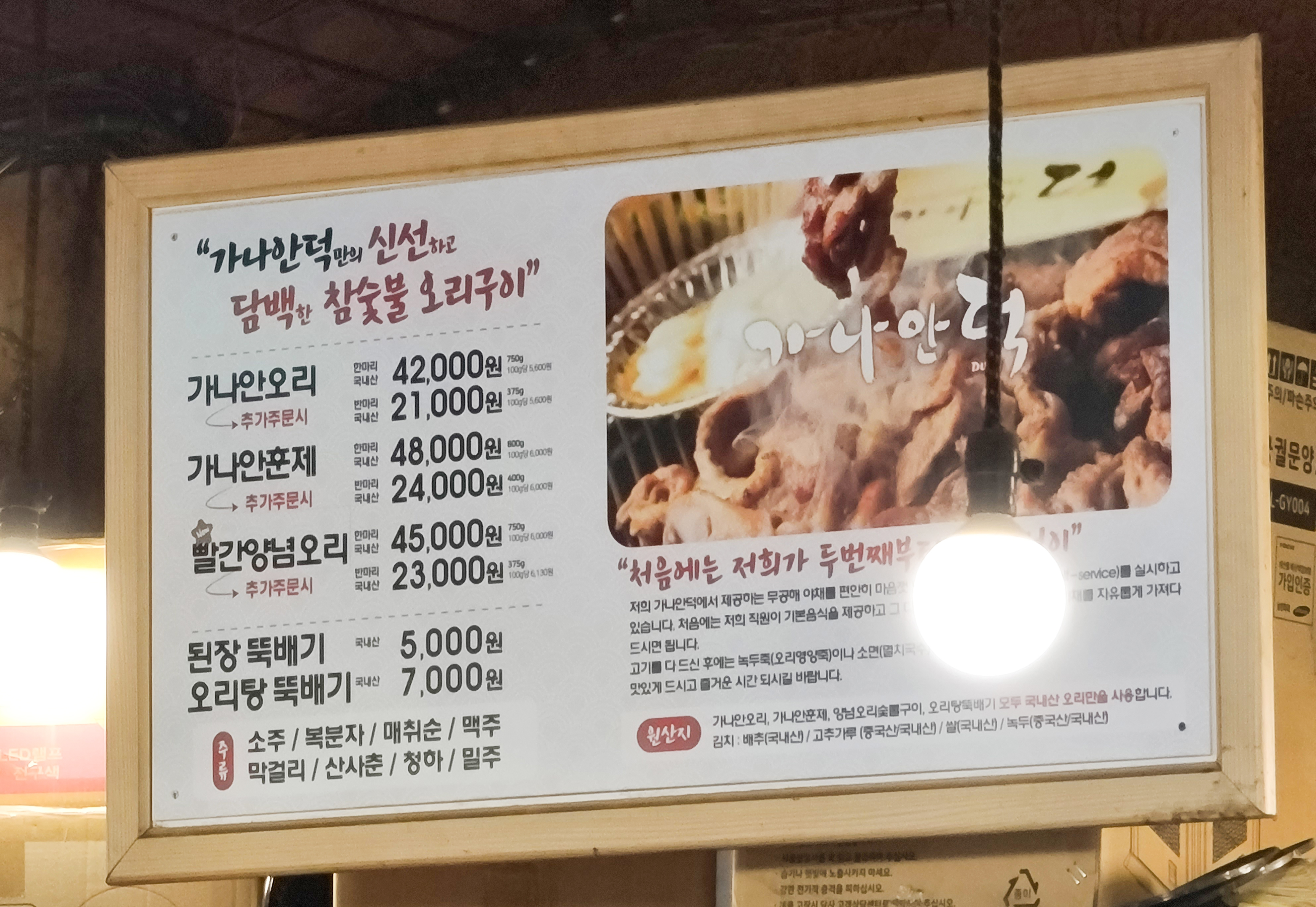 가나안덕 하남점의 메뉴는 가나안오리, 가나안훈제, 빨간양념오리, 된장뚝배기, 오리탕뚝배기 등이 있었습니다. 제가 보통 주문하는 가나안오리 한 마리 기준 42,000원 이고, 반마리는 21,000원 에 판매 중입니다.