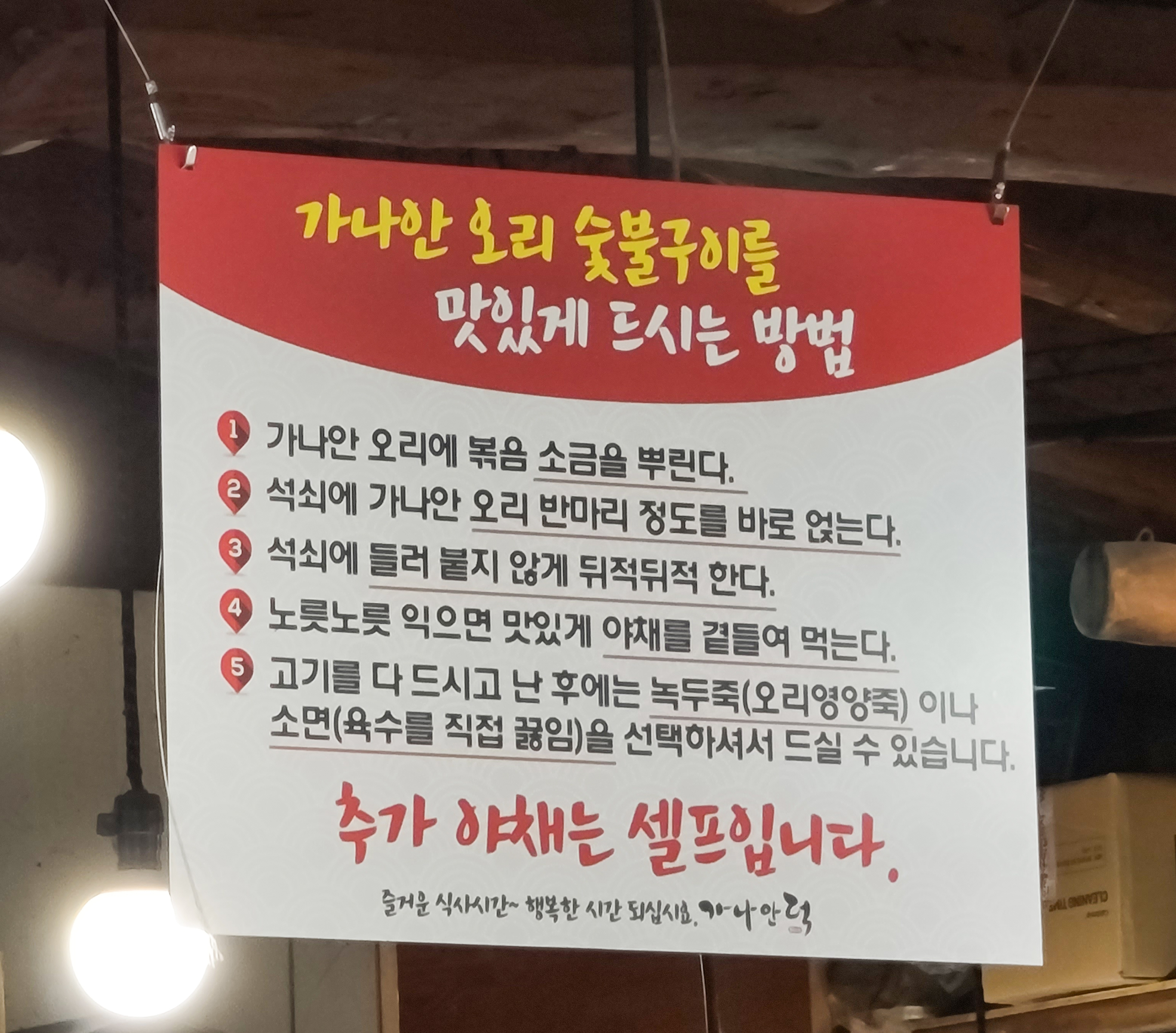 가나안덕의 오리구이를 맛있게 먹는 방법은 ① 오리에 볶은 소금을 뿌린다. ② 석쇠에 오리 반마리 정도를 얹는다. ③ 석쇠에 들러붙지 않게 뒤적여준다. ④ 노릇노릇 익으면 채소를 곁들여 먹는다. ⑤ 식사 후 녹두죽이나 소면을 선택해 먹는다. 라고 적혀있었습니다.
