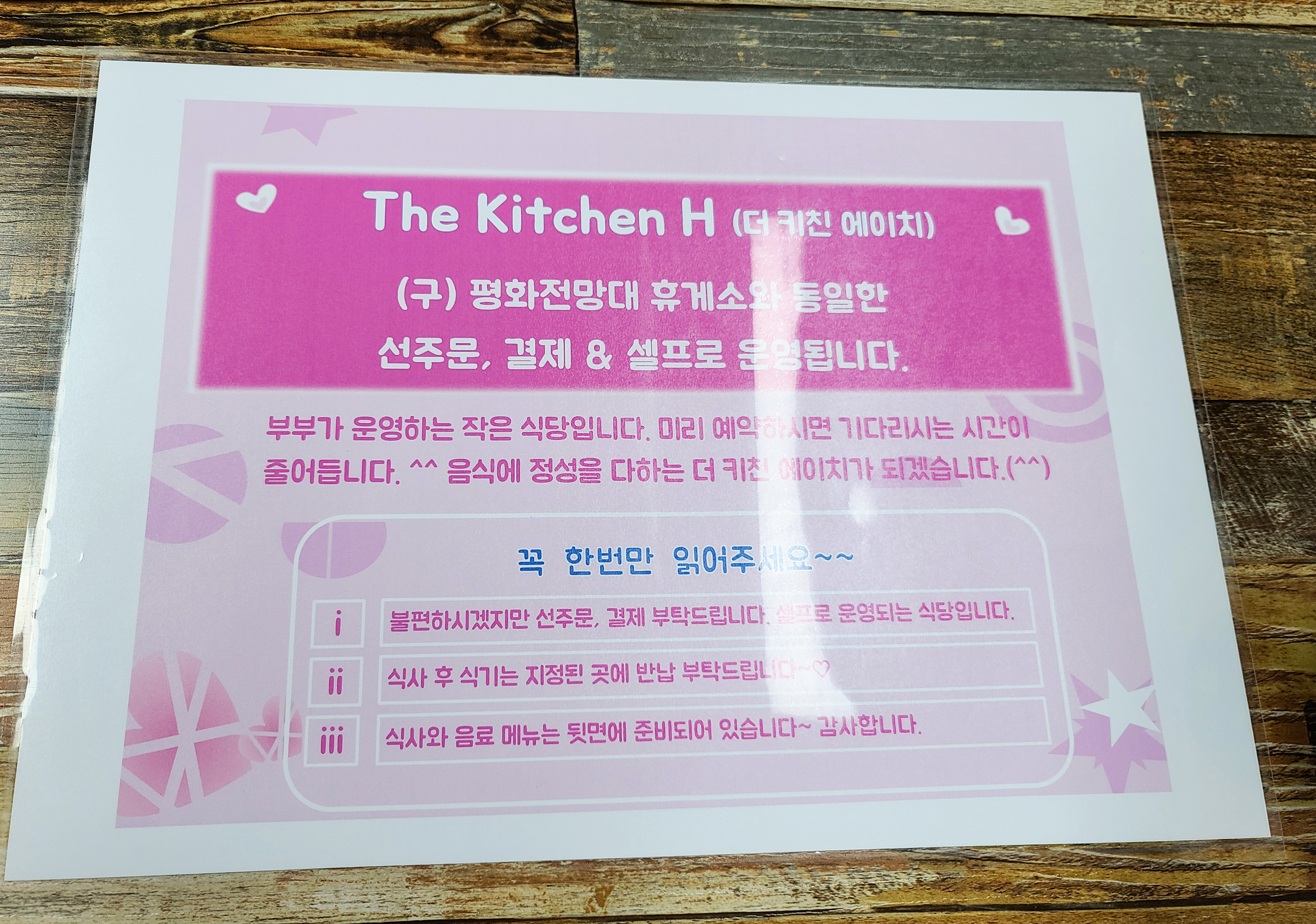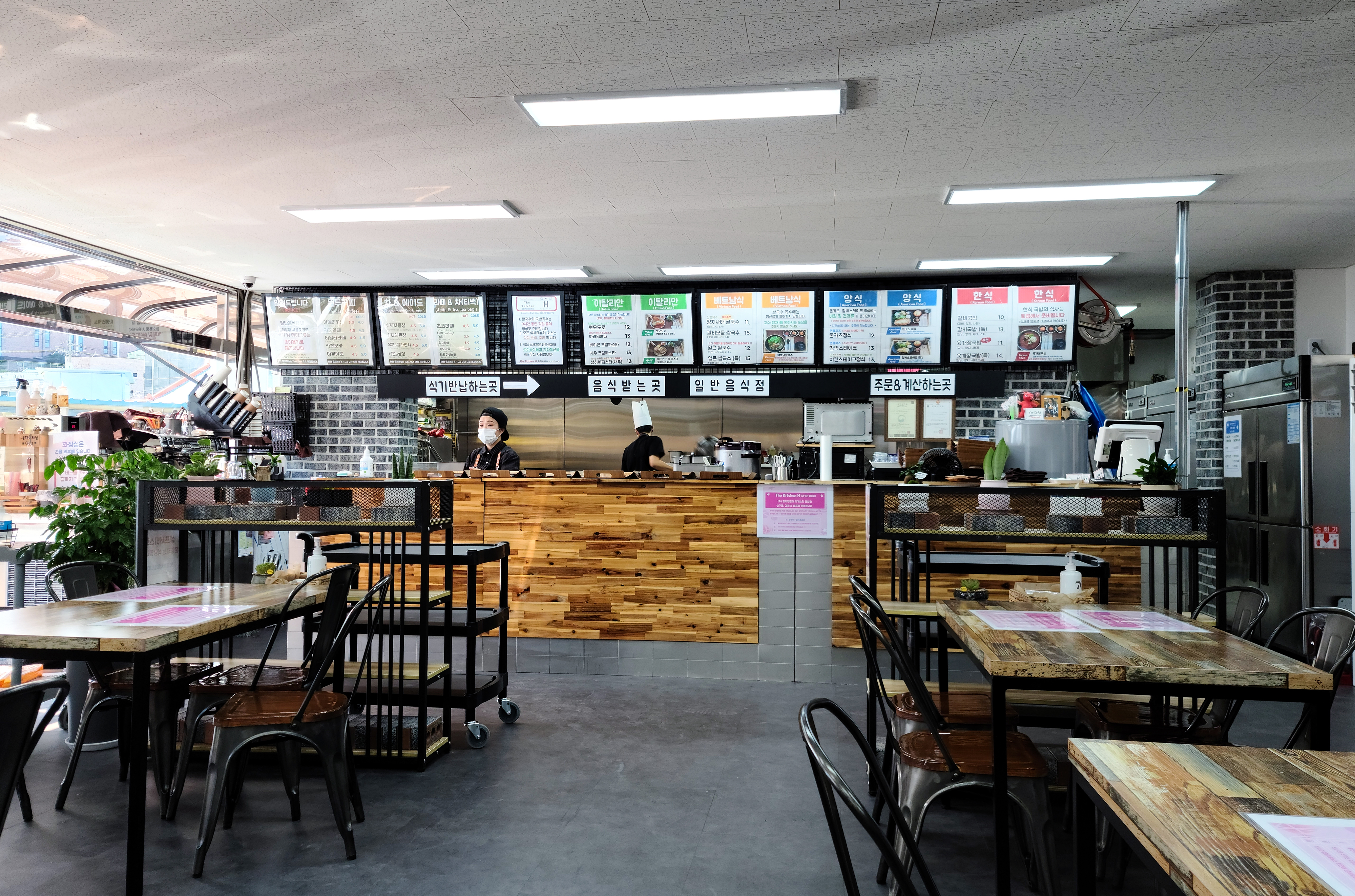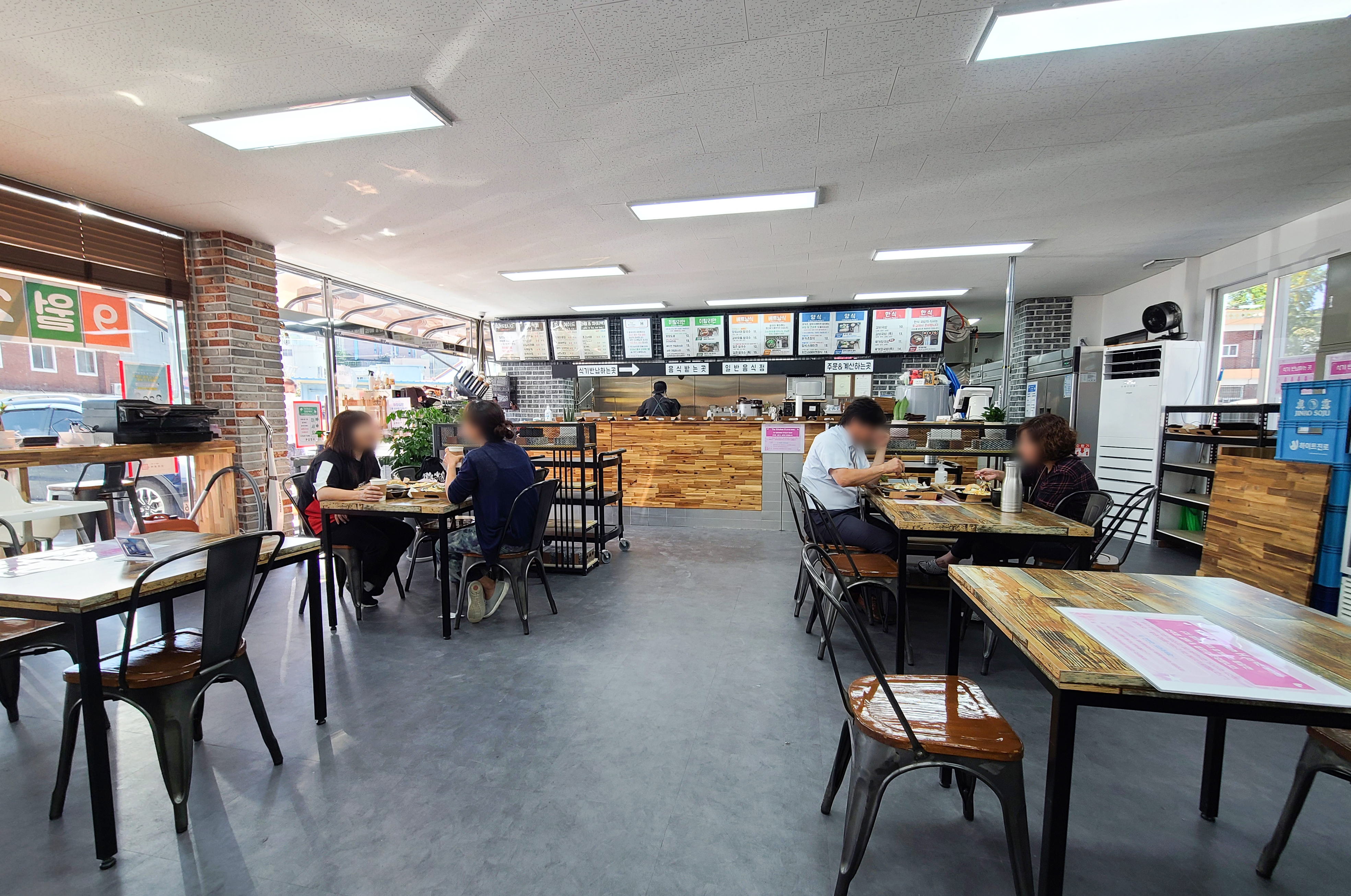 평화전망대휴게소 → 더키친H (더키친에이치) 로 변경된 가게는 강화군 강화읍 신문리 585-7에 위치해 있었으며, 건물에 주차장도 마련되어있어 차량 이용 시 주차가 용이했습니다. 주차를 하고 가게에 들어가니 평화전망대 구내식당에서 뵈었던 반가운 얼굴들이 있었습니다. 이 날 손님이 많아서 제대로 인사를 나누지는 못했지만, 이제는 "더 자주 편하게 이용할 수 있어서 좋아졌다" 고 했죠.
