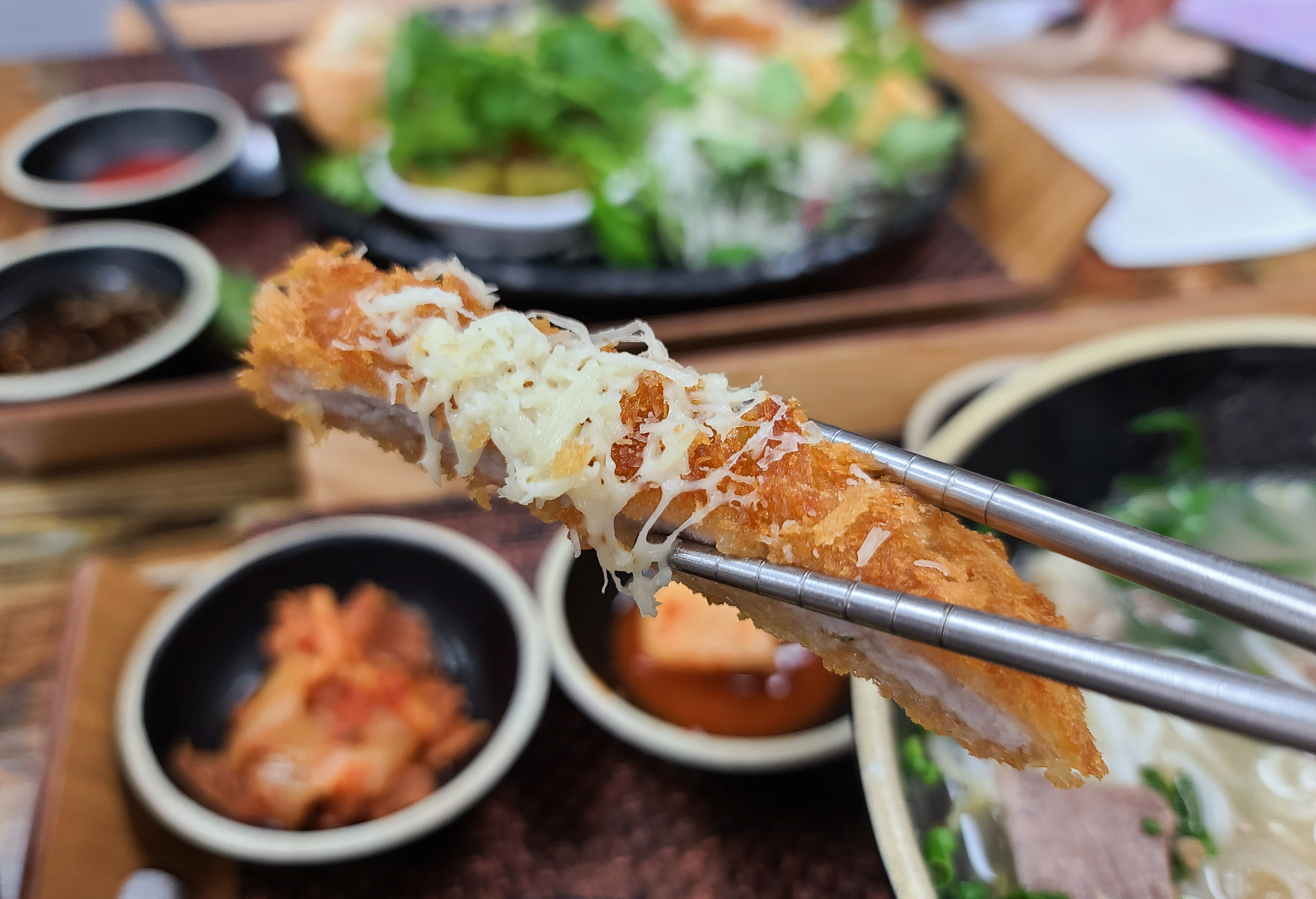 메뉴는 위와 같이 준비되었습니다. 맛깔스럽게 담아낸 밑반찬과 메뉴들이 사진 찍는 내내 군침 돌게 하더라고요. 돈까스도 맛있지만, 저번에 쌀국수를 맛본 뒤 푸짐한 양과 넉넉한 고기에 만족해서 저는 이번에도 쌀국수를 먹었습니다.