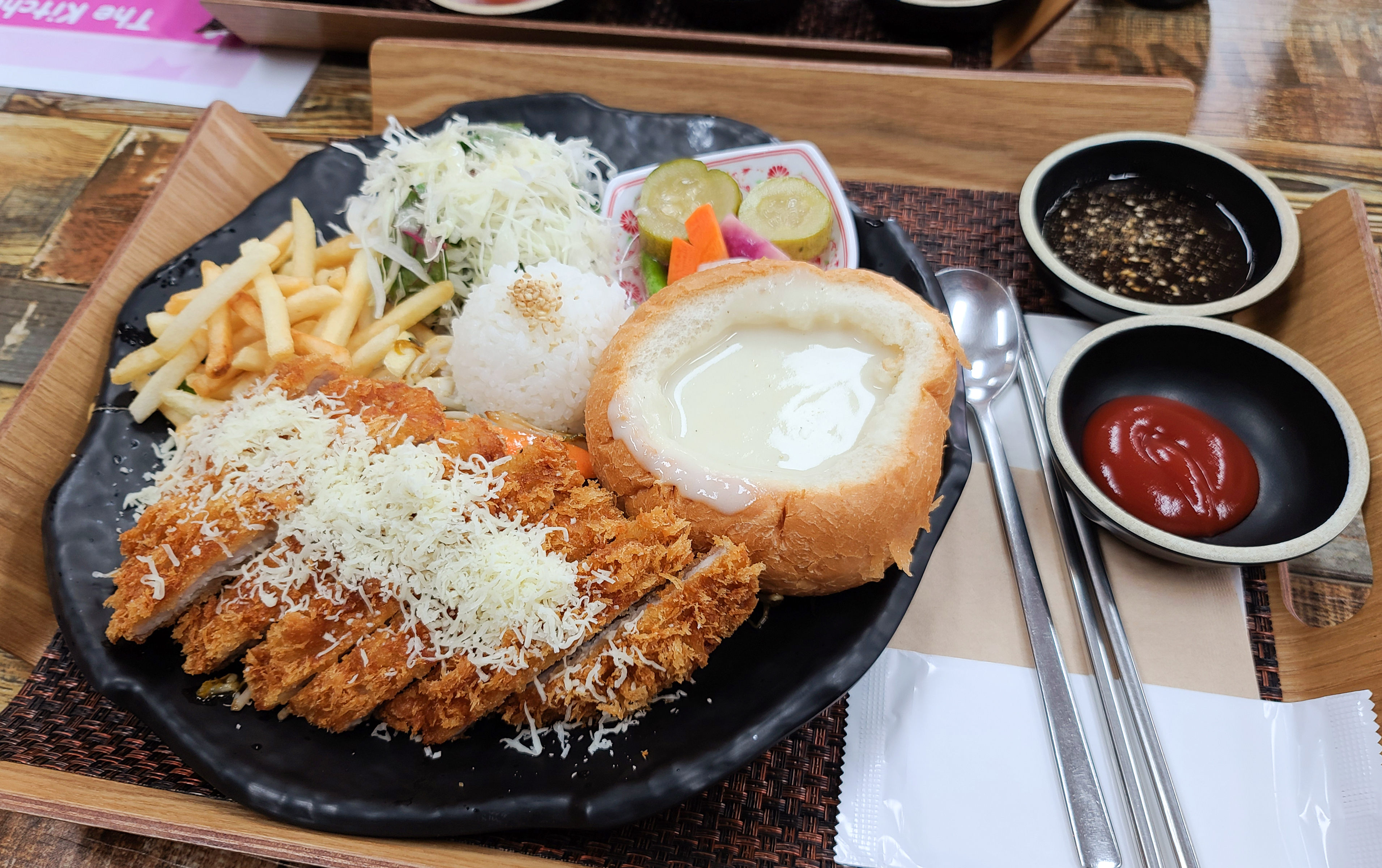 강화 <더키친H> 의 쌀국수와 동일하게 인기 있는 메뉴인 돈카츠정식은 바삭하게 잘 튀겨낸 돈까스와 감자튀김, 샐러드, 빠네스프 등이 제공되는 메뉴입니다. 이 메뉴는 어린이를 비롯해 성인까지 두루 만족시키는 메뉴로 메뉴를 주문하면 구성도 다양하고 양도 푸짐해서 인기있는 메뉴입니다.
