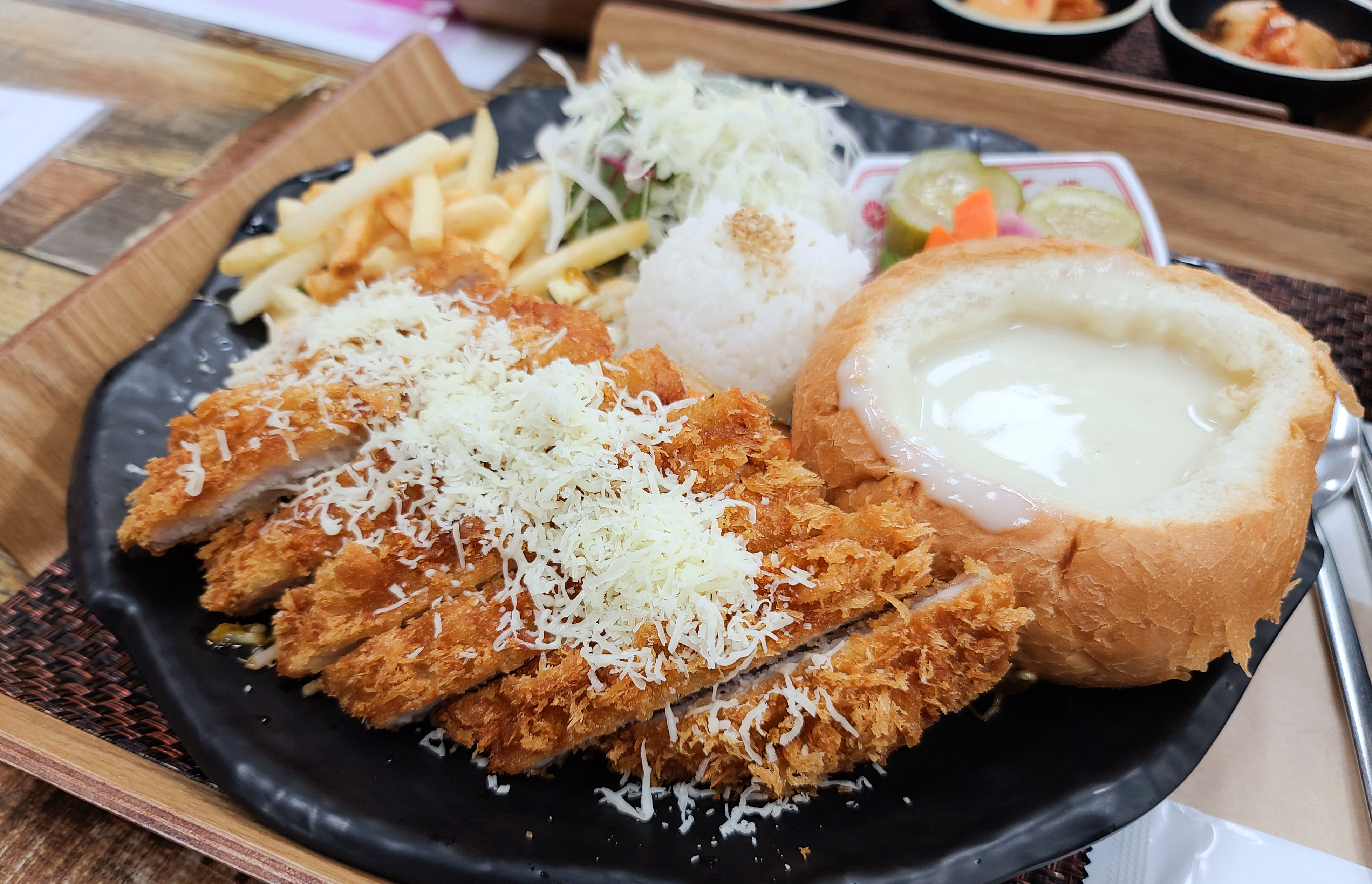 강화 <더키친H> 의 쌀국수와 동일하게 인기 있는 메뉴인 돈카츠정식은 바삭하게 잘 튀겨낸 돈까스와 감자튀김, 샐러드, 빠네스프 등이 제공되는 메뉴입니다. 이 메뉴는 어린이를 비롯해 성인까지 두루 만족시키는 메뉴로 메뉴를 주문하면 구성도 다양하고 양도 푸짐해서 인기있는 메뉴입니다.